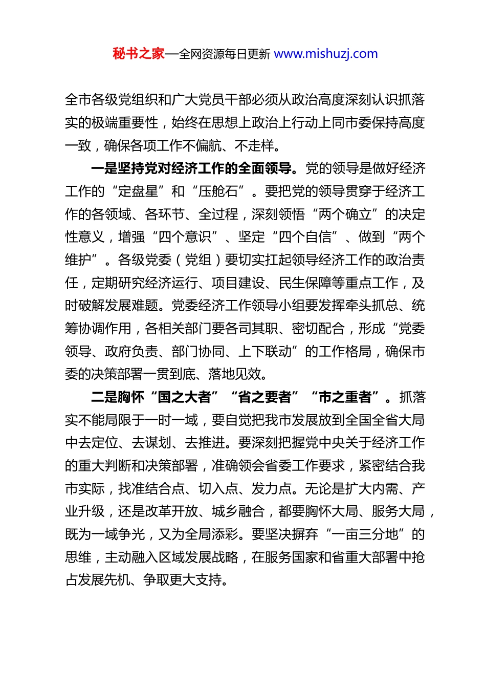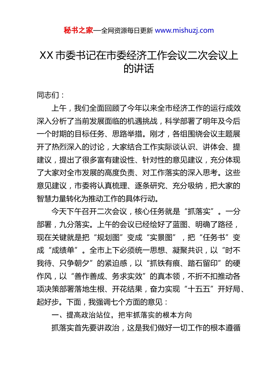 秘书之家—全网资源每日更新 www.mishuzj.comXX 市委书记在市委经济工作会议二次会议上的讲话同志们:上午,我们全面回顾了今年以来全市经济工作的运行成效深入分析了当前发展面临的机遇挑战,科学部署了明年及今后一个时期的目标任务、思路举措。刚才,各组围绕会议主题展开了热烈深入的讨论,大家结合工作实际谈认识、讲体会、提建议,提出了很多富有建设性、针对性的意见建议,充分体现了大家对全市发展的高度负责、对工作落实的深入思考。这些意见建议,市委将认真梳理、逐条研究、充分吸纳,把大家的智慧力量转化为推动工作的具体行动。今天下午召开二次会议,核心任务就是“抓落实”。一分部署,九分落实。上午的会议已经绘好了蓝图、明确了路径,现在关键就是把“规划图”变成“实景图”,把“任务书”变成“成绩单”。全市上下必须统一思想、凝聚共识,以“时不我待、只争朝夕”的紧迫感,以“抓铁有痕、踏石留印”的硬作风,以“善作善成、务求实效”的真本领,不折不扣推动各项决策部署落地生根、开花结果,奋力实现“十五五”开好局、起好步。下面,我强调七个方面的意见:一、提高政治站位,把牢抓落实的根本方向抓落实首先要讲政治,这是我们做好一切工作的根本遵循秘书之家—全网资源每日更新 www.mishuzj.com全市各级党组织和广大党员干部必须从政治高度深刻认识抓落实的极端重要性,始终在思想上政治上行动上同市委保持高度一致,确保各项工作不偏航、不走样。一是坚持党对经济工作的全面领导。党的领导是做好经济工作的“定盘星”和“压舱石”。要把党的领导贯穿于经济工作的各领域、各环节、全过程,深刻领悟“两个确立”的决定性意义,增强“四个意识”、坚定“四个自信”、做到“两个维护”。各级党委(党组)要切实扛起领导经济工作的政治责任,定期研究经济运行、项目建设、民生保障等重点工作,及时破解发展难题。党委经济工作领导小组要发挥牵头抓总、统筹协调作用,各相关部门要各司其职、密切配合,形成“党委领导、政府负责、部门协同、上下联动”的工作格局,确保市委的决策部署一贯到底、落地见效。二是胸怀“国之大者”“省之要者”“市之重者”。抓落实不能局限于一时一域,要自觉把我市发展放到全国全省大局中去定位、去谋划、去推进。要深刻把握党中央关于经济工作的重大判断和决策部署,准确领会省委工作要求,紧密结合我市实际,找准结合点、切入点、发力点。无论是扩大内需、产业升级,还是改革开放、城乡融合,都要胸怀大局、服务大局,既为一域争光,又为全局添彩。要坚决摒弃“一亩三分地”的思维,主动融入区域发展战略,在服务国家和省重大部署中抢占发展先机、争取更大支持。秘书之家—全网资源每日更新 www.mishuzj.com三是强化“时时放心不下”的责任担当。当前,我市经济发展正处在爬坡过坎、争先进位的关键时期,机遇与挑战并存,动力与压力同在。我们必须增强危机意识和紧迫感,摒弃“等靠要”思想和“躺平”心态,主动担当、积极作为。各级领导干部要带头扛起责任,既要当好“指挥员”,科学谋划、统筹协调;更要当好“战斗员”,深入一线、攻坚克难。要把分管领域、分管行业的工作放在心上、抓在手上,对重点任务亲自部署、亲自过问、亲自协调、亲自督办,确保事事有人管、件件有着落。二、树立正确政绩观,夯实抓落实的思想根基政绩观是世界观、人生观和价值观的具体体现,是抓落实的思想“总开关”。只有树立正确的政绩观,才能确保落实工作不偏向、不走样,真正创造出经得起历史、实践和人民检验的业绩。一是坚持“为人民出政绩”的价值取向。江山就是人民,人民就是江山。我们抓经济工作、推动发展,最终目的是为了让人民群众过上更好的日子。各级干部要始终把人民放在心中最高位置,把群众满意不满意、高兴不高兴、答应不答应作为衡量工作成效的根本标准。在落实各项工作时,要多站在群众的角度想问题、作决策、办事情,着力解决群众急难愁盼问题。比如,在推进项目建设时,要充分考虑群众利益,妥善解决征地拆迁、环境影响等问题;在发展产业时,要注重带动就业增秘书之家—全网资源每日更新 www.mishuzj.com收,让群...