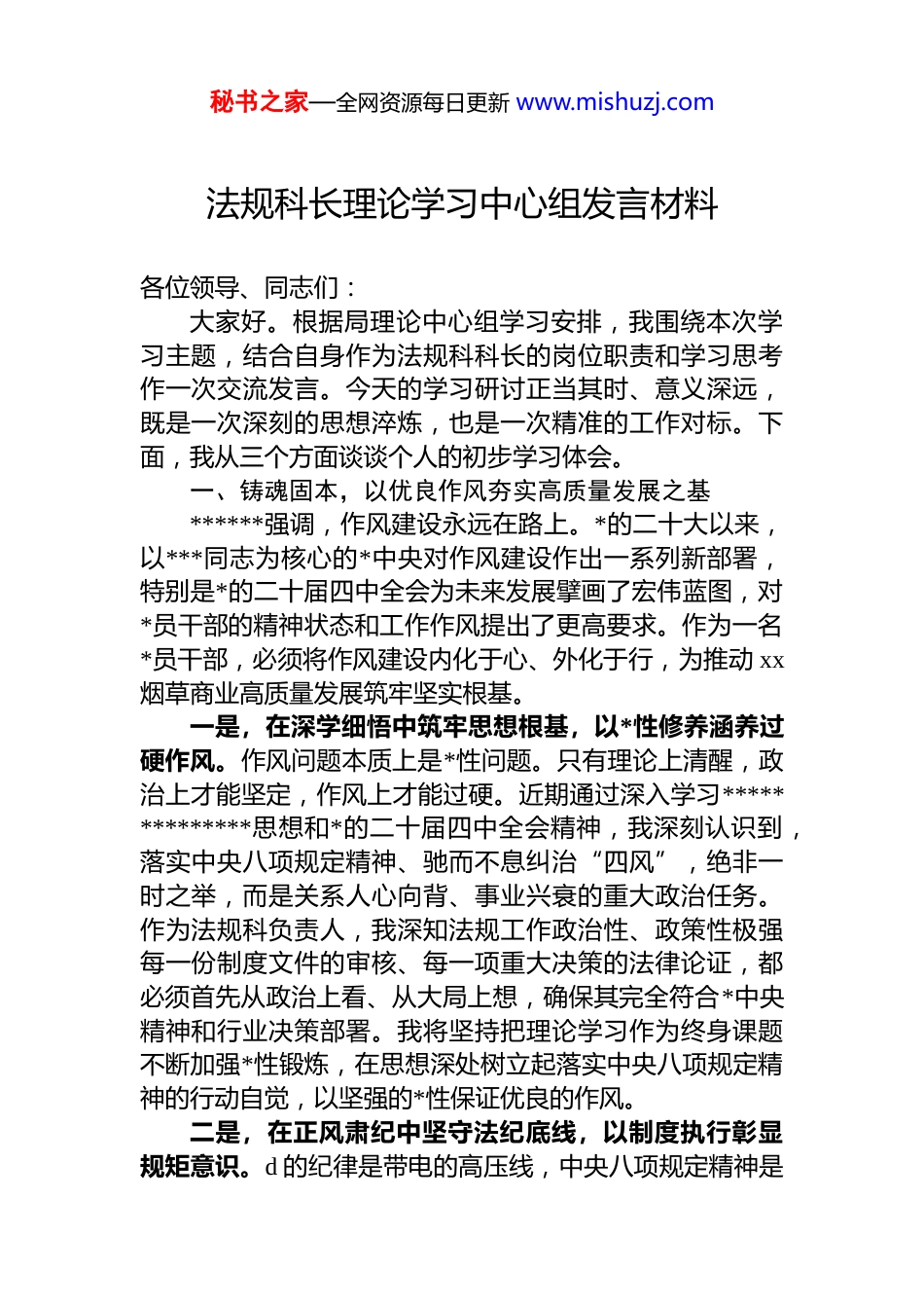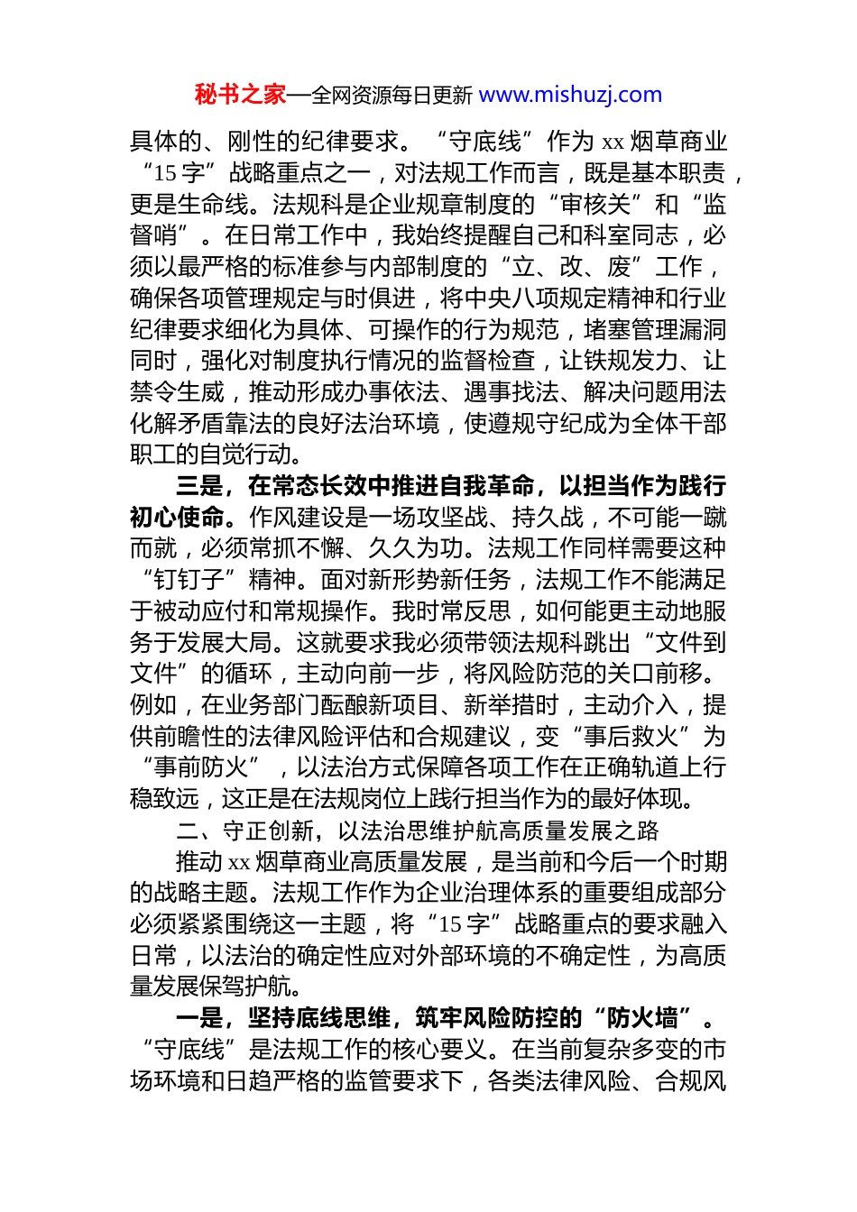 秘书之家—全网资源每日更新 www.mishuzj.com法规科长理论学习中心组发言材料各位领导、同志们:大家好。根据局理论中心组学习安排,我围绕本次学习主题,结合自身作为法规科科长的岗位职责和学习思考作一次交流发言。今天的学习研讨正当其时、意义深远,既是一次深刻的思想淬炼,也是一次精准的工作对标。下面,我从三个方面谈谈个人的初步学习体会。一、铸魂固本,以优良作风夯实高质量发展之基******强调,作风建设永远在路上。*的二十大以来,以***同志为核心的*中央对作风建设作出一系列新部署,特别是*的二十届四中全会为未来发展擘画了宏伟蓝图,对*员干部的精神状态和工作作风提出了更高要求。作为一名*员干部,必须将作风建设内化于心、外化于行,为推动 xx烟草商业高质量发展筑牢坚实根基。一是,在深学细悟中筑牢思想根基,以*性修养涵养过硬作风。作风问题本质上是*性问题。只有理论上清醒,政治上才能坚定,作风上才能过硬。近期通过深入学习**************思想和*的二十届四中全会精神,我深刻认识到,落实中央八项规定精神、驰而不息纠治“四风”,绝非一时之举,而是关系人心向背、事业兴衰的重大政治任务。作为法规科负责人,我深知法规工作政治性、政策性极强每一份制度文件的审核、每一项重大决策的法律论证,都必须首先从政治上看、从大局上想,确保其完全符合*中央精神和行业决策部署。我将坚持把理论学习作为终身课题不断加强*性锻炼,在思想深处树立起落实中央八项规定精神的行动自觉,以坚强的*性保证优良的作风。二是,在正风肃纪中坚守法纪底线,以制度执行彰显规矩意识。d 的纪律是带电的高压线,中央八项规定精神是秘书之家—全网资源每日更新 www.mishuzj.com具体的、刚性的纪律要求。“守底线”作为 xx 烟草商业“15 字”战略重点之一,对法规工作而言,既是基本职责,更是生命线。法规科是企业规章制度的“审核关”和“监督哨”。在日常工作中,我始终提醒自己和科室同志,必须以最严格的标准参与内部制度的“立、改、废”工作,确保各项管理规定与时俱进,将中央八项规定精神和行业纪律要求细化为具体、可操作的行为规范,堵塞管理漏洞同时,强化对制度执行情况的监督检查,让铁规发力、让禁令生威,推动形成办事依法、遇事找法、解决问题用法化解矛盾靠法的良好法治环境,使遵规守纪成为全体干部职工的自觉行动。三是,在常态长效中推进自我革命,以担当作为践行初心使命。作风建设是一场攻坚战、持久战,不可能一蹴而就,必须常抓不懈、久久为功。法规工作同样需要这种“钉钉子”精神。面对新形势新任务,法规工作不能满足于被动应付和常规操作。我时常反思,如何能更主动地服务于发展大局。这就要求我必须带领法规科跳出“文件到文件”的循环,主动向前一步,将风险防范的关口前移。例如,在业务部门酝酿新项目、新举措时,主动介入,提供前瞻性的法律风险评估和合规建议,变“事后救火”为“事前防火”,以法治方式保障各项工作在正确轨道上行稳致远,这正是在法规岗位上践行担当作为的最好体现。二、守正创新,以法治思维护航高质量发展之路推动 xx 烟草商业高质量发展,是当前和今后一个时期的战略主题。法规工作作为企业治理体系的重要组成部分必须紧紧围绕这一主题,将“15 字”战略重点的要求融入日常,以法治的确定性应对外部环境的不确定性,为高质量发展保驾护航。一是,坚持底线思维,筑牢风险防控的“防火墙”。“守底线”是法规工作的核心要义。在当前复杂多变的市场环境和日趋严格的监管要求下,各类法律风险、合规风秘书之家—全网资源每日更新 www.mishuzj.com险、经营风险交织叠加。我的首要职责就是运用法治思维和法治方式,协助局*组有效防范和化解这些风险。具体到工作中,无论是合同审查的每一个条款,还是规范性文件的字斟句酌,我都坚持从最坏处着眼,做最充分的准备,力求做到合法合规、权责清晰、风险可控。通过构建和完善覆盖事前、事中、事后的全流程法律风险防控体系,努力为企业健康发展筑起一道坚固的法治屏障。二是,拥抱管理创新,激活法治服务的“新动能”。“重创新”是高质量发展的强大引擎。对...