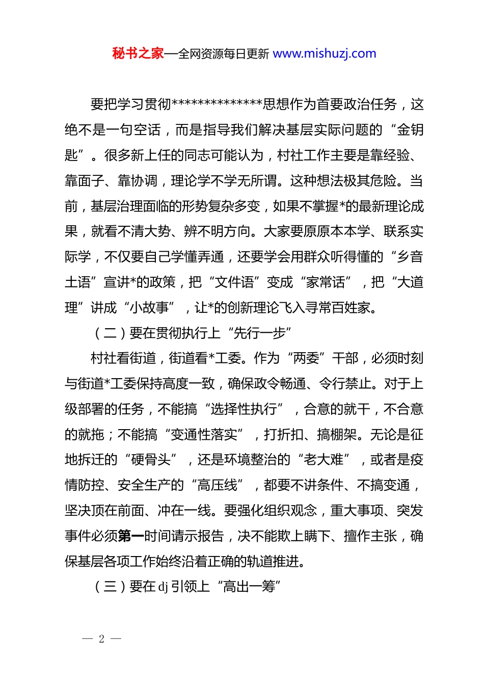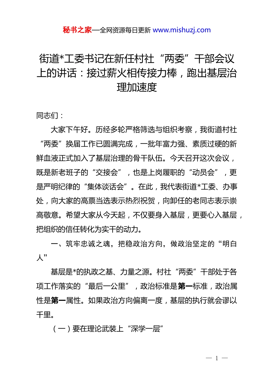 秘书之家—全网资源每日更新 www.mishuzj.com街道*工委书记在新任村社“两委”干部会议上的讲话:接过薪火相传接力棒,跑出基层治理加速度同志们:大家下午好。历经多轮严格筛选与组织考察,我街道村社“两委”换届工作已圆满完成,一批年富力强、素质过硬的新鲜血液正式加入了基层治理的骨干队伍。今天召开这次会议,既是新老班子的“交接会”,也是上岗履职的“动员会”,更是严明纪律的“集体谈话会”。在此,我代表街道*工委、办事处,向大家的高票当选表示热烈祝贺,向卸任的老同志表示崇高敬意。希望大家从今天起,不仅要身入基层,更要心入基层,把组织的信任转化为实干的动力。一、筑牢忠诚之魂,把稳政治方向,做政治坚定的“明白人”基层是*的执政之基、力量之源。村社“两委”干部处于各项工作落实的“最后一公里”,政治标准是第一标准,政治属性是第一属性。如果政治方向偏离一度,基层的执行就会谬以千里。(一)要在理论武装上“深学一层”— 1 —秘书之家—全网资源每日更新 www.mishuzj.com要把学习贯彻**************思想作为首要政治任务,这绝不是一句空话,而是指导我们解决基层实际问题的“金钥匙”。很多新上任的同志可能认为,村社工作主要是靠经验、靠面子、靠协调,理论学不学无所谓。这种想法极其危险。当前,基层治理面临的形势复杂多变,如果不掌握*的最新理论成果,就看不清大势、辨不明方向。大家要原原本本学、联系实际学,不仅要自己学懂弄通,还要学会用群众听得懂的“乡音土语”宣讲*的政策,把“文件语”变成“家常话”,把“大道理”讲成“小故事”,让*的创新理论飞入寻常百姓家。(二)要在贯彻执行上“先行一步”村社看街道,街道看*工委。作为“两委”干部,必须时刻与街道*工委保持高度一致,确保政令畅通、令行禁止。对于上级部署的任务,不能搞“选择性执行”,合意的就干,不合意的就拖;不能搞“变通性落实”,打折扣、搞棚架。无论是征地拆迁的“硬骨头”,还是环境整治的“老大难”,或者是疫情防控、安全生产的“高压线”,都要不讲条件、不搞变通,坚决顶在前面、冲在一线。要强化组织观念,重大事项、突发事件必须第一时间请示报告,决不能欺上瞒下、擅作主张,确保基层各项工作始终沿着正确的轨道推进。(三)要在 dj 引领上“高出一筹”— 2 —秘书之家—全网资源每日更新 www.mishuzj.com村社*组织是*在社会基层组织中的战斗堡垒,是*的全部工作和战斗力的基础。各位书记作为“班长”,必须牢固树立“抓好 dj 是本职、不抓 dj 是失职、抓不好 dj 是渎职”的理念。要严格落实“三会一课”、主题*日、组织生活会等制度,不能流于形式、走过场。要注重发挥*员的先锋模范作用,在网格化管理、志愿服务、纠纷调解中设立“*员示范岗”,让群众在关键时刻看得到身影、听得到声音。要着力整顿软弱涣散*组织,规范*务公开,增强*组织的凝聚力和号召力,真正把村社*组织建设成为宣传*的主张、贯彻*的决定、领导基层治理、团结动员群众、推动改革发展的坚强战斗堡垒。二、练就过硬之能,提升履职本领,做干事创业的“领头雁”新班子要有新气象,更要有新作为。面对群众日益增长的美好生活需要,面对基层治理现代化的新要求,大家必须要有“本领恐慌”的危机感,要把提升能力素质作为当务之急,尽快完成从“门外汉”到“行家里手”的转变。(一)要锤炼统筹发展的致富本领发展是解决一切问题的基础和关键。村级组织要千方百计壮大集体经济,不能总是“等靠要”,也不能总是守着“一亩三分地”过穷日子。要依托自身的资源禀赋,因地制宜探索发— 3 —秘书之家—全网资源每日更新 www.mishuzj.com展新路径。资源丰富的村要做好“山水文章”,盘活闲置土地、林地等资源,引入社会资本发展特色农业、乡村旅游;城郊结合部的村社要利用区位优势,发展物业经济、仓储物流;城市社区要探索“社区+社会组织+社工”的“三社联动”模式,引入便民服务业态,既方便群众又增加收入。大家要学会算经济账、长远账,不仅要让集体口袋“鼓起来”,更要带领群众脑袋“富起来”,增强造血功能,实现可持续发展。(二)要锤炼依法治理的...
