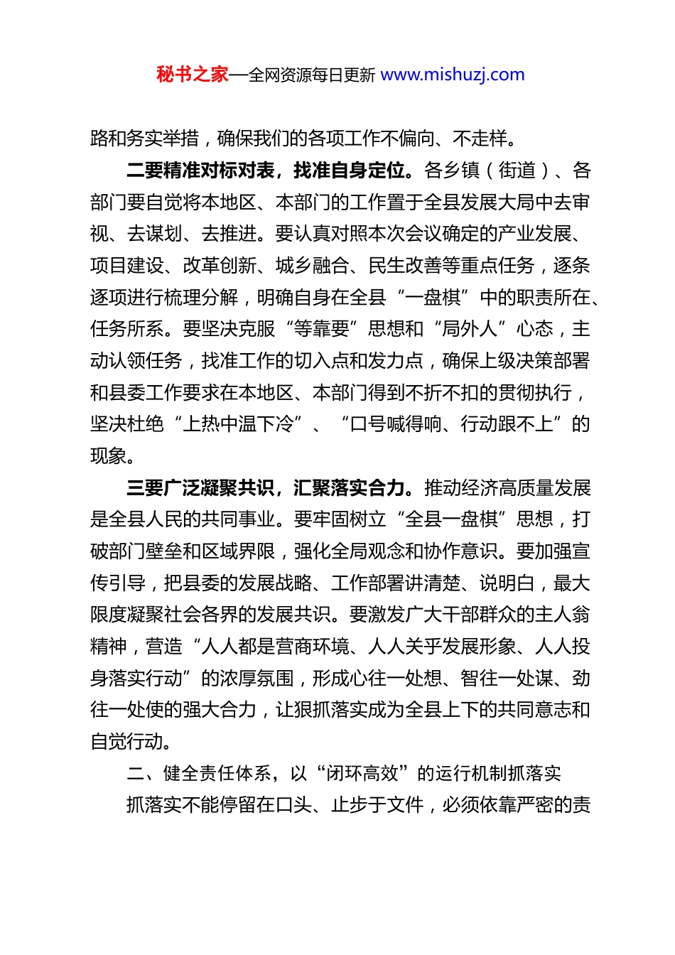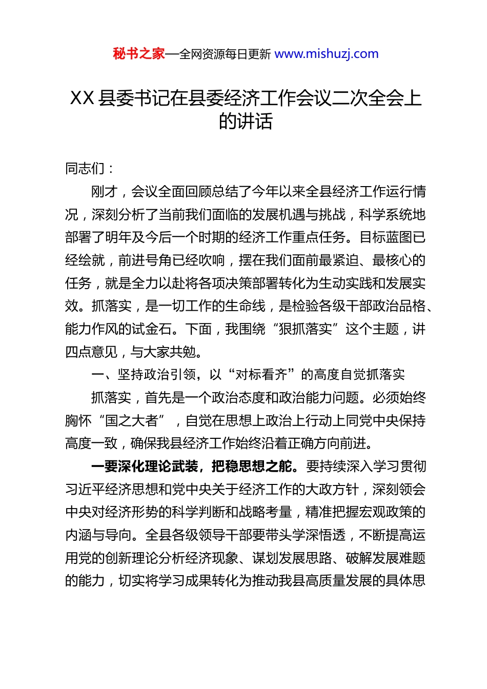 秘书之家—全网资源每日更新 www.mishuzj.comXX 县委书记在县委经济工作会议二次全会上的讲话同志们:刚才,会议全面回顾总结了今年以来全县经济工作运行情况,深刻分析了当前我们面临的发展机遇与挑战,科学系统地部署了明年及今后一个时期的经济工作重点任务。目标蓝图已经绘就,前进号角已经吹响,摆在我们面前最紧迫、最核心的任务,就是全力以赴将各项决策部署转化为生动实践和发展实效。抓落实,是一切工作的生命线,是检验各级干部政治品格、能力作风的试金石。下面,我围绕“狠抓落实”这个主题,讲四点意见,与大家共勉。一、坚持政治引领,以“对标看齐”的高度自觉抓落实抓落实,首先是一个政治态度和政治能力问题。必须始终胸怀“国之大者”,自觉在思想上政治上行动上同党中央保持高度一致,确保我县经济工作始终沿着正确方向前进。一要深化理论武装,把稳思想之舵。要持续深入学习贯彻习近平经济思想和党中央关于经济工作的大政方针,深刻领会中央对经济形势的科学判断和战略考量,精准把握宏观政策的内涵与导向。全县各级领导干部要带头学深悟透,不断提高运用党的创新理论分析经济现象、谋划发展思路、破解发展难题的能力,切实将学习成果转化为推动我县高质量发展的具体思秘书之家—全网资源每日更新 www.mishuzj.com路和务实举措,确保我们的各项工作不偏向、不走样。二要精准对标对表,找准自身定位。各乡镇(街道)、各部门要自觉将本地区、本部门的工作置于全县发展大局中去审视、去谋划、去推进。要认真对照本次会议确定的产业发展、项目建设、改革创新、城乡融合、民生改善等重点任务,逐条逐项进行梳理分解,明确自身在全县“一盘棋”中的职责所在、任务所系。要坚决克服“等靠要”思想和“局外人”心态,主动认领任务,找准工作的切入点和发力点,确保上级决策部署和县委工作要求在本地区、本部门得到不折不扣的贯彻执行,坚决杜绝“上热中温下冷”、“口号喊得响、行动跟不上”的现象。三要广泛凝聚共识,汇聚落实合力。推动经济高质量发展是全县人民的共同事业。要牢固树立“全县一盘棋”思想,打破部门壁垒和区域界限,强化全局观念和协作意识。要加强宣传引导,把县委的发展战略、工作部署讲清楚、说明白,最大限度凝聚社会各界的发展共识。要激发广大干部群众的主人翁精神,营造“人人都是营商环境、人人关乎发展形象、人人投身落实行动”的浓厚氛围,形成心往一处想、智往一处谋、劲往一处使的强大合力,让狠抓落实成为全县上下的共同意志和自觉行动。二、健全责任体系,以“闭环高效”的运行机制抓落实抓落实不能停留在口头、止步于文件,必须依靠严密的责秘书之家—全网资源每日更新 www.mishuzj.com任链条和科学的工作机制来保障,构建起“任务明确、责任清晰、督查有力、考核严格”的闭环管理体系。一要精准精细分解任务。会后,县委办、政府办要立即牵头,会同相关部门,迅速将会议确定的各项重点任务,特别是产业转型升级、重大项目建设、营商环境优化、乡村振兴推进、生态环境保护、安全稳定保障等方面的工作,细化为可操作、可量化、可考核的具体项目清单和工作台账。要明确每一项任务的责任领导、牵头单位、配合单位、完成标准和时限要求,推行“一个项目、一名领导、一个专班、一套方案、一抓到底”的“五个一”工作法,确保事有专管之人、人有明确之责、责有限定之期。二要压紧压实各级责任。县级领导干部要率先垂范,发挥“关键少数”的“头雁效应”,带头包联重点企业、牵头重大项目、化解突出矛盾,深入一线察实情、解难题、督进度。各乡镇(街道)要切实扛起属地主体责任,主要负责同志要履行好第一责任人职责,做到守土有责、守土负责、守土尽责。各职能部门要立足本职、主动作为,既要种好“责任田”,也要加强横向沟通协调,密切配合,打好“组合拳”,构建起“县级领导牵头抓总、乡镇部门各负其责、社会力量广泛参与”的立体化责任落实网络。三要强化全程跟踪问效。建立健全“常态化调度、动态化监测、精准化督查、刚性化考核”的工作推进机制。要实行秘书之家—全网资源每日更新 www.mishuzj.com“周调度、月通报、季分析...