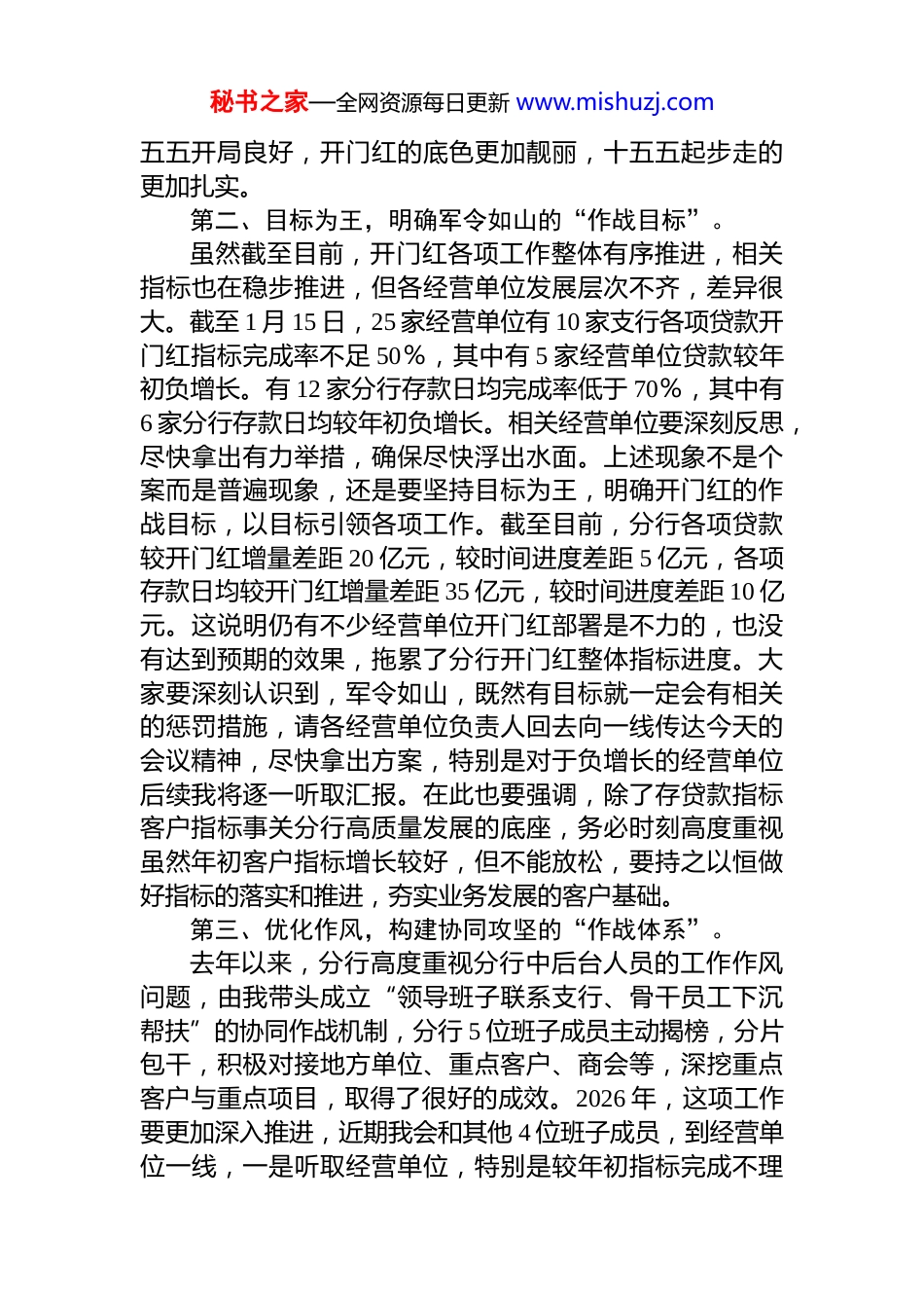 秘书之家—全网资源每日更新 www.mishuzj.com银行开门红专题推进会暨 2026 年 1 月经营分析会发言材料各位同志:大家好,今天召开 2026 年开门红专题推进会暨 1 月经营分析会议,主要是明确开门红的阶段性工作进展情况,进一步明确开门红旺季营销活动的重要性,确保顺利达到预期目标。刚刚,5 家经营单位做了表态发言,措施有了,关键是要尽快形成效果。下面,我结合会议主题,再强调以下 4 个方面,请做好落实推进。第一、接续奋斗,铺就闻令而动的“首战底色”。在刚刚过去的 2025 年,分行实现了来之不易的好成绩,可以说,十四五完美收官,分行各项贷款突破 600 亿元大关,年度预算完成率达到 110%,成为全行完成率全行第五。各项存款日均较年初新增 50 亿元,虽然较预算目标有差距,年度预算完成率 98%,但存款付息率较年初大幅度下降25bp,为全行营收增长奠定了坚实基础。营收、eva 均实现了同比 5%的增长,为大家今年的年终奖金奠定了坚实基础。十四五成绩离不开大家的努力,未来可期,但时间不等人还有一个月就是农历马年,春节假期一过就到了 3 月份,大家务必要发扬接续奋斗的精神,全力以赴开启开门红决战首季开门红的捷报,来源于我们的提早布局,早在 2025 年11 月份,我就多次强调要早谋划、早部署,现在看成效已经初步显现,截至 1 月 15 日,分行对公贷款增量已经接近去年的 40%,存款日均增量也突破了 25 亿元。说明我们前期的宣传推广、市场营销、考核激励和过程管理一系列工作是有力有效的。接下来,全行要继续按照年底收官和前 1个多月的工作模式,坚决打赢开门红后半程,全面实现十秘书之家—全网资源每日更新 www.mishuzj.com五五开局良好,开门红的底色更加靓丽,十五五起步走的更加扎实。第二、目标为王,明确军令如山的“作战目标”。虽然截至目前,开门红各项工作整体有序推进,相关指标也在稳步推进,但各经营单位发展层次不齐,差异很大。截至 1 月 15 日,25 家经营单位有 10 家支行各项贷款开门红指标完成率不足 50%,其中有 5 家经营单位贷款较年初负增长。有 12 家分行存款日均完成率低于 70%,其中有6 家分行存款日均较年初负增长。相关经营单位要深刻反思,尽快拿出有力举措,确保尽快浮出水面。上述现象不是个案而是普遍现象,还是要坚持目标为王,明确开门红的作战目标,以目标引领各项工作。截至目前,分行各项贷款较开门红增量差距 20 亿元,较时间进度差距 5 亿元,各项存款日均较开门红增量差距 35 亿元,较时间进度差距 10 亿元。这说明仍有不少经营单位开门红部署是不力的,也没有达到预期的效果,拖累了分行开门红整体指标进度。大家要深刻认识到,军令如山,既然有目标就一定会有相关的惩罚措施,请各经营单位负责人回去向一线传达今天的会议精神,尽快拿出方案,特别是对于负增长的经营单位后续我将逐一听取汇报。在此也要强调,除了存贷款指标客户指标事关分行高质量发展的底座,务必时刻高度重视虽然年初客户指标增长较好,但不能放松,要持之以恒做好指标的落实和推进,夯实业务发展的客户基础。第三、优化作风,构建协同攻坚的“作战体系”。去年以来,分行高度重视分行中后台人员的工作作风问题,由我带头成立“领导班子联系支行、骨干员工下沉帮扶”的协同作战机制,分行 5 位班子成员主动揭榜,分片包干,积极对接地方单位、重点客户、商会等,深挖重点客户与重点项目,取得了很好的成效。2026 年,这项工作要更加深入推进,近期我会和其他 4 位班子成员,到经营单位一线,一是听取经营单位,特别是较年初指标完成不理秘书之家—全网资源每日更新 www.mishuzj.com想的,甚至是负增长的经营单位专题会诊,就目前存在的问题逐一分析,形成报告报行班会研讨,看看到底是客观原因还是经营单位自身的部署不力问题。当然,更重要的工作是要给经营单位赋能,与支行行长、副行长一起拜访客户,营销客户,推进项目。对于分行的骨干人员,特别是相关产品经理、授信人员要下沉一线,以客户、项目为导向,与客户经理一起跑客户、跑项目。季度结束后,分行将对表现...