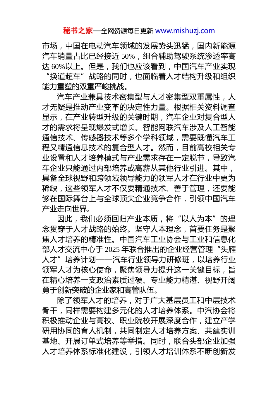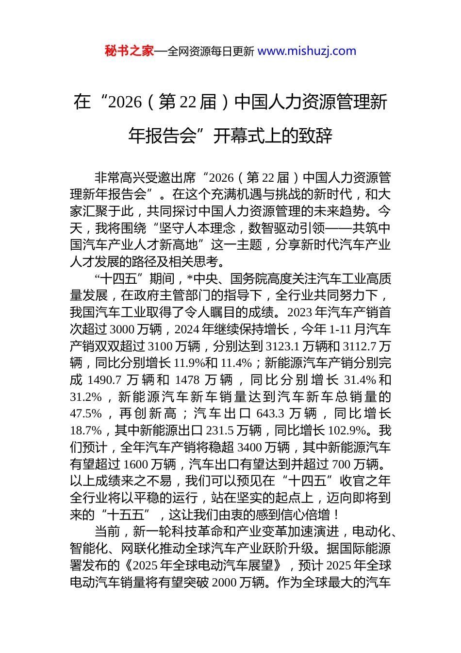 秘书之家—全网资源每日更新 www.mishuzj.com在“2026(第 22 届)中国人力资源管理新年报告会”开幕式上的致辞非常高兴受邀出席“2026(第 22 届)中国人力资源管理新年报告会”。在这个充满机遇与挑战的新时代,和大家汇聚于此,共同探讨中国人力资源管理的未来趋势。今天,我将围绕“坚守人本理念,数智驱动引领——共筑中国汽车产业人才新高地”这一主题,分享新时代汽车产业人才发展的路径及相关思考。“十四五”期间,*中央、国务院高度关注汽车工业高质量发展,在政府主管部门的指导下,全行业共同努力下,我国汽车工业取得了令人瞩目的成绩。2023 年汽车产销首次超过 3000 万辆,2024 年继续保持增长,今年 1-11 月汽车产销双双超过 3100 万辆,分别达到 3123.1 万辆和 3112.7 万辆,同比分别增长 11.9%和 11.4%;新能源汽车产销分别完成 1490.7 万 辆 和 1478 万 辆 , 同 比 分 别 增 长 31.4% 和31.2% , 新 能 源 汽 车 新 车 销 量 达 到 汽 车 新 车 总 销 量 的47.5% , 再 创 新 高 ; 汽 车 出 口 643.3 万 辆 , 同 比 增 长18.7%,其中新能源出口 231.5 万辆,同比增长 102.9%。我们预计,全年汽车产销将稳超 3400 万辆,其中新能源汽车有望超过 1600 万辆,汽车出口有望达到并超过 700 万辆。以上成绩来之不易,我们可以预见在“十四五”收官之年全行业将以平稳的运行,站在坚实的起点上,迈向即将到来的“十五五”,这让我们由衷的感到信心倍增!当前,新一轮科技革命和产业变革加速演进,电动化、智能化、网联化推动全球汽车产业跃阶升级。据国际能源署发布的《2025 年全球电动汽车展望》,预计 2025 年全球电动汽车销量将有望突破 2000 万辆。作为全球最大的汽车秘书之家—全网资源每日更新 www.mishuzj.com市场,中国在电动汽车领域的发展势头迅猛,国内新能源汽车销量占比已经接近 50%,组合辅助驾驶系统渗透率高达 60%以上。但是,我们也应该看到,中国汽车产业实现“换道超车”战略的同时,也面临着人才结构升级和组织能力重塑的双重严峻挑战。汽车产业兼具技术密集型与人才密集型双重属性,人才无疑是推动产业变革的决定性力量。根据相关资料调查显示,在产业转型升级的关键时期,汽车企业对复合型人才的需求将呈现爆发式增长。智能网联汽车涉及人工智能通信技术、传感器技术等多个学科领域,需要既懂汽车工程又精通信息技术的复合型人才。然而,目前高校相关专业设置和人才培养模式与产业需求存在一定脱节,导致汽车企业只能通过内部培养或高薪从其他行业引进。其中,具备全球视野和跨领域领导能力的领军人才在行业中更为稀缺,这些领军人才不仅要精通技术、善于管理,还要能够在国际舞台上与全球顶尖企业竞争合作,引领中国汽车产业走向世界。因此,我们必须回归产业本质,将“以人为本”的理念贯穿于人才战略的始终。坚守人本理念,首要任务是聚焦人才培养的精准性。中国汽车工业协会与工业和信息化部人才交流中心于 2025 年联合推出的企业经营管理“头雁人才”培养计划——汽车行业领导力研修班,以培养行业领军人才为核心使命,聚焦领导力提升这一关键目标,旨在精心培养一支政治素质过硬、专业能力精湛、视野开阔勇于创新突破的企业家和高管队伍。除了领军人才的培养,对于广大基层员工和中层技术骨干,同样需要构建多元化的人才培养体系。中汽协会将积极推动企业与高校、职业院校开展深度合作,建立产学研用协同的育人机制,共同制定人才培养方案、共建实训基地、开展订单式培养等举措。同时,联合头部企业加强人才培养体系标准化建设,引领人才培训体系不断创新发秘书之家—全网资源每日更新 www.mishuzj.com展和完善。此外,为更有效应对当前汽车企业人才供需失衡的突出挑战,我们正积极推动就业服务平台的构建与完善,此举旨在通过系统化的资源整合与信息共享,切实提升企业用人的灵活性与效率,最大限度地满足各类企业对多样化、专业化人才的迫切需求,从而为行业健康稳定发展提供坚实的人才支撑。各位同仁,*的二十届四中全会通过了“十五...