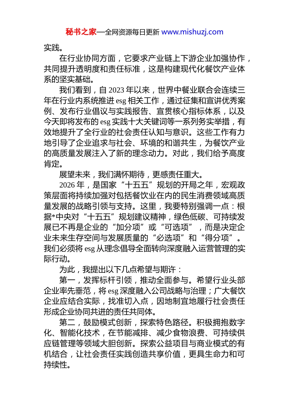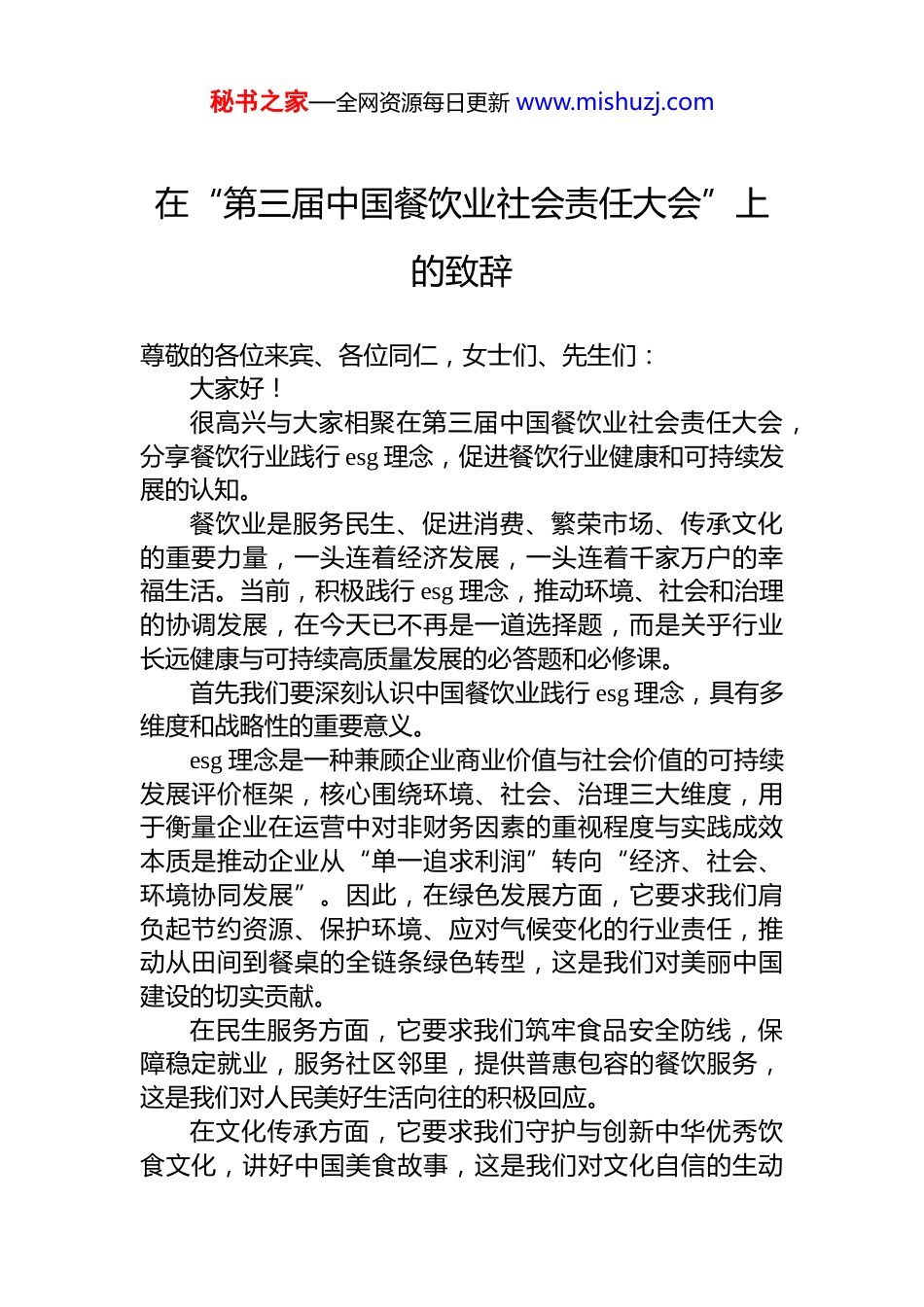 秘书之家—全网资源每日更新 www.mishuzj.com在“第三届中国餐饮业社会责任大会”上的致辞尊敬的各位来宾、各位同仁,女士们、先生们:大家好!很高兴与大家相聚在第三届中国餐饮业社会责任大会,分享餐饮行业践行 esg 理念,促进餐饮行业健康和可持续发展的认知。餐饮业是服务民生、促进消费、繁荣市场、传承文化的重要力量,一头连着经济发展,一头连着千家万户的幸福生活。当前,积极践行 esg 理念,推动环境、社会和治理的协调发展,在今天已不再是一道选择题,而是关乎行业长远健康与可持续高质量发展的必答题和必修课。首先我们要深刻认识中国餐饮业践行 esg 理念,具有多维度和战略性的重要意义。esg 理念是一种兼顾企业商业价值与社会价值的可持续发展评价框架,核心围绕环境、社会、治理三大维度,用于衡量企业在运营中对非财务因素的重视程度与实践成效本质是推动企业从“单一追求利润”转向“经济、社会、环境协同发展”。因此,在绿色发展方面,它要求我们肩负起节约资源、保护环境、应对气候变化的行业责任,推动从田间到餐桌的全链条绿色转型,这是我们对美丽中国建设的切实贡献。在民生服务方面,它要求我们筑牢食品安全防线,保障稳定就业,服务社区邻里,提供普惠包容的餐饮服务,这是我们对人民美好生活向往的积极回应。在文化传承方面,它要求我们守护与创新中华优秀饮食文化,讲好中国美食故事,这是我们对文化自信的生动秘书之家—全网资源每日更新 www.mishuzj.com实践。在行业协同方面,它要求产业链上下游企业加强协作,共同提升透明度和责任标准,这是构建现代化餐饮产业体系的坚实基础。我们看到,自 2023 年以来,世界中餐业联合会连续三年在行业内系统推进 esg 相关工作,通过征集和宣讲优秀案例、发布行业倡议与实践报告、宣贯核心指标体系,以及今天即将发布的 esg 实践十大关键词等一系列务实举措,有效地提升了全行业的社会责任认知与意识。这些工作有力地引导了企业追求与社会、环境的和谐共生,为餐饮产业的高质量发展注入了新的理念动力。对此,我们给予高度肯定。展望未来,我们满怀期待,更感责任重大。2026 年,是国家“十五五”规划的开局之年,宏观政策层面将持续加强对包括餐饮业在内的民生消费领域高质量发展的战略引领与支持。这里,我要特别强调一点:根据*中央对“十五五”规划建议精神,绿色低碳、可持续发展已不再是企业的“加分项”或“可选项”,而是决定企业未来生存空间与发展质量的“必选项”和“得分项”。我们必须将 esg 从理念倡导全面转向深度融入运营管理的实际行动。为此,我提出以下几点希望与期许:第一,发挥标杆引领,推动全面参与。希望行业头部企业率先垂范,将 esg 深度融入公司战略与治理;广大餐饮企业应结合实际,找准切入点,因地制宜地履行社会责任形成企业协同共进的责任共同体。第二,鼓励模式创新,探索特色路径。积极拥抱数字化、智能化技术,在节能减排、减少食物浪费、可持续供应链管理等领域大胆创新。探索公益项目与商业模式的有机结合,让社会责任实践创造共享价值,更具生命力和可持续性。秘书之家—全网资源每日更新 www.mishuzj.com第三,构建协同生态,凝聚各方合力。呼吁政府部门加强政策引导与标准建设,行业组织发挥好桥梁纽带与服务平台作用,餐饮企业切实履行主体责任,广大消费者与社会各界积极参与监督和支持。共建一个政府引导、协会推动、企业主体、社会参与的责任餐饮生态圈。各位同仁,各位朋友!责任铸就品牌,担当引领发展。践行社会责任,追求可持续发展,是一项长期而系统的工程,使命光荣,任重道远。让我们以本届大会为新的起点,将共识转化为共为将愿景付诸于行动,携手并肩,务实前行,共同谱写中国餐饮业更加绿色、更负责任、更高质量、更具韧性的辉煌篇章!谢谢大家!