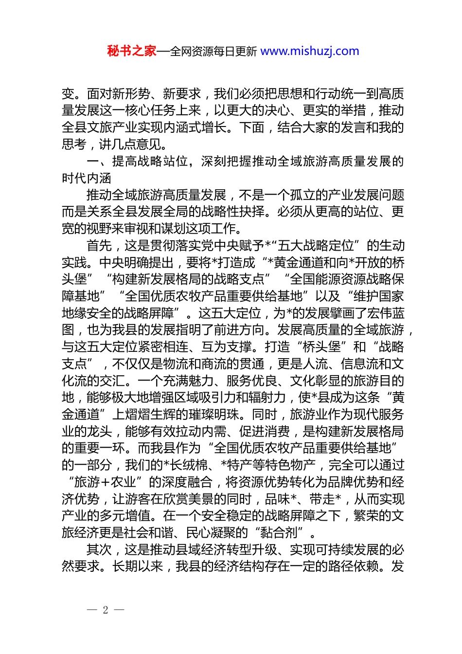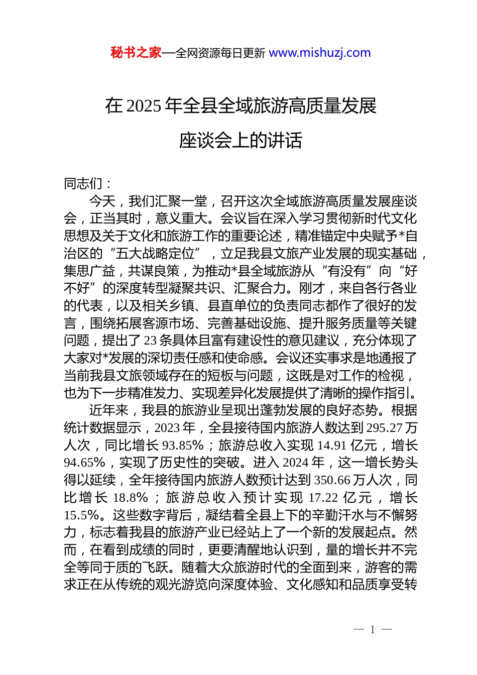 秘书之家—全网资源每日更新 www.mishuzj.com在 2025 年全县全域旅游高质量发展座谈会上的讲话同志们:今天,我们汇聚一堂,召开这次全域旅游高质量发展座谈会,正当其时,意义重大。会议旨在深入学习贯彻新时代文化思想及关于文化和旅游工作的重要论述,精准锚定中央赋予*自治区的“五大战略定位”,立足我县文旅产业发展的现实基础,集思广益,共谋良策,为推动*县全域旅游从“有没有”向“好不好”的深度转型凝聚共识、汇聚合力。刚才,来自各行各业的代表,以及相关乡镇、县直单位的负责同志都作了很好的发言,围绕拓展客源市场、完善基础设施、提升服务质量等关键问题,提出了 23 条具体且富有建设性的意见建议,充分体现了大家对*发展的深切责任感和使命感。会议还实事求是地通报了当前我县文旅领域存在的短板与问题,这既是对工作的检视,也为下一步精准发力、实现差异化发展提供了清晰的操作指引。近年来,我县的旅游业呈现出蓬勃发展的良好态势。根据统计数据显示,2023 年,全县接待国内旅游人数达到 295.27 万人次,同比增长 93.85%;旅游总收入实现 14.91 亿元,增长94.65%,实现了历史性的突破。进入 2024 年,这一增长势头得以延续,全年接待国内旅游人数预计达到 350.66 万人次,同比 增 长 18.8% ; 旅 游 总 收 入 预 计 实 现 17.22 亿 元 , 增 长15.5%。这些数字背后,凝结着全县上下的辛勤汗水与不懈努力,标志着我县的旅游产业已经站上了一个新的发展起点。然而,在看到成绩的同时,更要清醒地认识到,量的增长并不完全等同于质的飞跃。随着大众旅游时代的全面到来,游客的需求正在从传统的观光游览向深度体验、文化感知和品质享受转— 1 —秘书之家—全网资源每日更新 www.mishuzj.com变。面对新形势、新要求,我们必须把思想和行动统一到高质量发展这一核心任务上来,以更大的决心、更实的举措,推动全县文旅产业实现内涵式增长。下面,结合大家的发言和我的思考,讲几点意见。一、提高战略站位,深刻把握推动全域旅游高质量发展的时代内涵推动全域旅游高质量发展,不是一个孤立的产业发展问题而是关系全县发展全局的战略性抉择。必须从更高的站位、更宽的视野来审视和谋划这项工作。首先,这是贯彻落实党中央赋予*“五大战略定位”的生动实践。中央明确提出,要将*打造成“*黄金通道和向*开放的桥头堡”“构建新发展格局的战略支点”“全国能源资源战略保障基地”“全国优质农牧产品重要供给基地”以及“维护国家地缘安全的战略屏障”。这五大定位,为*的发展擘画了宏伟蓝图,也为我县的发展指明了前进方向。发展高质量的全域旅游,与这五大定位紧密相连、互为支撑。打造“桥头堡”和“战略支点”,不仅仅是物流和商流的贯通,更是人流、信息流和文化流的交汇。一个充满魅力、服务优良、文化彰显的旅游目的地,能够极大地增强区域吸引力和辐射力,使*县成为这条“黄金通道”上熠熠生辉的璀璨明珠。同时,旅游业作为现代服务业的龙头,能够有效拉动内需、促进消费,是构建新发展格局的重要一环。而我县作为“全国优质农牧产品重要供给基地”的一部分,我们的*长绒棉、*特产等特色物产,完全可以通过“旅游+农业”的深度融合,将资源优势转化为品牌优势和经济优势,让游客在欣赏美景的同时,品味*、带走*,从而实现产业的多元增值。在一个安全稳定的战略屏障之下,繁荣的文旅经济更是社会和谐、民心凝聚的“黏合剂”。其次,这是推动县域经济转型升级、实现可持续发展的必然要求。长期以来,我县的经济结构存在一定的路径依赖。发— 2 —秘书之家—全网资源每日更新 www.mishuzj.com展全域旅游,能够有效促进一二三产业的深度融合,催生新业态、新模式,为经济增长注入新的动能。旅游业具有“一业兴、百业旺”的强大带动效应,能够直接和间接带动住宿、餐饮、交通、零售、文创等多个行业的发展,创造大量就业岗位,特别是为城乡居民提供灵活多样的就业机会。更重要的是,高质量的旅游发展追求的是绿色发展、生态优先。它要求我们像爱护自己的眼睛一样爱护生态环境,将绿水青山、田园风光、大漠胡杨这些宝贵的生态...