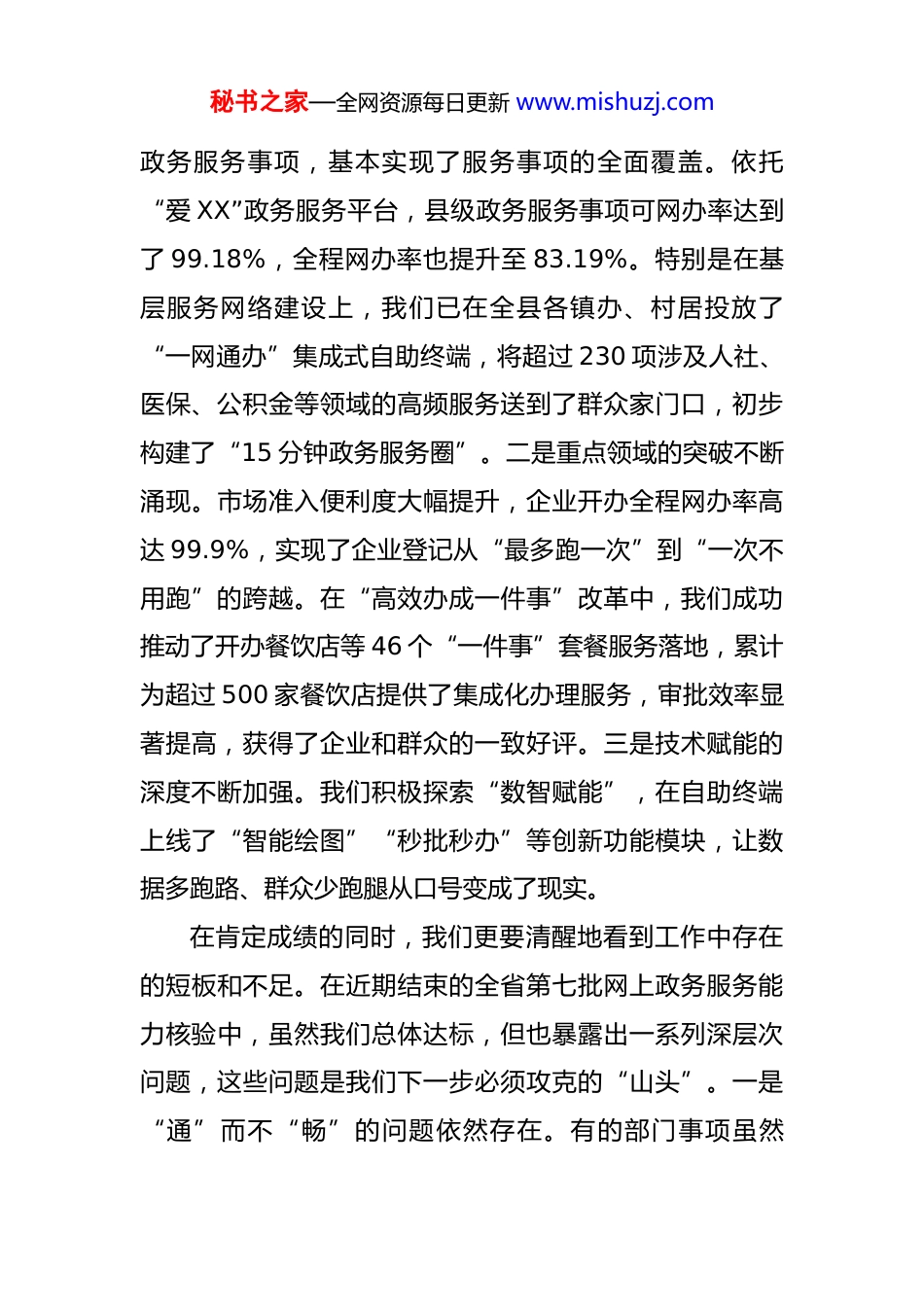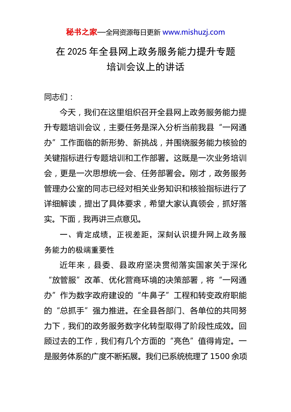 秘书之家—全网资源每日更新 www.mishuzj.com在 2025 年全县网上政务服务能力提升专题培训会议上的讲话 同志们:今天,我们在这里组织召开全县网上政务服务能力提升专题培训会议,主要任务是深入分析当前我县“一网通办”工作面临的新形势、新挑战,并围绕服务能力核验的关键指标进行专题培训和工作部署。这既是一次业务培训会,更是一次思想统一会、任务部署会。刚才,政务服务管理办公室的同志已经对相关业务知识和核验指标进行了详细解读,提出了具体要求,希望大家认真领会,抓好落实。下面,我再讲三点意见。一、肯定成绩,正视差距,深刻认识提升网上政务服务能力的极端重要性近年来,县委、县政府坚决贯彻落实国家关于深化“放管服”改革、优化营商环境的决策部署,将“一网通办”作为数字政府建设的“牛鼻子”工程和转变政府职能的“总抓手”强力推进。在全县各部门、各单位的共同努力下,我们的政务服务数字化转型取得了阶段性成效。回顾过去的工作,我们有几个方面的“亮色”值得肯定。一是服务体系的广度不断拓展。我们已系统梳理了 1500 余项秘书之家—全网资源每日更新 www.mishuzj.com政务服务事项,基本实现了服务事项的全面覆盖。依托“爱 XX”政务服务平台,县级政务服务事项可网办率达到了 99.18%,全程网办率也提升至 83.19%。特别是在基层服务网络建设上,我们已在全县各镇办、村居投放了“一网通办”集成式自助终端,将超过 230 项涉及人社、医保、公积金等领域的高频服务送到了群众家门口,初步构建了“15 分钟政务服务圈”。二是重点领域的突破不断涌现。市场准入便利度大幅提升,企业开办全程网办率高达 99.9%,实现了企业登记从“最多跑一次”到“一次不用跑”的跨越。在“高效办成一件事”改革中,我们成功推动了开办餐饮店等 46 个“一件事”套餐服务落地,累计为超过 500 家餐饮店提供了集成化办理服务,审批效率显著提高,获得了企业和群众的一致好评。三是技术赋能的深度不断加强。我们积极探索“数智赋能”,在自助终端上线了“智能绘图”“秒批秒办”等创新功能模块,让数据多跑路、群众少跑腿从口号变成了现实。在肯定成绩的同时,我们更要清醒地看到工作中存在的短板和不足。在近期结束的全省第七批网上政务服务能力核验中,虽然我们总体达标,但也暴露出一系列深层次问题,这些问题是我们下一步必须攻克的“山头”。一是“通”而不“畅”的问题依然存在。有的部门事项虽然秘书之家—全网资源每日更新 www.mishuzj.com“挂”在了网上,但办事指南要素不全、语焉不详,群众看不懂、不会办;有的事项办理流程线上线下“两张皮”,名为“全程网办”,实则还需要提交纸质材料,导致网上服务“中看不中用”。二是“办”而不“优”的问题比较突出。少数部门对网上办事的理解还停留在“收发室”阶段,线上申请,线下再审核,没有真正实现流程再造和系统对接。全程网办率 83.19%这个数字的背后,也意味着还有接近 17%的事项未能实现全流程在线办理,这恰恰是我们需要攻坚的“硬骨头”。三是“联”而不“通”的数据壁垒尚未完全打破。部门间系统不兼容、数据不共享的现象依然存在,导致“一件事”集成套餐服务“貌合神离”,群众和企业在一个主题下仍需面对多个系统、多次填报,办事体验感不佳。同志们,网上政务服务能力,是衡量一个地区营商环境和治理能力现代化水平的核心标尺。抓好这项工作,向上看,是落实上级决策部署、推动高质量发展的政治任务;向内看,是深化改革、转变政府职能的内在要求;向外看,是回应企业期盼、服务人民群众的民心工程。我们必须站在全局和战略的高度,进一步增强责任感、使命感和紧迫感,以刀刃向内的勇气和自我革命的精神,全力推动我县网上政务服务能力再上新台阶。秘书之家—全网资源每日更新 www.mishuzj.com二、聚焦关键,精准发力,全面掀起网上政务服务能力攻坚新高潮这次培训的核心,就是对标先进、查找不足、明确方向。各部门、各单位要以此次培训为契机,对照核验指标体系,逐项分析研判,拿出切实可行的提升方案。具体来说,要在以下三个方面实现新突破。第一,要在“应上尽上、全程网...