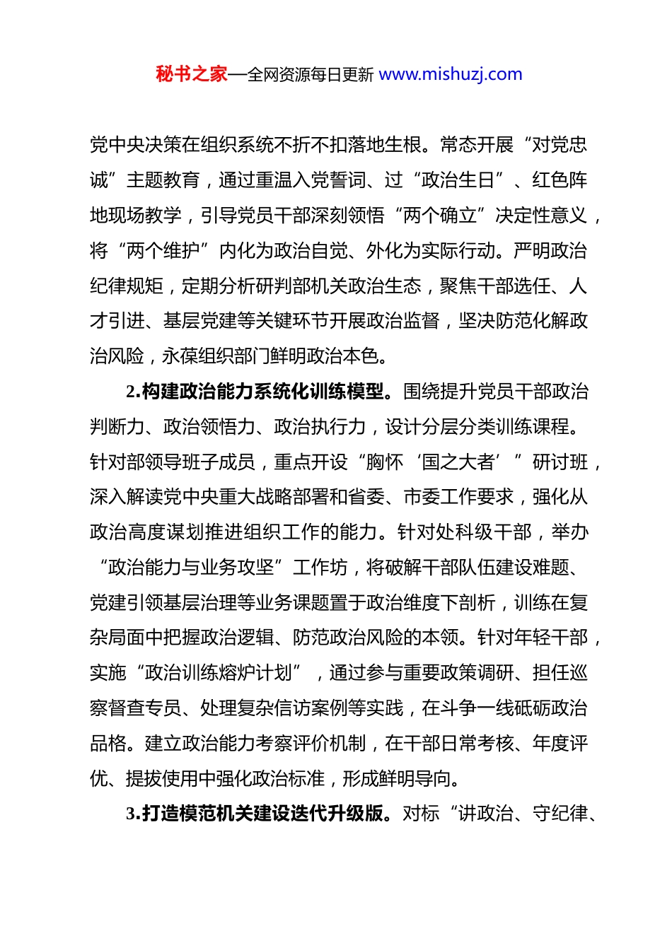 秘书之家—全网资源每日更新 www.mishuzj.com2026 年市委组织部机关党的建设工作要点 为深入贯彻落实习近平总书记关于党的建设的重要思想、关于组织工作的重要指示精神,以及党的二十届四中全会、二十届中央纪委五次全会决策部署,巩固拓展主题教育成果,以更高标准、更实举措推动部机关党的建设高质量发展,为服务保障全市中心工作、奋力实现“十五五”良好开局提供坚强政治和组织保证,结合市委组织部职能定位与实际,制定本工作要点。一、构建绝对忠诚的政治领航体系,坚实践行“两个维护”第一方阵紧扣组织部门政治机关根本属性,将旗帜鲜明讲政治贯穿工作全程,持续强化政治铸魂、政治担当、政治能力,确保组织路线始终服务政治路线。1.健全政治机关意识强化机制。深化“第一议题”制度,构建“即时学习+专题研讨+对标落实”闭环,将习近平总书记最新重要讲话、重要指示批示精神,特别是关于本地区、本领域、本部门工作的重要要求,作为部务会、中心组学习、支部会议的必学内容和决策根本依据。建立政治要件落实督办清单,实施“挂号、跟踪、销号”全流程管理,确保总书记号令、秘书之家—全网资源每日更新 www.mishuzj.com党中央决策在组织系统不折不扣落地生根。常态开展“对党忠诚”主题教育,通过重温入党誓词、过“政治生日”、红色阵地现场教学,引导党员干部深刻领悟“两个确立”决定性意义,将“两个维护”内化为政治自觉、外化为实际行动。严明政治纪律规矩,定期分析研判部机关政治生态,聚焦干部选任、人才引进、基层党建等关键环节开展政治监督,坚决防范化解政治风险,永葆组织部门鲜明政治本色。2.构建政治能力系统化训练模型。围绕提升党员干部政治判断力、政治领悟力、政治执行力,设计分层分类训练课程。针对部领导班子成员,重点开设“胸怀‘国之大者’”研讨班,深入解读党中央重大战略部署和省委、市委工作要求,强化从政治高度谋划推进组织工作的能力。针对处科级干部,举办“政治能力与业务攻坚”工作坊,将破解干部队伍建设难题、党建引领基层治理等业务课题置于政治维度下剖析,训练在复杂局面中把握政治逻辑、防范政治风险的本领。针对年轻干部,实施“政治训练熔炉计划”,通过参与重要政策调研、担任巡察督查专员、处理复杂信访案例等实践,在斗争一线砥砺政治品格。建立政治能力考察评价机制,在干部日常考核、年度评优、提拔使用中强化政治标准,形成鲜明导向。3.打造模范机关建设迭代升级版。对标“讲政治、守纪律、秘书之家—全网资源每日更新 www.mishuzj.com负责任、有效率”要求,制定部机关深化模范机关建设年度实施方案。开展“模范处室(支部)”季度评比,设置“政治功能强、落实效能高、作风形象优、群众评价好”等多维指标,营造比学赶超氛围。实施“开门建模范”行动,定期邀请服务对象、基层单位、“两代表一委员”走进部机关,听取意见建议,接受监督评议,将模范机关建设成效交由实践和群众检验。聚焦整治形式主义为基层减负,牵头优化各类督查检查考核、报表填报流程,带头精简会议文件,建立组织系统为基层减负正面清单与负面清单,切实减轻基层负担,争做真抓实干的表率。4.压实意识形态工作全链条责任。牢牢掌握组织领域意识形态工作领导权,严格落实主管主办责任。加强部属网站、刊物、微信公众号等阵地建设管理,健全信息发布“三审三校”制度,确保导向正确、内容安全。围绕干部思想动态、人才政治引领、党员教育管理等领域,每季度开展意识形态风险排查与分析研判,及时发现处置苗头性倾向性问题。将意识形态工作要求融入干部教育培训、领导班子民主生活会、党组织书记述职评议考核,强化各级领导干部的政治担当。组建部机关网评员队伍,针对涉及组织工作的网络舆情,主动发声、权威解读、澄清谬误,营造清朗网络空间。秘书之家—全网资源每日更新 www.mishuzj.com二、构建入脑入心的铸魂育人体系,夯实笃信笃行的思想根基坚持把学懂弄通做实党的创新理论作为首要政治任务,推动理论学习往深里走、往实里走、往心里走,转化为推动组织工作高质量发展的强大动力。5.实施党的创新理论“精读深研”工程。以《习近平著...