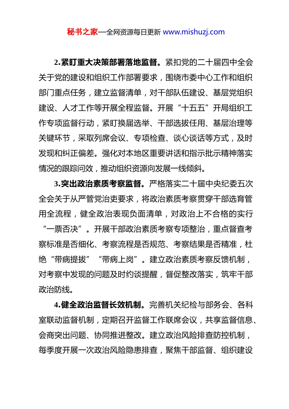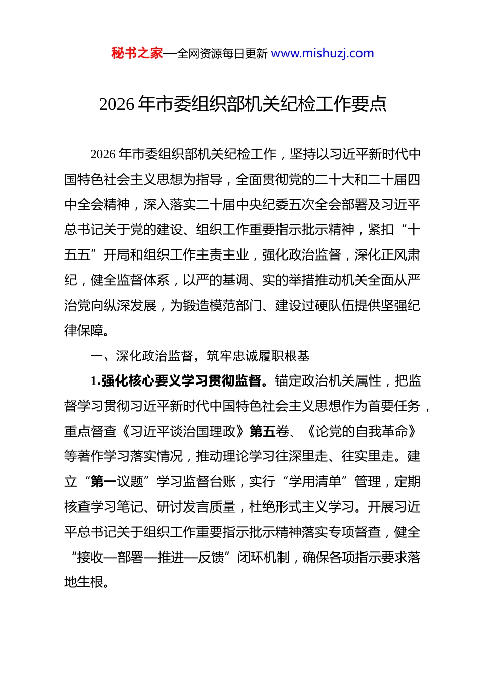 秘书之家—全网资源每日更新 www.mishuzj.com2026 年市委组织部机关纪检工作要点 2026 年市委组织部机关纪检工作,坚持以习近平新时代中国特色社会主义思想为指导,全面贯彻党的二十大和二十届四中全会精神,深入落实二十届中央纪委五次全会部署及习近平总书记关于党的建设、组织工作重要指示批示精神,紧扣“十五五”开局和组织工作主责主业,强化政治监督,深化正风肃纪,健全监督体系,以严的基调、实的举措推动机关全面从严治党向纵深发展,为锻造模范部门、建设过硬队伍提供坚强纪律保障。一、深化政治监督,筑牢忠诚履职根基1.强化核心要义学习贯彻监督。锚定政治机关属性,把监督学习贯彻习近平新时代中国特色社会主义思想作为首要任务,重点督查《习近平谈治国理政》第五卷、《论党的自我革命》等著作学习落实情况,推动理论学习往深里走、往实里走。建立“第一议题”学习监督台账,实行“学用清单”管理,定期核查学习笔记、研讨发言质量,杜绝形式主义学习。开展习近平总书记关于组织工作重要指示批示精神落实专项督查,健全“接收—部署—推进—反馈”闭环机制,确保各项指示要求落地生根。秘书之家—全网资源每日更新 www.mishuzj.com2.紧盯重大决策部署落地监督。紧扣党的二十届四中全会关于党的建设和组织工作部署要求,围绕市委中心工作和组织部门重点任务,建立监督清单,对干部队伍建设、基层党组织建设、人才工作等开展全程监督。开展“十五五”开局组织工作专项监督行动,紧盯换届选举、干部选拔任用、基层治理等关键环节,采取列席会议、专项检查、谈心谈话等方式,及时发现和纠正偏差。强化对本地区重要讲话和指示批示精神落实情况的跟踪问效,推动组织资源向发展一线倾斜。3.突出政治素质考察监督。严格落实二十届中央纪委五次全会关于从严管党治吏要求,将政治素质考察贯穿干部选育管用全流程,健全政治表现负面清单,对政治上不合格的实行“一票否决”。开展干部政治素质考察专项整治,重点督查考察标准是否细化、考察流程是否规范、考察结果是否精准,杜绝“带病提拔”“带病上岗”。建立政治素质考察反馈机制,对考察中发现的问题及时约谈提醒,督促整改落实,筑牢干部政治防线。4.健全政治监督长效机制。完善机关纪检与部务会、各科室联动监督机制,定期召开监督工作联席会议,共享监督信息、会商突出问题、协同推进整改。建立政治风险排查防控机制,每季度开展一次政治风险隐患排查,聚焦干部监督、组织建设秘书之家—全网资源每日更新 www.mishuzj.com等领域,梳理风险点,制定防控措施。创新政治监督方式,运用信息化手段搭建监督平台,实现监督数据实时更新、问题线索及时处置,提升政治监督精准性和实效性。二、聚焦主责主业,强化精准监督执纪5.严把干部选拔任用监督关口。严格执行《干部选拔任用工作监督检查和责任追究办法》,全程监督干部选拔任用各环节,重点核查资格条件、选拔程序、考察结果等,对违规选人用人问题严肃追责问责。推行干部选拔任用“纪检意见前置”机制,提前核查拟提拔重用干部廉洁情况,出具明确纪检意见。开展干部选拔任用专项巡查,每半年抽查一次干部选拔任用档案,及时发现和纠正程序不规范、材料不齐全等问题,维护选人用人公信力。6.强化干部日常管理监督。聚焦干部履职尽责、作风建设等情况,建立“日常监督+重点监督+专项监督”三位一体监督模式,对苗头性、倾向性问题早发现、早提醒、早纠正。落实谈心谈话制度,纪检干部每季度与各科室负责人、关键岗位干部开展一次廉政谈话,了解思想动态,压实廉洁责任。健全干部 8 小时外监督机制,畅通群众监督渠道,对干部社交圈、生活圈、朋友圈开展常态化监督,筑牢廉洁自律防线。7.深化基层党建领域监督。围绕习近平总书记关于基层党秘书之家—全网资源每日更新 www.mishuzj.com建重要论述,聚焦基层党组织政治功能和组织功能提升,开展基层党建专项监督。重点督查基层党组织换届选举、“三会一课”、主题党日等制度落实情况,整治基层党建弱化、虚化、边缘化问题。开展基层干部微腐败专项整治,紧盯惠民政策落实、资金使用等环节,严肃查处吃拿卡要、优亲厚...