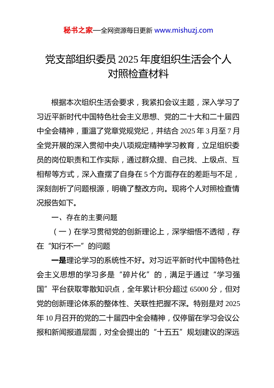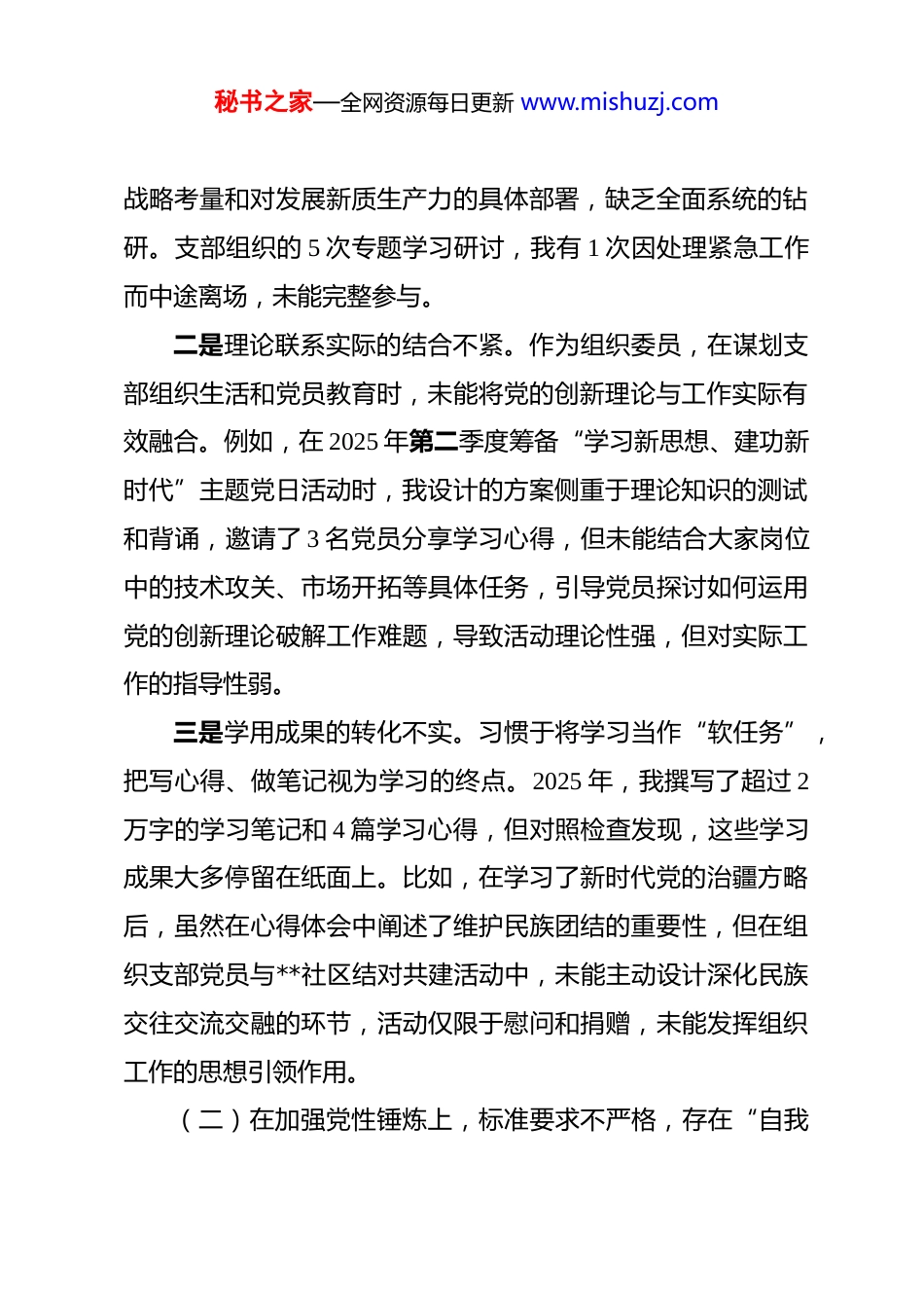 秘书之家—全网资源每日更新 www.mishuzj.com党支部组织委员 2025 年度组织生活会个人对照检查材料 根据本次组织生活会要求,我紧扣会议主题,深入学习了习近平新时代中国特色社会主义思想、党的二十大和二十届四中全会精神,重温了党章党规党纪,并结合 2025 年 3 月至 7 月全党开展的深入贯彻中央八项规定精神学习教育,立足组织委员的岗位职责和工作实际,通过群众提、自己找、上级点、互相帮等方式,深入查摆了自身在 5 个方面存在的差距与不足,深刻剖析了问题根源,明确了整改方向。现将个人对照检查情况报告如下。一、存在的主要问题(一)在学习贯彻党的创新理论上,深学细悟不透彻,存在“知行不一”的问题一是理论学习的系统性不好。对习近平新时代中国特色社会主义思想的学习多是“碎片化”的,满足于通过“学习强国”平台获取零散知识点,全年累计积分超过 65000 分,但对党的创新理论体系的整体性、关联性把握不深。特别是对 2025年 10 月召开的党的二十届四中全会精神,仅停留在学习会议公报和新闻报道层面,对全会提出的“十五五”规划建议的深远秘书之家—全网资源每日更新 www.mishuzj.com战略考量和对发展新质生产力的具体部署,缺乏全面系统的钻研。支部组织的 5 次专题学习研讨,我有 1 次因处理紧急工作而中途离场,未能完整参与。二是理论联系实际的结合不紧。作为组织委员,在谋划支部组织生活和党员教育时,未能将党的创新理论与工作实际有效融合。例如,在 2025 年第二季度筹备“学习新思想、建功新时代”主题党日活动时,我设计的方案侧重于理论知识的测试和背诵,邀请了 3 名党员分享学习心得,但未能结合大家岗位中的技术攻关、市场开拓等具体任务,引导党员探讨如何运用党的创新理论破解工作难题,导致活动理论性强,但对实际工作的指导性弱。三是学用成果的转化不实。习惯于将学习当作“软任务”,把写心得、做笔记视为学习的终点。2025 年,我撰写了超过 2万字的学习笔记和 4 篇学习心得,但对照检查发现,这些学习成果大多停留在纸面上。比如,在学习了新时代党的治疆方略后,虽然在心得体会中阐述了维护民族团结的重要性,但在组织支部党员与**社区结对共建活动中,未能主动设计深化民族交往交流交融的环节,活动仅限于慰问和捐赠,未能发挥组织工作的思想引领作用。(二)在加强党性锤炼上,标准要求不严格,存在“自我秘书之家—全网资源每日更新 www.mishuzj.com松懈”的问题一是政治修养的淬炼不深。存在“事务主义”倾向,认为作为组织委员,把发展党员、收缴党费、管理党员档案等具体工作做好就是讲政治。在日常工作中,过多地关注程序是否合规、材料是否齐全,而对党员的思想动态、政治表现的考察不够细致。2025 年,我与支部 32 名党员普遍谈心谈话仅 1 次,深度谈话不足 10 人,对个别党员出现的思想波动和情绪变化,未能第一时间察觉并予以引导,政治敏锐性和政治鉴别力不强。二是纪律规矩的敬畏不强。对党的纪律规矩,特别是政治纪律和政治规矩,存在“与己无关”的麻痹思想,认为自己作为基层党员干部,只要不贪不腐,就不会触碰红线。在实际工作中,有时会将工作纪律等同于政治纪律。去年 11 月,在一次讨论预备党员转正的支委会上,会议已明确要求保密,但我会后在与一位老党员闲聊时,无意中透露了讨论的细节和结果,虽然未造成严重后果,但反映出我严守纪律的弦绷得不紧。三是斗争精神的磨砺不坚。面对意识形态领域的复杂斗争,缺乏主动亮剑的勇气。作为组织委员,有责任引导党员坚定立场,但在面对网络上一些抹黑党的历史、质疑党的政策的错误言论时,我多数时候选择“一划而过”或“不看不听”,而不是理直气壮地予以批驳和澄清。2025 年全年,我仅在工作群中秘书之家—全网资源每日更新 www.mishuzj.com转发过 3 次正面宣传链接,主动撰写评论、引导舆论的次数为零,在维护党的形象和威信上,先锋模范作用发挥不彻底。(三)在联系服务职工群众上,宗旨意识不牢固,存在“高高在上”的问题一是深入基层的脚步不勤。习惯于坐在办公室通过电话、微信群了解情况、安排工作,与职工...