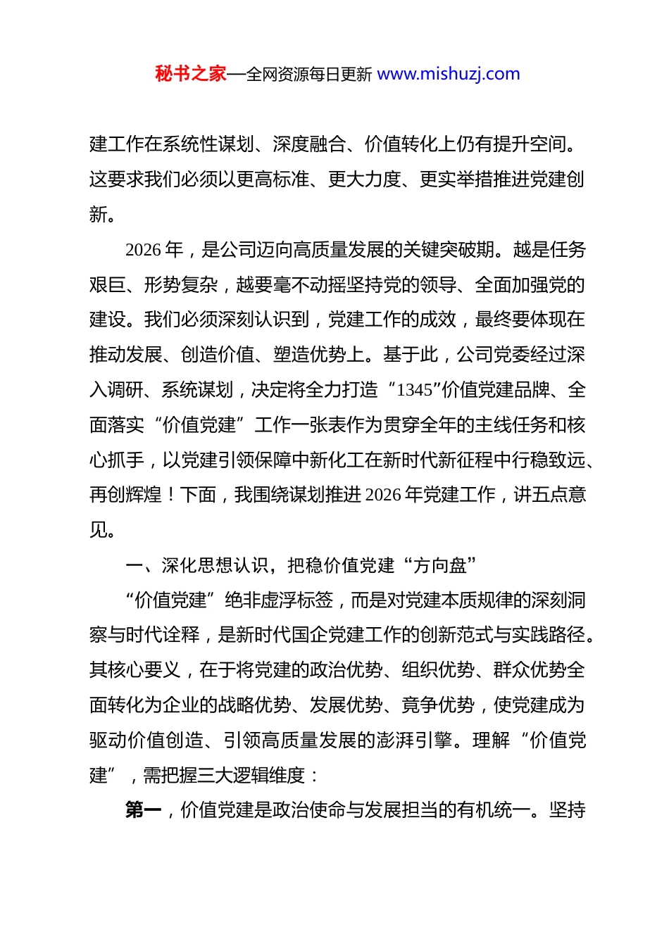 秘书之家—全网资源每日更新 www.mishuzj.com董事长在 2026 年度党建工作推进会上的讲话 同志们:今天,我们隆重召开年度党建工作推进会,以党的创新理论为指引,以新时代党的建设总要求为遵循,全面总结过去一年党建工作的实践成果,深刻分析新征程上面临的形势任务,系统部署 2026 年党建工作的战略重点。这是公司党委以更高政治站位凝聚思想共识、以更强使命担当推动战略落地、以更实工作举措开创发展新局的一次重要会议。在此,我代表公司党委,向奋战在各条战线的党员干部致以崇高的敬意和诚挚的问候!过去一年,我们坚持以习近平新时代中国特色社会主义思想为旗帜,深入贯彻落实党中央和集团公司党委的决策部署,在党的创新理论武装中铸魂固本,在融入生产经营实践中强基赋能,在应对风险挑战中彰显担当,推动党建工作在守正创新中实现新突破,为公司稳大局、应变局、开新局提供了坚强政治保证。这些成绩的取得,是全体党员干部凝心聚力、砥砺奋进的结果。但同时,我们也要清醒认识到,对照新时代党的建设总要求,对标“以质量效益为中心”的价值导向,回应新乡园区高质量发展的时代命题和职工群众的热切期盼,我们的党秘书之家—全网资源每日更新 www.mishuzj.com建工作在系统性谋划、深度融合、价值转化上仍有提升空间。这要求我们必须以更高标准、更大力度、更实举措推进党建创新。2026 年,是公司迈向高质量发展的关键突破期。越是任务艰巨、形势复杂,越要毫不动摇坚持党的领导、全面加强党的建设。我们必须深刻认识到,党建工作的成效,最终要体现在推动发展、创造价值、塑造优势上。基于此,公司党委经过深入调研、系统谋划,决定将全力打造“1345”价值党建品牌、全面落实“价值党建”工作一张表作为贯穿全年的主线任务和核心抓手,以党建引领保障中新化工在新时代新征程中行稳致远、再创辉煌!下面,我围绕谋划推进 2026 年党建工作,讲五点意见。一、深化思想认识,把稳价值党建“方向盘”“价值党建”绝非虚浮标签,而是对党建本质规律的深刻洞察与时代诠释,是新时代国企党建工作的创新范式与实践路径。其核心要义,在于将党建的政治优势、组织优势、群众优势全面转化为企业的战略优势、发展优势、竟争优势,使党建成为驱动价值创造、引领高质量发展的澎湃引擎。理解“价值党建”,需把握三大逻辑维度:第一,价值党建是政治使命与发展担当的有机统一。坚持秘书之家—全网资源每日更新 www.mishuzj.com党的领导、加强党的建设,是国有企业的“根”与“魂”,是必须扛稳的政治责任。企业作为经济组织,创造价值、保值增值是根本任务。“价值党建”正是政治属性与经济属性深度融合的实践载体,确保企业在正确航向上实现更高质量、更有效率、更可持续的发展,在服务国家战略、保障国计民生中体现国企担当。第二,价值党建是目标引领与问题导向的辩证统一。我们以“是否增强核心功能、提升核心竟争力,是否促进质量效益”为根本标尺,所有党建举措均聚焦这一目标靶向。同时,我们坚持问题导向,紧扣生产经营痛点、改革发展堵点、职工关切焦点精准发力,坚决摒弃形式主义,确保党建做实了就是生产力、做强了就是竟争力、做细了就是凝聚力,真正成为破解难题的金钥匙。第三,价值党建是系统谋划与精准施策的协同统一。它既需要顶层设计、整体推进,构建科学完备的党建体系;又需要靶向发力、精准落地,制定可操作、可量化、可考核的具体方案。为此,我们提出“1345”价值党建品牌与“一张表”工作法,前者是战略蓝图,后者是实施路径,二者相辅相成,共同构建起党建引领高质量发展的四梁八柱。二、聚焦品牌塑造,筑牢 1345 体系“压舱石”秘书之家—全网资源每日更新 www.mishuzj.com“1345”价值党建品牌是公司党委以高质量党建引领高质量发展的战略抓手,其核心内涵可凝练为:“1”是锚定一个核心目标:以高质量党建引领保障高质量发展。“3”是构建三大支撑体系:责任体系闭环压实、运行体系深度融合、考评体系刚性赋能。“4”是推进四大价值工程:培根铸魂强引领、固本强基筑堡垒、民生保障聚人心、清风提质优生态。“5”是发挥五大优势促融入:将党...