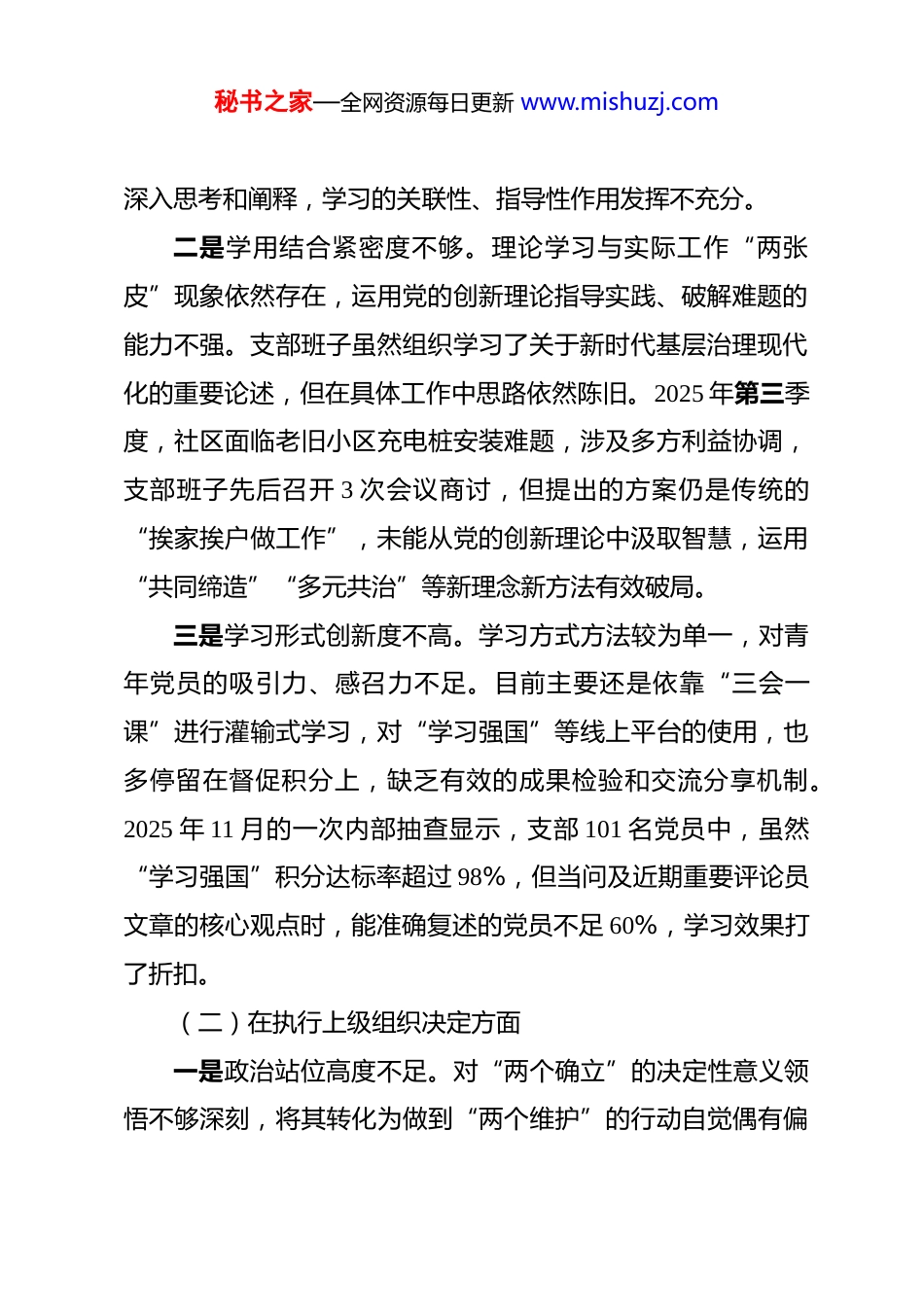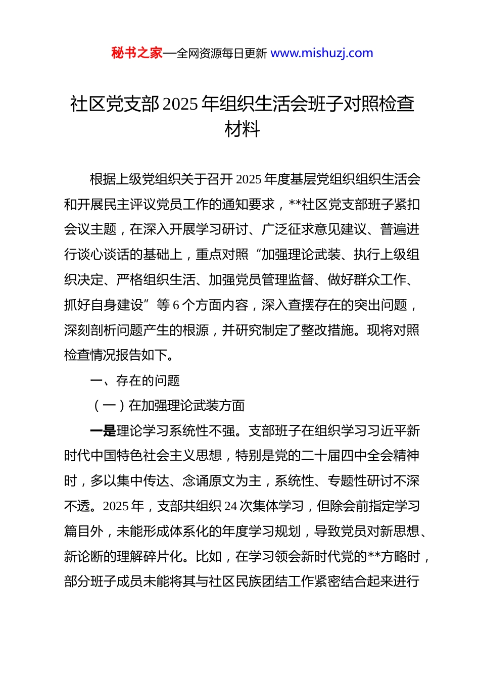 秘书之家—全网资源每日更新 www.mishuzj.com社区党支部 2025 年组织生活会班子对照检查材料 根据上级党组织关于召开 2025 年度基层党组织组织生活会和开展民主评议党员工作的通知要求,**社区党支部班子紧扣会议主题,在深入开展学习研讨、广泛征求意见建议、普遍进行谈心谈话的基础上,重点对照“加强理论武装、执行上级组织决定、严格组织生活、加强党员管理监督、做好群众工作、抓好自身建设”等 6 个方面内容,深入查摆存在的突出问题,深刻剖析问题产生的根源,并研究制定了整改措施。现将对照检查情况报告如下。一、存在的问题(一)在加强理论武装方面一是理论学习系统性不强。支部班子在组织学习习近平新时代中国特色社会主义思想,特别是党的二十届四中全会精神时,多以集中传达、念诵原文为主,系统性、专题性研讨不深不透。2025 年,支部共组织 24 次集体学习,但除会前指定学习篇目外,未能形成体系化的年度学习规划,导致党员对新思想、新论断的理解碎片化。比如,在学习领会新时代党的**方略时,部分班子成员未能将其与社区民族团结工作紧密结合起来进行秘书之家—全网资源每日更新 www.mishuzj.com深入思考和阐释,学习的关联性、指导性作用发挥不充分。二是学用结合紧密度不够。理论学习与实际工作“两张皮”现象依然存在,运用党的创新理论指导实践、破解难题的能力不强。支部班子虽然组织学习了关于新时代基层治理现代化的重要论述,但在具体工作中思路依然陈旧。2025 年第三季度,社区面临老旧小区充电桩安装难题,涉及多方利益协调,支部班子先后召开 3 次会议商讨,但提出的方案仍是传统的“挨家挨户做工作”,未能从党的创新理论中汲取智慧,运用“共同缔造”“多元共治”等新理念新方法有效破局。三是学习形式创新度不高。学习方式方法较为单一,对青年党员的吸引力、感召力不足。目前主要还是依靠“三会一课”进行灌输式学习,对“学习强国”等线上平台的使用,也多停留在督促积分上,缺乏有效的成果检验和交流分享机制。2025 年 11 月的一次内部抽查显示,支部 101 名党员中,虽然“学习强国”积分达标率超过 98%,但当问及近期重要评论员文章的核心观点时,能准确复述的党员不足 60%,学习效果打了折扣。(二)在执行上级组织决定方面一是政治站位高度不足。对“两个确立”的决定性意义领悟不够深刻,将其转化为做到“两个维护”的行动自觉偶有偏秘书之家—全网资源每日更新 www.mishuzj.com差。在执行上级决策部署时,有时会优先考虑本社区的局部利益和现实困难,导致在贯彻落实上打折扣、搞变通。二是大局意识强度不彰。在服务中心大局、发挥兵团“三大功能”“四大作用”等重大要求上,思考谋划不深入,未能将宏观战略要求完全转化为支部层面的具体行动方案。支部班子在制定年度工作计划时,更多聚焦于社区环境整治、邻里纠纷调解等日常事务,对于如何通过支部工作,在维护稳定、促进融合等方面贡献力量,缺乏前瞻性思考和系统性布局。2025年支部工作总结中,涉及服务全县发展大局的内容仅有 2 条,且较为笼统。三是报告制度刚度不严。在执行重大事项报告、重要工作请示制度上存在不及时、不规范的问题。有时认为某些工作属于社区内部事务,或自认为能够妥善处理,便简化了向上级党组织请示报告的程序。2025 年 7 月,社区一处共有产权房因产权划分问题引发了 10 余户居民的集体申诉,支部书记**同志在未向街道党工委正式报告的情况下,自行组织调解,虽然后续问题得到解决,但这种“先斩后奏”的做法,不符合组织原则和纪律要求。(三)在严格组织生活方面一是批评与自我批评辣味不足。组织生活会上的相互批评秘书之家—全网资源每日更新 www.mishuzj.com环节,存在“你好我好大家好”的现象,碍于情面,不愿点名道姓、揭短亮丑。在 2025 年上半年的专题组织生活会上,班子成员之间的相互批评意见共计 15 条,其中涉及具体工作问题的仅有 4 条,其余多为“希望加强理论学习”“建议多下基层”等宽泛化、程序性的建议,未能真正起到“红脸出汗、排毒治病”的效果,党内政治生活的熔炉作用发挥不充分。二是谈心...