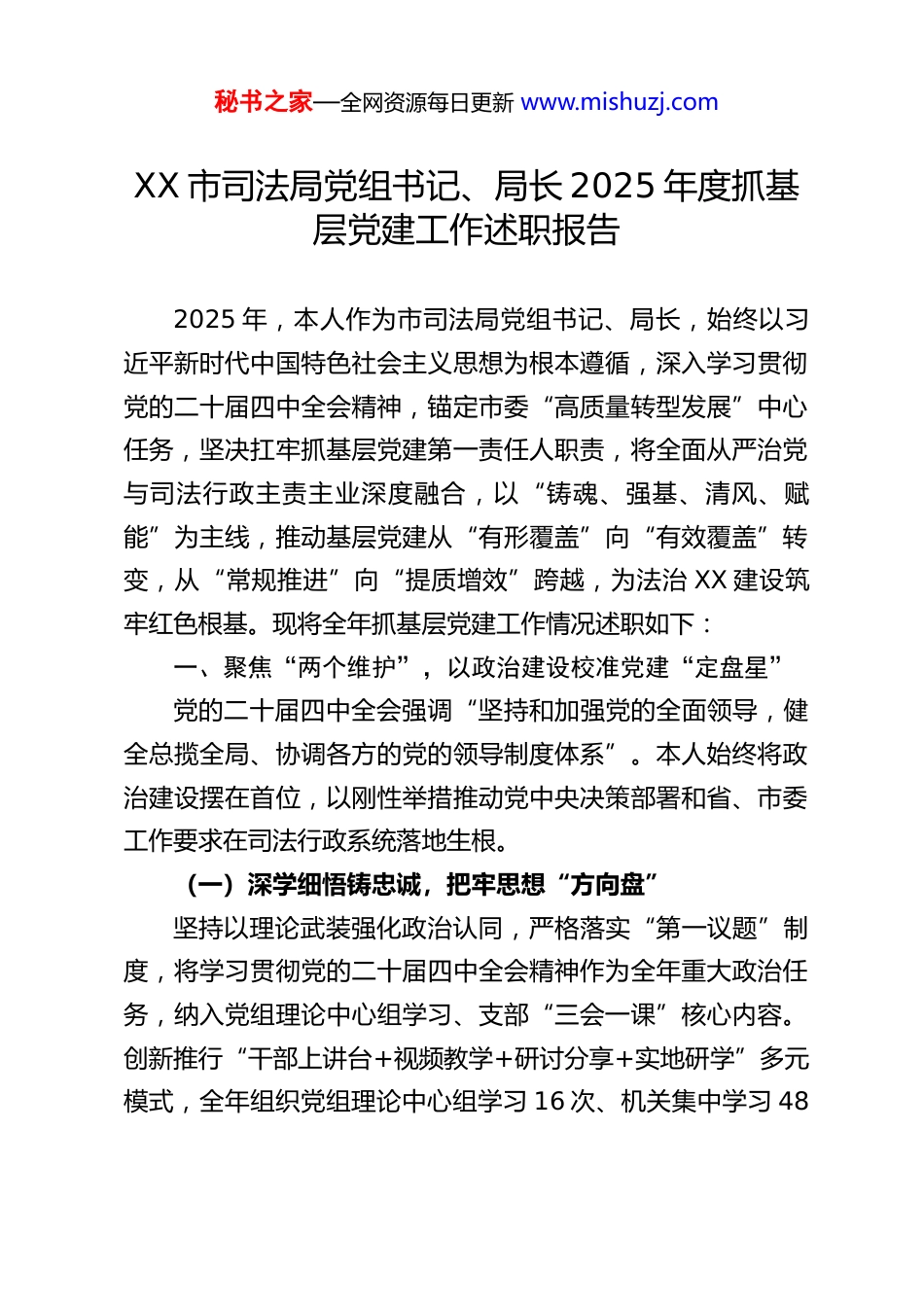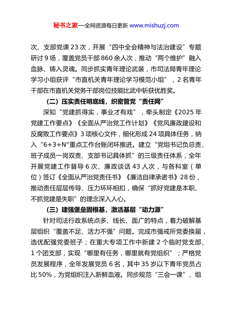 秘书之家—全网资源每日更新 www.mishuzj.comXX 市司法局党组书记、局长 2025 年度抓基层党建工作述职报告2025 年,本人作为市司法局党组书记、局长,始终以习近平新时代中国特色社会主义思想为根本遵循,深入学习贯彻党的二十届四中全会精神,锚定市委“高质量转型发展”中心任务,坚决扛牢抓基层党建第一责任人职责,将全面从严治党与司法行政主责主业深度融合,以“铸魂、强基、清风、赋能”为主线,推动基层党建从“有形覆盖”向“有效覆盖”转变,从“常规推进”向“提质增效”跨越,为法治 XX 建设筑牢红色根基。现将全年抓基层党建工作情况述职如下:一、聚焦“两个维护”,以政治建设校准党建“定盘星”党的二十届四中全会强调“坚持和加强党的全面领导,健全总揽全局、协调各方的党的领导制度体系”。本人始终将政治建设摆在首位,以刚性举措推动党中央决策部署和省、市委工作要求在司法行政系统落地生根。(一)深学细悟铸忠诚,把牢思想“方向盘”坚持以理论武装强化政治认同,严格落实“第一议题”制度,将学习贯彻党的二十届四中全会精神作为全年重大政治任务,纳入党组理论中心组学习、支部“三会一课”核心内容。创新推行“干部上讲台+视频教学+研讨分享+实地研学”多元模式,全年组织党组理论中心组学习 16 次、机关集中学习 48秘书之家—全网资源每日更新 www.mishuzj.com次、支部党课 23 次,开展“四中全会精神与法治建设”专题研讨 9 场,覆盖党员干部 860 余人次,推动“两个维护”融入血脉、铸入灵魂。同步抓实青年理论武装,市司法局青年理论学习小组获评“市直机关青年理论学习模范小组”,2 名青年干部在市直机关党务干部岗位技能比武中斩获优胜奖。(二)压实责任明底线,织密管党“责任网”深知“党建抓得实,事业才有戏”,牵头制定《2025 年党建工作要点》《全面从严治党工作计划》《党风廉政建设和反腐败工作要点》3 项核心文件,细化形成 24 项具体任务,纳入“6+3+N”重点工作台账闭环推进。建立“党组书记负总责、班子成员一岗双责、支部书记具体抓”的三级责任体系,全年开展党建工作督导 6 次、廉政谈话 43 人次,与各科室(单位)签订《全面从严治党责任书》《廉洁自律承诺书》28 份,推动责任层层传导、压力环环相扣,确保“抓好党建是本职、不抓党建是失职”的理念深入人心。(三)建强堡垒固根基,激活基层“动力源”针对司法行政系统点多、线长、面广的特点,着力破解基层组织“覆盖不足、活力不强”问题。完成市强戒所党委换届,选优配强党委班子;在重大专项工作中新建 2 个临时党支部、1 个团支部,实现“哪里有任务,哪里就有党组织”;严格党员发展程序,全年发展党员 6 名,其中 35 岁以下青年党员占比 50%,为党组织注入新鲜血液。同步规范“三会一课”、组秘书之家—全网资源每日更新 www.mishuzj.com织生活会等制度,细化台账管理标准,借鉴贺州市律师行业党建经验,对各支部台账进行“回头看”检查 2 次,推动基层党组织从“建起来”向“强起来”转变。二、严守“纪律红线”,以清风建设涵养政治“生态圈”扎实开展深入贯彻中央八项规定精神学习教育,始终秉持“严的主基调”不动摇,以“零容忍”态度纠治“四风”,推动作风建设常态长效。(一)深化学习强自觉,筑牢廉洁“思想堤”将中央八项规定精神学习教育作为党风廉政建设的“必修课”,制定专项学习方案,采取“线上+线下”相结合模式:线上依托“学习强国”“XX 党建”平台推送学习资料 120 余条;线下组织专题学习 5 次、观看《零容忍》等警示教育片 6次、通报典型案例 7 次,开展“党纪微课堂”1 期,组织党员干部赴市廉政教育基地实地研学 1 次,覆盖全员 100%。通过“正面引导+反面警示”,让党员干部知敬畏、存戒惧、守底线,全年无党员干部违反中央八项规定精神问题发生。(二)靶向整治除隐患,打好作风“攻坚战”聚焦群众身边不正之风和腐败问题,建立“方案引领、专班推进、督导跟进、包联负责”工作机制,重点排查行政执法、公共法律服务、社区矫正等领域廉政风险点 21 个,制定防控措施 48 条。针对...