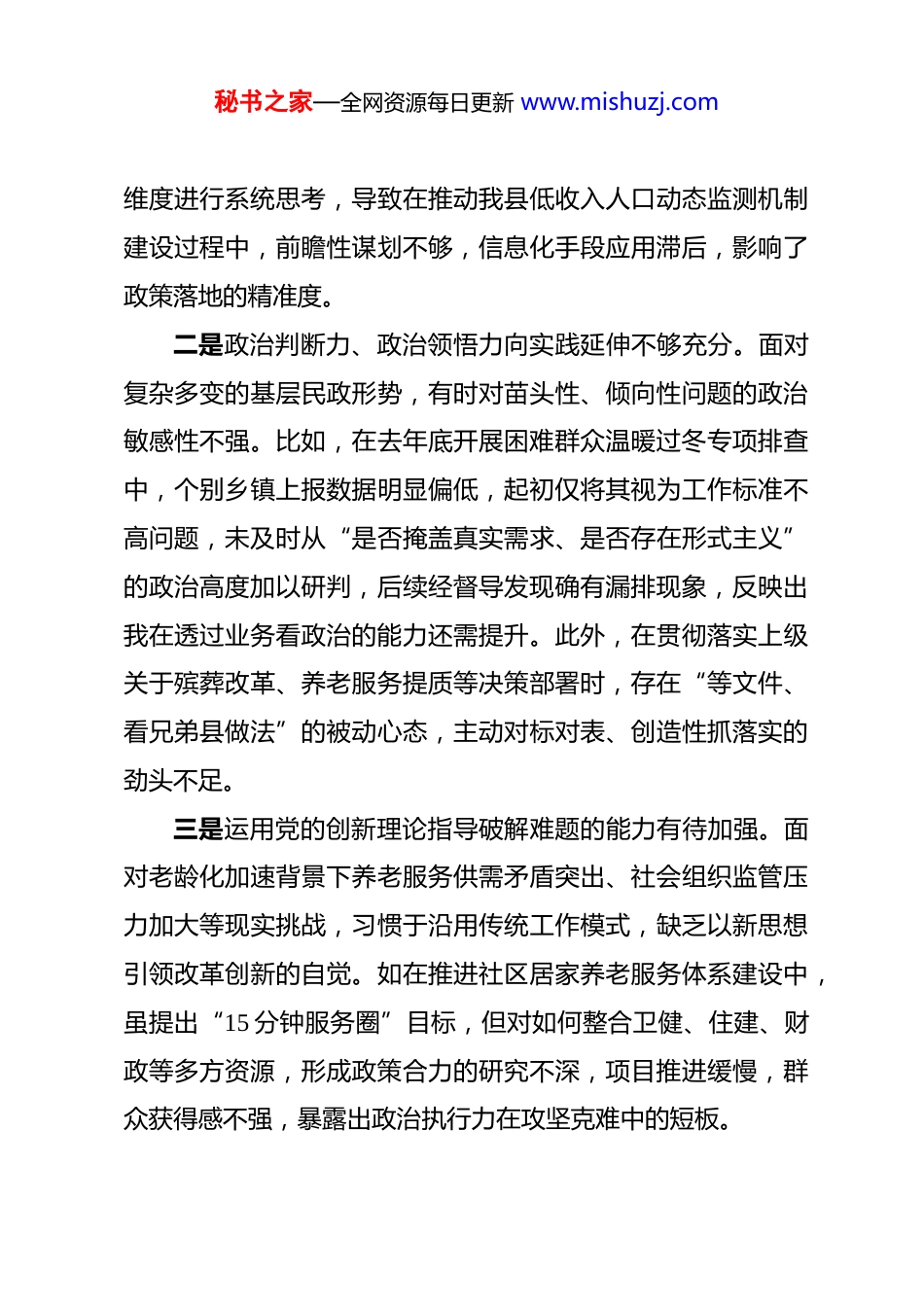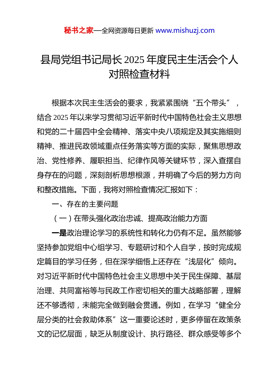 秘书之家—全网资源每日更新 www.mishuzj.com县局党组书记局长 2025 年度民主生活会个人对照检查材料 根据本次民主生活会的要求,我紧紧围绕“五个带头”,结合 2025 年以来学习贯彻习近平新时代中国特色社会主义思想和党的二十届四中全会精神、落实中央八项规定及其实施细则精神、推进民政领域重点任务落实等方面的实际,聚焦思想政治、党性修养、履职担当、纪律作风等关键环节,深入查摆自身存在的问题,深刻剖析思想根源,并明确了今后的努力方向和整改措施。下面,我将对照检查情况汇报如下:一、存在的主要问题(一)在带头强化政治忠诚、提高政治能力方面一是政治理论学习的系统性和转化力仍有不足。虽然能够坚持参加党组中心组学习、专题研讨和个人自学,按时完成规定篇目的学习任务,但在深学细悟上还存在“浅层化”倾向。对习近平新时代中国特色社会主义思想中关于民生保障、基层治理、共同富裕等与民政工作密切相关的重大战略部署,理解还不够透彻,未能完全做到融会贯通。例如,在学习“健全分层分类的社会救助体系”这一重要论述时,更多停留在政策条文的记忆层面,缺乏从制度设计、执行路径、群众感受等多个秘书之家—全网资源每日更新 www.mishuzj.com维度进行系统思考,导致在推动我县低收入人口动态监测机制建设过程中,前瞻性谋划不够,信息化手段应用滞后,影响了政策落地的精准度。二是政治判断力、政治领悟力向实践延伸不够充分。面对复杂多变的基层民政形势,有时对苗头性、倾向性问题的政治敏感性不强。比如,在去年底开展困难群众温暖过冬专项排查中,个别乡镇上报数据明显偏低,起初仅将其视为工作标准不高问题,未及时从“是否掩盖真实需求、是否存在形式主义”的政治高度加以研判,后续经督导发现确有漏排现象,反映出我在透过业务看政治的能力还需提升。此外,在贯彻落实上级关于殡葬改革、养老服务提质等决策部署时,存在“等文件、看兄弟县做法”的被动心态,主动对标对表、创造性抓落实的劲头不足。三是运用党的创新理论指导破解难题的能力有待加强。面对老龄化加速背景下养老服务供需矛盾突出、社会组织监管压力加大等现实挑战,习惯于沿用传统工作模式,缺乏以新思想引领改革创新的自觉。如在推进社区居家养老服务体系建设中,虽提出“15 分钟服务圈”目标,但对如何整合卫健、住建、财政等多方资源,形成政策合力的研究不深,项目推进缓慢,群众获得感不强,暴露出政治执行力在攻坚克难中的短板。秘书之家—全网资源每日更新 www.mishuzj.com(二)在带头固本培元、增强党性方面一是理想信念的根基锤炼不够持续深入。随着任职时间增长和事务性工作增多,自我革命的精神有所弱化,有时把参加组织生活当作“例行公事”,在支部讲党课时内容偏重政策解读,缺少触及思想灵魂的交流互动。对照焦裕禄、张富清等先进典型,发现自己在“一辈子坚守初心”的执着上还有差距。特别是在处理一些历史遗留的低保认定争议问题时,因担心引发信访风险,倾向于采取“稳控为主、暂缓调整”的保守策略,实质上是党性原则让位于现实顾虑的表现。二是党内政治生活的“辣味”不足。在班子内部开展批评与自我批评时,存在“老好人”思想。对班子成员中存在的个别问题,如分管领导在推进慈善资金使用进度上存在畏难情绪、个别科长工作作风拖沓等,多以提醒代替批评,没有真正红脸出汗。在上年度组织生活会上,其他同志对我提出的“统筹协调力度有待加强”等问题,虽作表态回应,但后续整改跟踪不到位,反映出接受监督的主动性不强。三是宗旨意识在具体实践中有所淡化。尽管始终强调“民政为民、民政爱民”理念,但在实际工作中仍存在脱离群众的现象。下基层调研往往以提前安排路线、听取汇报为主,随机走访困难家庭、蹲点了解一线工作人员诉求较少。今年一季度秘书之家—全网资源每日更新 www.mishuzj.com到某敬老院检查时,院长反映护理人员流失严重的问题,当时只是口头鼓励稳定队伍,未深入分析背后薪酬待遇、职业发展空间等深层次原因,也未及时推动相关政策研究,说明群众立场还没有完全转化为行动自觉。(三)在带头敬畏人民、敬畏组织、敬畏法纪方面一是...
