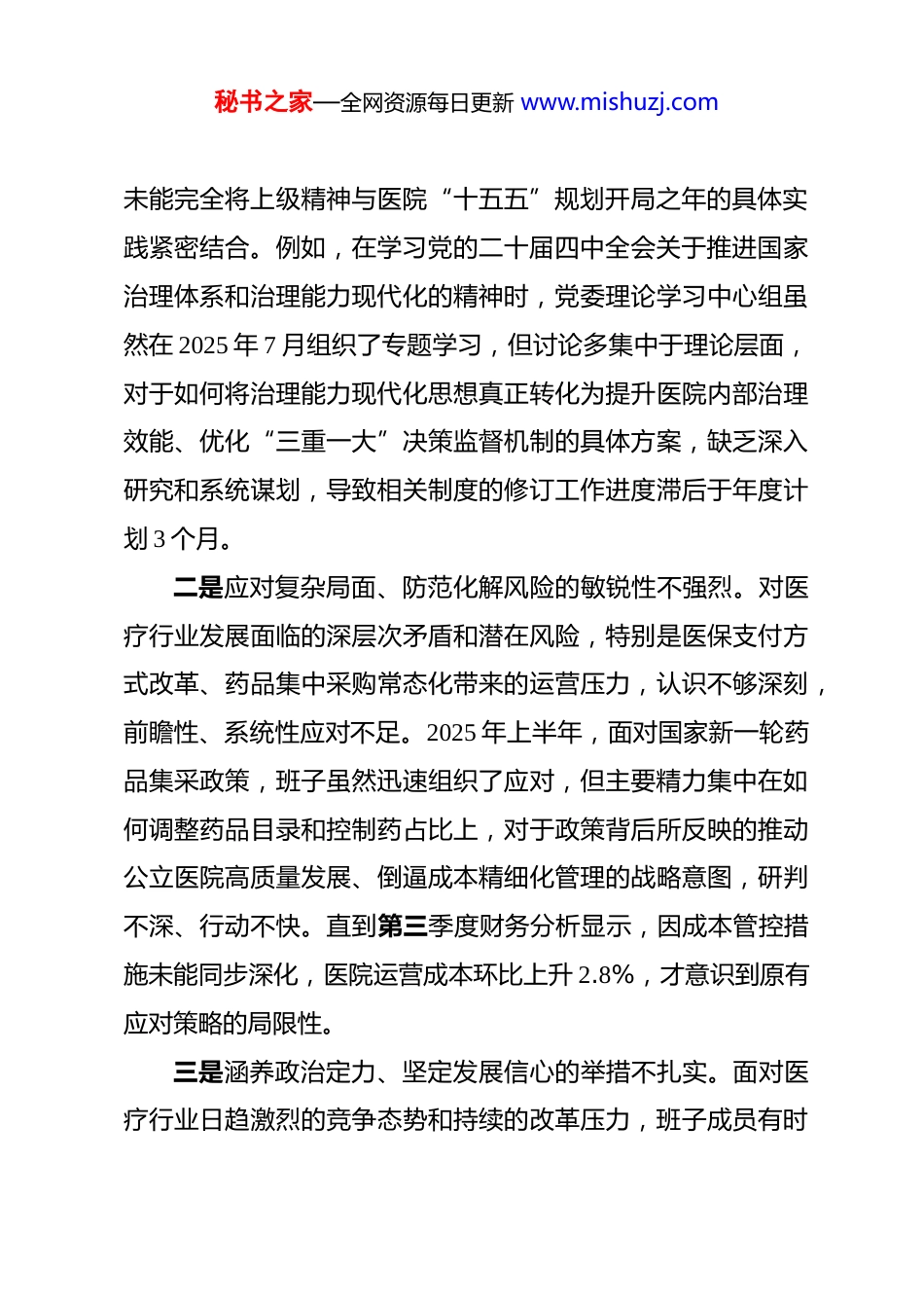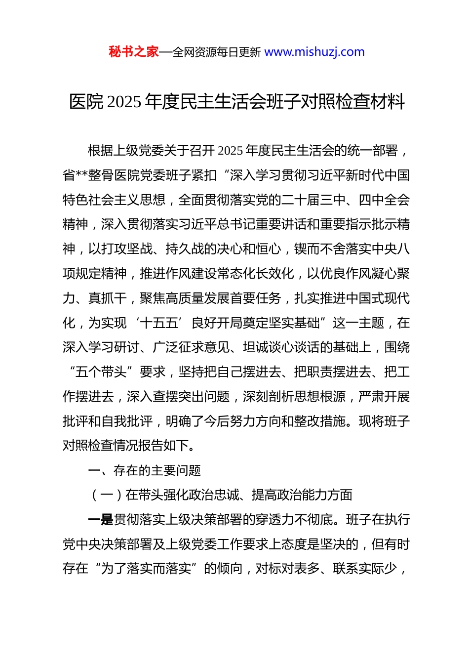秘书之家—全网资源每日更新 www.mishuzj.com医院 2025 年度民主生活会班子对照检查材料 根据上级党委关于召开 2025 年度民主生活会的统一部署,省**整骨医院党委班子紧扣“深入学习贯彻习近平新时代中国特色社会主义思想,全面贯彻落实党的二十届三中、四中全会精神,深入贯彻落实习近平总书记重要讲话和重要指示批示精神,以打攻坚战、持久战的决心和恒心,锲而不舍落实中央八项规定精神,推进作风建设常态化长效化,以优良作风凝心聚力、真抓干,聚焦高质量发展首要任务,扎实推进中国式现代化,为实现‘十五五’良好开局奠定坚实基础”这一主题,在深入学习研讨、广泛征求意见、坦诚谈心谈话的基础上,围绕“五个带头”要求,坚持把自己摆进去、把职责摆进去、把工作摆进去,深入查摆突出问题,深刻剖析思想根源,严肃开展批评和自我批评,明确了今后努力方向和整改措施。现将班子对照检查情况报告如下。一、存在的主要问题(一)在带头强化政治忠诚、提高政治能力方面一是贯彻落实上级决策部署的穿透力不彻底。班子在执行党中央决策部署及上级党委工作要求上态度是坚决的,但有时存在“为了落实而落实”的倾向,对标对表多、联系实际少,秘书之家—全网资源每日更新 www.mishuzj.com未能完全将上级精神与医院“十五五”规划开局之年的具体实践紧密结合。例如,在学习党的二十届四中全会关于推进国家治理体系和治理能力现代化的精神时,党委理论学习中心组虽然在 2025 年 7 月组织了专题学习,但讨论多集中于理论层面,对于如何将治理能力现代化思想真正转化为提升医院内部治理效能、优化“三重一大”决策监督机制的具体方案,缺乏深入研究和系统谋划,导致相关制度的修订工作进度滞后于年度计划 3 个月。二是应对复杂局面、防范化解风险的敏锐性不强烈。对医疗行业发展面临的深层次矛盾和潜在风险,特别是医保支付方式改革、药品集中采购常态化带来的运营压力,认识不够深刻,前瞻性、系统性应对不足。2025 年上半年,面对国家新一轮药品集采政策,班子虽然迅速组织了应对,但主要精力集中在如何调整药品目录和控制药占比上,对于政策背后所反映的推动公立医院高质量发展、倒逼成本精细化管理的战略意图,研判不深、行动不快。直到第三季度财务分析显示,因成本管控措施未能同步深化,医院运营成本环比上升 2.8%,才意识到原有应对策略的局限性。三是涵养政治定力、坚定发展信心的举措不扎实。面对医疗行业日趋激烈的竞争态势和持续的改革压力,班子成员有时秘书之家—全网资源每日更新 www.mishuzj.com会产生畏难情绪,对医院作为中医骨伤专科“国家队”的优势和潜力自信不足。在推进国家级中医骨伤诊疗中心建设的关键时期,对于一些需要先行先试的改革项目,如建立与国际接轨的临床研究数据管理平台,在 2025 年 5 月的党委会上,部分班子成员因担心投入大、见效慢、易出错而犹豫不决,导致该项目论证周期长达半年,错失了与国内顶尖科研机构合作的最佳时机,影响了医院在“十五五”开局之年抢占科研高地的战略布局。(二)在带头固本培元、增强党性修养方面一是理论学习与思想改造的结合不紧密。在用习近平新时代中国特色社会主义思想凝心铸魂上,存在“学用脱节”现象。集体学习多,但真正触及灵魂、改造世界观的深刻反思少。在2025 年度开展的为期 5 个月的贯彻中央八项规定精神专题学习教育中,班子成员虽然都完成了规定篇目的学习和笔记撰写,但在交流研讨环节,多是复述理论观点,对照自身思想和分管领域工作实际,深刻检视是否存在享乐主义、奢靡之风隐形变异问题的发言不深不透,未能真正做到红脸出汗、排毒治病。二是坚守共产党人精神追求的意志不坚定。在长期和平环境和相对优越的工作条件下,艰苦奋斗、勤俭节约的意识有所淡化。虽然医院层面三公经费持续压降, 2025 年同比下降秘书之家—全网资源每日更新 www.mishuzj.com4.5%,但“看不见的浪费”依然存在。例如,在推进院区信息化升级改造过程中,对于一些非核心业务系统,仍倾向于采购价格昂贵的一线品牌,而对功能同样满足需求、性价比更高的国产品牌采纳意愿不强。据后勤部门统...