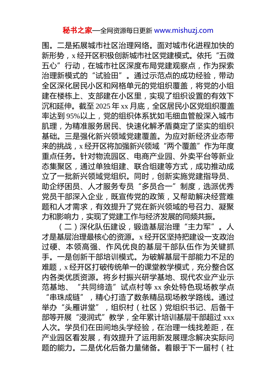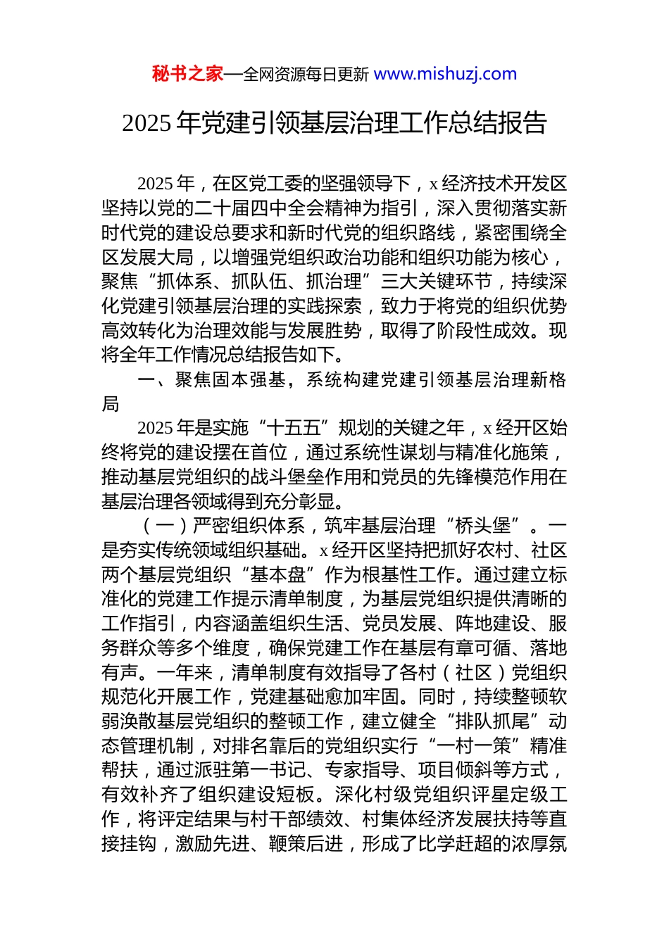 秘书之家—全网资源每日更新 www.mishuzj.com2025 年党建引领基层治理工作总结报告2025 年,在区党工委的坚强领导下,x 经济技术开发区坚持以党的二十届四中全会精神为指引,深入贯彻落实新时代党的建设总要求和新时代党的组织路线,紧密围绕全区发展大局,以增强党组织政治功能和组织功能为核心,聚焦“抓体系、抓队伍、抓治理”三大关键环节,持续深化党建引领基层治理的实践探索,致力于将党的组织优势高效转化为治理效能与发展胜势,取得了阶段性成效。现将全年工作情况总结报告如下。一、聚焦固本强基,系统构建党建引领基层治理新格局2025 年是实施“十五五”规划的关键之年,x 经开区始终将党的建设摆在首位,通过系统性谋划与精准化施策,推动基层党组织的战斗堡垒作用和党员的先锋模范作用在基层治理各领域得到充分彰显。(一)严密组织体系,筑牢基层治理“桥头堡”。一是夯实传统领域组织基础。x 经开区坚持把抓好农村、社区两个基层党组织“基本盘”作为根基性工作。通过建立标准化的党建工作提示清单制度,为基层党组织提供清晰的工作指引,内容涵盖组织生活、党员发展、阵地建设、服务群众等多个维度,确保党建工作在基层有章可循、落地有声。一年来,清单制度有效指导了各村(社区)党组织规范化开展工作,党建基础愈加牢固。同时,持续整顿软弱涣散基层党组织的整顿工作,建立健全“排队抓尾”动态管理机制,对排名靠后的党组织实行“一村一策”精准帮扶,通过派驻第一书记、专家指导、项目倾斜等方式,有效补齐了组织建设短板。深化村级党组织评星定级工作,将评定结果与村干部绩效、村集体经济发展扶持等直接挂钩,激励先进、鞭策后进,形成了比学赶超的浓厚氛秘书之家—全网资源每日更新 www.mishuzj.com围。二是拓展城市社区治理网络。面对城市化进程加快的新形势,x 经开区积极创新城市社区党建模式。依托“五微五心”行动,在城市社区深度布局党建观察点,作为探索治理新模式的“试验田”。通过示范点的成功经验,带动全区深化居民小区和网格单元的党组织覆盖,将党的小组建在楼栋上、支部建在小区里,实现了组织设置的有效下沉和延伸。截至 2025 年 xx 月底,全区居民小区党组织覆盖率达到 95%以上,党的组织体系犹如毛细血管般深入城市肌理,为精准服务居民、快速化解矛盾奠定了坚实的组织基础。三是强化新兴领域党建覆盖。为应对新经济业态带来的挑战,x 经开区将加强新兴领域“两个覆盖”作为年度重点任务。针对物流园区、电商产业园、外卖平台等新业态集聚区,通过单独组建、联合组建等方式,成功推动成立了一批新兴领域党组织。同时,创新实施党建指导员、助企纾困员、人才服务专员“多员合一”制度,选派优秀党员干部深入企业,既宣传党的政策,又帮助解决经营难题和人才需求,有效提升了党在新兴领域的号召力、凝聚力和影响力,实现了党建工作与经济发展的同频共振。(二)深化队伍建设,锻造基层治理“主力军”。人才是基层治理最核心的资源。x 经开区坚持把建设一支政治过硬、本领高强、作风优良的基层干部队伍作为关键抓手。一是创新干部培训模式。为破解基层干部能力不足的难题,x 经开区打破传统单一的课堂教学模式,充分整合区内各类优质资源。将乡村振兴研学基地、现代农业产业示范基地、“共同缔造”试点村等 xx 余处特色现场教学点“串珠成链”,精心打造了数条精品现场教学路线。通过举办“头雁讲堂”,组织村(社区)党组织书记、后备干部等开展“浸润式”教学,全年累计培训基层干部超过 xxx人次。学员们在田间地头学经验,在治理一线找差距,在产业园区看发展,有效提升了运用新发展理念解决实际问题的能力。二是优化后备力量储备。着眼于下一届村(社秘书之家—全网资源每日更新 www.mishuzj.com区)“两委”换届的需要,x 经开区提前谋划,系统整合镇、村两级班子和公益性岗位资源,有计划地安排政治素质好、群众基础牢、有发展潜力的储备人选到信访维稳、项目建设、环境整治等关键岗位进行实践锻炼,让其在“风口浪尖”上经风雨、见世面、长才干。同时,抓住春节、国庆等重要时间节点,利用外出务工党员、大...