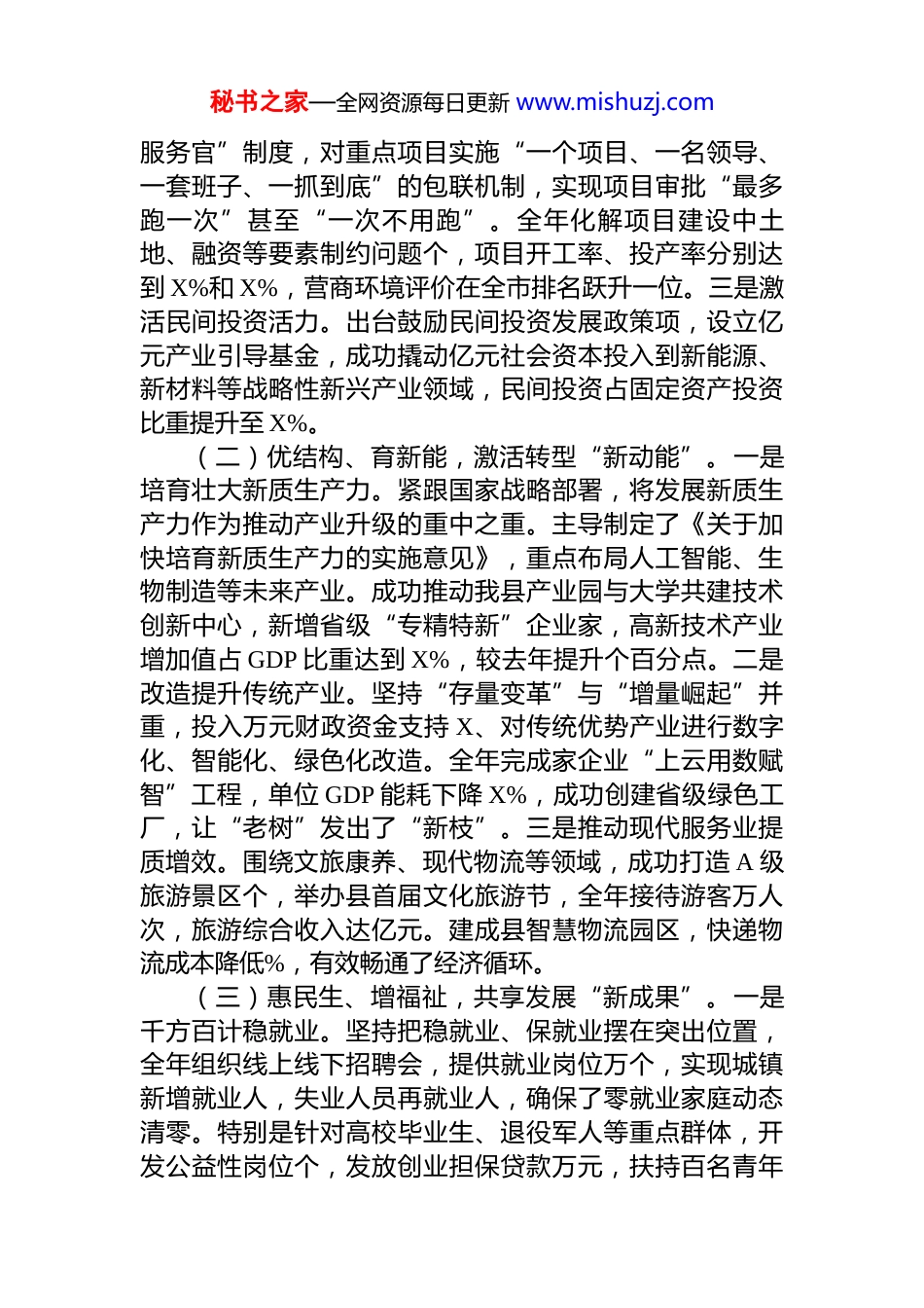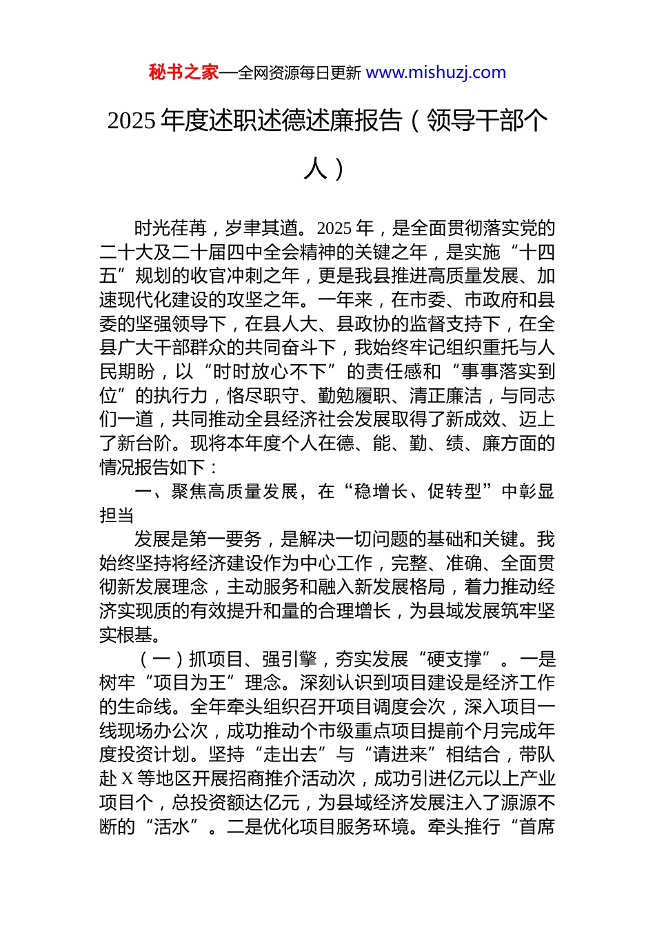 秘书之家—全网资源每日更新 www.mishuzj.com2025 年度述职述德述廉报告(领导干部个人)时光荏苒,岁聿其遒。2025 年,是全面贯彻落实党的二十大及二十届四中全会精神的关键之年,是实施“十四五”规划的收官冲刺之年,更是我县推进高质量发展、加速现代化建设的攻坚之年。一年来,在市委、市政府和县委的坚强领导下,在县人大、县政协的监督支持下,在全县广大干部群众的共同奋斗下,我始终牢记组织重托与人民期盼,以“时时放心不下”的责任感和“事事落实到位”的执行力,恪尽职守、勤勉履职、清正廉洁,与同志们一道,共同推动全县经济社会发展取得了新成效、迈上了新台阶。现将本年度个人在德、能、勤、绩、廉方面的情况报告如下:一、聚焦高质量发展,在“稳增长、促转型”中彰显担当发展是第一要务,是解决一切问题的基础和关键。我始终坚持将经济建设作为中心工作,完整、准确、全面贯彻新发展理念,主动服务和融入新发展格局,着力推动经济实现质的有效提升和量的合理增长,为县域发展筑牢坚实根基。(一)抓项目、强引擎,夯实发展“硬支撑”。一是树牢“项目为王”理念。深刻认识到项目建设是经济工作的生命线。全年牵头组织召开项目调度会次,深入项目一线现场办公次,成功推动个市级重点项目提前个月完成年度投资计划。坚持“走出去”与“请进来”相结合,带队赴 X 等地区开展招商推介活动次,成功引进亿元以上产业项目个,总投资额达亿元,为县域经济发展注入了源源不断的“活水”。二是优化项目服务环境。牵头推行“首席秘书之家—全网资源每日更新 www.mishuzj.com服务官”制度,对重点项目实施“一个项目、一名领导、一套班子、一抓到底”的包联机制,实现项目审批“最多跑一次”甚至“一次不用跑”。全年化解项目建设中土地、融资等要素制约问题个,项目开工率、投产率分别达到 X%和 X%,营商环境评价在全市排名跃升一位。三是激活民间投资活力。出台鼓励民间投资发展政策项,设立亿元产业引导基金,成功撬动亿元社会资本投入到新能源、新材料等战略性新兴产业领域,民间投资占固定资产投资比重提升至 X%。(二)优结构、育新能,激活转型“新动能”。一是培育壮大新质生产力。紧跟国家战略部署,将发展新质生产力作为推动产业升级的重中之重。主导制定了《关于加快培育新质生产力的实施意见》,重点布局人工智能、生物制造等未来产业。成功推动我县产业园与大学共建技术创新中心,新增省级“专精特新”企业家,高新技术产业增加值占 GDP 比重达到 X%,较去年提升个百分点。二是改造提升传统产业。坚持“存量变革”与“增量崛起”并重,投入万元财政资金支持 X、对传统优势产业进行数字化、智能化、绿色化改造。全年完成家企业“上云用数赋智”工程,单位 GDP 能耗下降 X%,成功创建省级绿色工厂,让“老树”发出了“新枝”。三是推动现代服务业提质增效。围绕文旅康养、现代物流等领域,成功打造 A 级旅游景区个,举办县首届文化旅游节,全年接待游客万人次,旅游综合收入达亿元。建成县智慧物流园区,快递物流成本降低%,有效畅通了经济循环。(三)惠民生、增福祉,共享发展“新成果”。一是千方百计稳就业。坚持把稳就业、保就业摆在突出位置,全年组织线上线下招聘会,提供就业岗位万个,实现城镇新增就业人,失业人员再就业人,确保了零就业家庭动态清零。特别是针对高校毕业生、退役军人等重点群体,开发公益性岗位个,发放创业担保贷款万元,扶持百名青年秘书之家—全网资源每日更新 www.mishuzj.com成功创业。二是持续增加群众收入。随着经济发展,城乡居民收入稳步增长。据统计,2025 年我县城镇居民人均可支配收入达到元,同比增长 X%;农村居民人均可支配收入达到元,同比增长%,增速连续年快于城镇居民,城乡收入差距进一步缩小。三是兜牢基本民生底线。坚持财力向民生倾斜,民生支出占一般公共预算支出的比重保持在%以上。城乡低保、特困供养等保障标准实现“连增”,累计发放各类救助资金万元,惠及困难群众 X 万余人次,确保了发展成果更多更公平惠及全体人民。二、心系“三农”根本,在“促振兴、美乡村”中践行使命民...