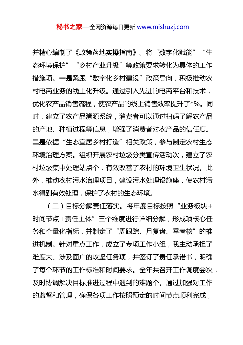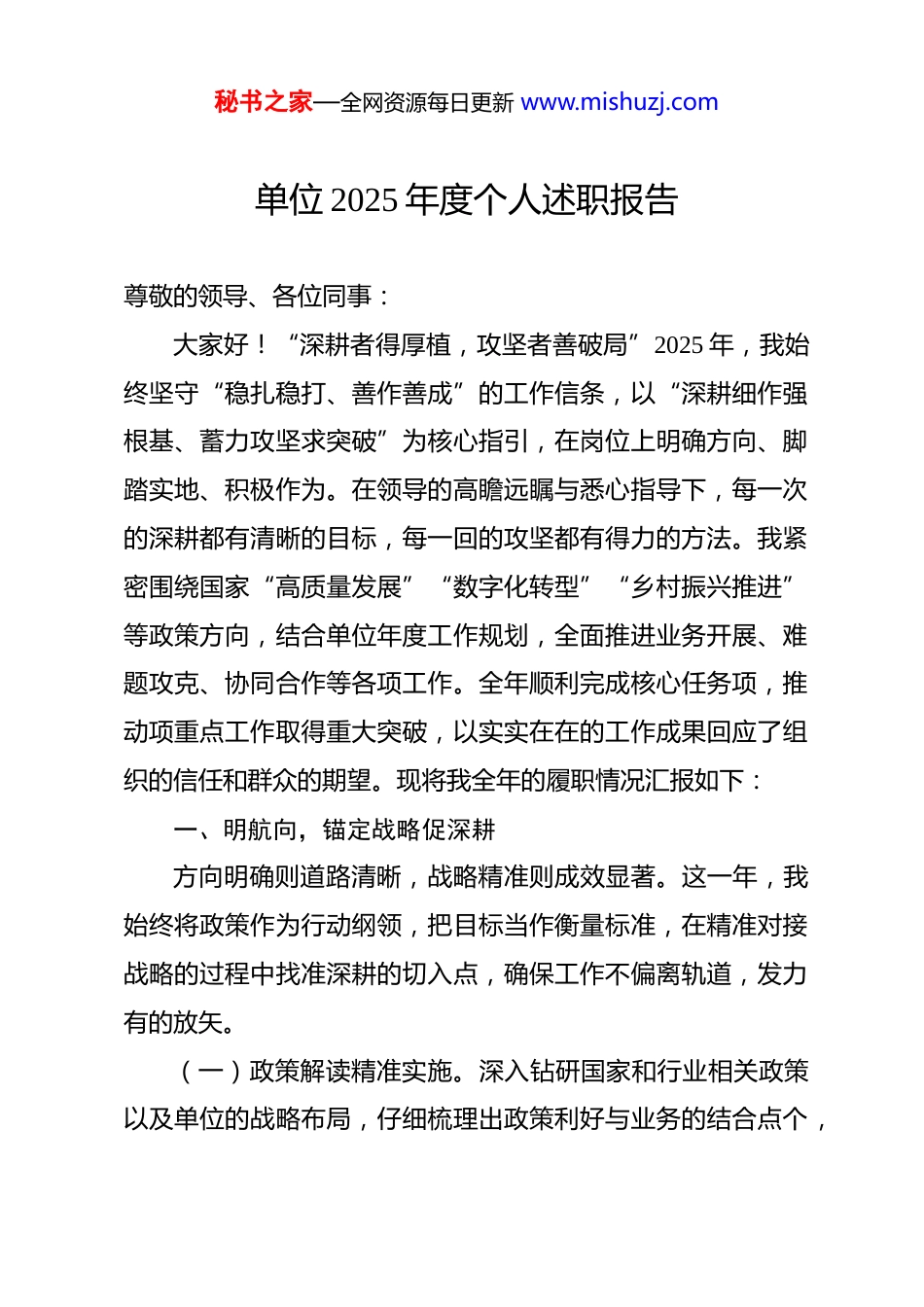 秘书之家—全网资源每日更新 www.mishuzj.com单位 2025 年度个人述职报告 尊敬的领导、各位同事:大家好!“深耕者得厚植,攻坚者善破局”2025 年,我始终坚守“稳扎稳打、善作善成”的工作信条,以“深耕细作强根基、蓄力攻坚求突破”为核心指引,在岗位上明确方向、脚踏实地、积极作为。在领导的高瞻远瞩与悉心指导下,每一次的深耕都有清晰的目标,每一回的攻坚都有得力的方法。我紧密围绕国家“高质量发展”“数字化转型”“乡村振兴推进”等政策方向,结合单位年度工作规划,全面推进业务开展、难题攻克、协同合作等各项工作。全年顺利完成核心任务项,推动项重点工作取得重大突破,以实实在在的工作成果回应了组织的信任和群众的期望。现将我全年的履职情况汇报如下:一、明航向,锚定战略促深耕方向明确则道路清晰,战略精准则成效显著。这一年,我始终将政策作为行动纲领,把目标当作衡量标准,在精准对接战略的过程中找准深耕的切入点,确保工作不偏离轨道,发力有的放矢。(一)政策解读精准实施。深入钻研国家和行业相关政策以及单位的战略布局,仔细梳理出政策利好与业务的结合点个,秘书之家—全网资源每日更新 www.mishuzj.com并精心编制了《政策落地实操指南》。将“数字化赋能”“生态环境保护”“乡村产业升级”等政策要求转化为具体的工作措施项。一是紧跟“数字化乡村建设”政策导向,积极推动农村电商业务的线上化升级。通过引入先进的电商平台和技术,优化农产品销售流程,使农产品的线上销售效率提升了*%。同时,建立了农产品溯源系统,消费者可以通过扫码了解农产品的产地、种植过程等信息,增强了消费者对农产品的信任度。二是依据“生态宜居乡村打造”相关政策,参与制定农村生态环境治理方案。组织开展农村垃圾分类宣传活动次,建立了农村垃圾集中处理站点个,有效改善了农村的环境卫生状况。此外,推动农村污水治理项目,建设污水处理设施座,使农村污水得到有效处理,保护了农村的生态环境。(二)目标分解责任落实。将年度目标按照“业务板块+时间节点+责任主体”三个维度进行详细分解,形成项核心任务和个量化指标,并制定了“周跟踪、月复盘、季考核”的推进机制。针对重点工作,成立了专项工作小组,我主动承担了难度大、涉及面广的攻坚任务项,并签订了责任承诺书,明确了每个环节的工作标准和时间要求。全年共召开工作调度会次,及时协调解决目标推进过程中遇到的难题个。通过加强对工作的监督和管理,确保各项工作按照预定的时间节点顺利完成,秘书之家—全网资源每日更新 www.mishuzj.com年度目标完成率达到了*%,为深耕细作奠定了坚实的基础。二、强业务,深耕细作提效能业务是履行职责的根本,精细是取得成功的关键。这一年我始终以严谨细致的态度深耕主责主业,通过规范流程、优化服务、提高效率,不断提升自己的履职能力。(一)流程优化精益求精。聚焦业务全流程中的痛点和难点问题,全面梳理核心业务流程项,排查出审批烦琐、环节冗余、职责不清等问题个。通过“整合相似环节、简化审批流程、明确责任界限”,优化了项业务流程,并制定了《业务操作标准化规范》,明确了个关键环节的操作标准和审核要求。一是优化农村土地流转业务办理流程,推行“一站式服务、并联审批”模式。整合多个部门的审批环节,实现了土地流转手续的快速办理,办理周期缩短了*%。同时,建立了土地流转信息平台,方便农民查询土地流转信息,提高了土地流转的透明度和效率。二是规范农村金融服务流程,建立了“申请-审核-放款”全链条标准化机制。加大对贷款申请的审核力度,提高了贷款的发放质量,不良贷款率控制在*%以内。同时,为农民提供个性化的金融服务方案,满足了农民多样化的金融需求。(二)服务升级精准发力。秉持“以人民为中心”的服务理念,深入挖掘服务细节,推出了“个性化服务+主动服务”秘书之家—全网资源每日更新 www.mishuzj.com的双轮驱动模式。一是针对农村老年人、残疾人等特殊群体,制定了差异化服务方案。为他们提供上门办理业务、绿色服务通道、一对一指导等服务次,让特殊群体感受到了温暖和关怀。二是建立了服务对象需求调...
