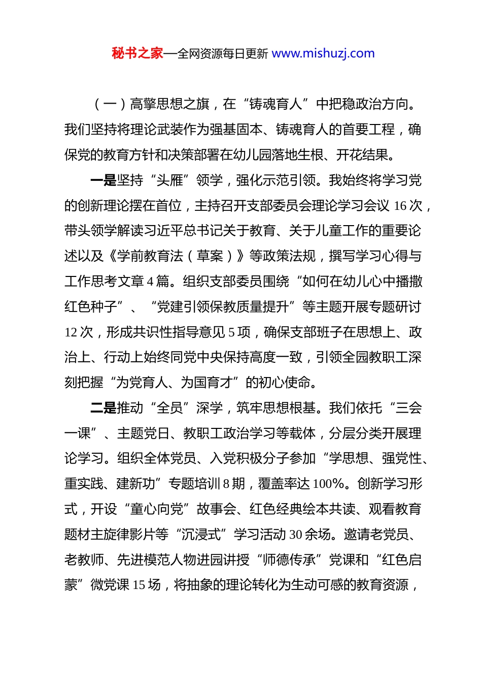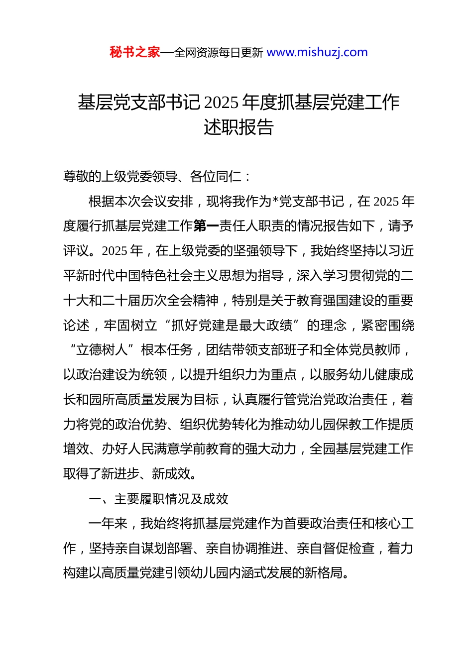 秘书之家—全网资源每日更新 www.mishuzj.com基层党支部书记 2025 年度抓基层党建工作述职报告 尊敬的上级党委领导、各位同仁:根据本次会议安排,现将我作为*党支部书记,在 2025 年度履行抓基层党建工作第一责任人职责的情况报告如下,请予评议。2025 年,在上级党委的坚强领导下,我始终坚持以习近平新时代中国特色社会主义思想为指导,深入学习贯彻党的二十大和二十届历次全会精神,特别是关于教育强国建设的重要论述,牢固树立“抓好党建是最大政绩”的理念,紧密围绕“立德树人”根本任务,团结带领支部班子和全体党员教师,以政治建设为统领,以提升组织力为重点,以服务幼儿健康成长和园所高质量发展为目标,认真履行管党治党政治责任,着力将党的政治优势、组织优势转化为推动幼儿园保教工作提质增效、办好人民满意学前教育的强大动力,全园基层党建工作取得了新进步、新成效。一、主要履职情况及成效一年来,我始终将抓基层党建作为首要政治责任和核心工作,坚持亲自谋划部署、亲自协调推进、亲自督促检查,着力构建以高质量党建引领幼儿园内涵式发展的新格局。秘书之家—全网资源每日更新 www.mishuzj.com(一)高擎思想之旗,在“铸魂育人”中把稳政治方向。我们坚持将理论武装作为强基固本、铸魂育人的首要工程,确保党的教育方针和决策部署在幼儿园落地生根、开花结果。一是坚持“头雁”领学,强化示范引领。我始终将学习党的创新理论摆在首位,主持召开支部委员会理论学习会议 16 次,带头领学解读习近平总书记关于教育、关于儿童工作的重要论述以及《学前教育法(草案)》等政策法规,撰写学习心得与工作思考文章 4 篇。组织支部委员围绕“如何在幼儿心中播撒红色种子”、“党建引领保教质量提升”等主题开展专题研讨12 次,形成共识性指导意见 5 项,确保支部班子在思想上、政治上、行动上始终同党中央保持高度一致,引领全园教职工深刻把握“为党育人、为国育才”的初心使命。二是推动“全员”深学,筑牢思想根基。我们依托“三会一课”、主题党日、教职工政治学习等载体,分层分类开展理论学习。组织全体党员、入党积极分子参加“学思想、强党性、重实践、建新功”专题培训 8 期,覆盖率达 100%。创新学习形式,开设“童心向党”故事会、红色经典绘本共读、观看教育题材主旋律影片等“沉浸式”学习活动 30 余场。邀请老党员、老教师、先进模范人物进园讲授“师德传承”党课和“红色启蒙”微党课 15 场,将抽象的理论转化为生动可感的教育资源,秘书之家—全网资源每日更新 www.mishuzj.com引导全体教职工在“学思践悟”中坚定理想信念,提升政治素养。三是深化“实践”检学,促进知行合一。我们把教育教学一线、家园共育现场、服务幼儿和家长的实际成效作为检验学习成果的“试金石”。我带头深入班级跟岗调研 40 余天,围绕“党建引领下的幼儿品德启蒙实践”、“党支部在化解家园矛盾中的作用”等课题形成调研报告 2 篇。推动设立“党员示范岗”18 个,划定“党员责任区”覆盖全园各年级组和功能部室。通过学习与实践的结合,党员教师带头投身课程改革、环境创设、安全管理和家园沟通,成功化解了 3 起较为复杂的家园纠纷,推动了“幼儿午睡质量提升”、“特殊需要儿童融合教育支持”等 6 项家长关心的难点问题得到有效改善,教职工的政治判断力、政治领悟力、政治执行力显著增强。(二)夯实组织之基,在“强筋健骨”中锻造先锋堡垒。我们牢固树立“党的一切工作到支部”的鲜明导向,着力把党支部建设成为宣传党的主张、贯彻党的决定、领导园所治理、团结动员教职工、推动改革发展的坚强战斗堡垒。一是抓标准化建设,推动支部工作“规范过硬”。我们严格对标《中国共产党支部工作条例(试行)》和基层党组织建设标准,全年投入党建专项经费用于党员活动室升级、学习资秘书之家—全网资源每日更新 www.mishuzj.com料购置和活动开展。规范落实“三会一课”、组织生活会、民主评议党员、谈心谈话等制度,会议记录、活动台账完整规范。我们着力破解党建与业务“两张皮”问题,将党建工作要求有机融入园务会议、保教研讨、师德考...
