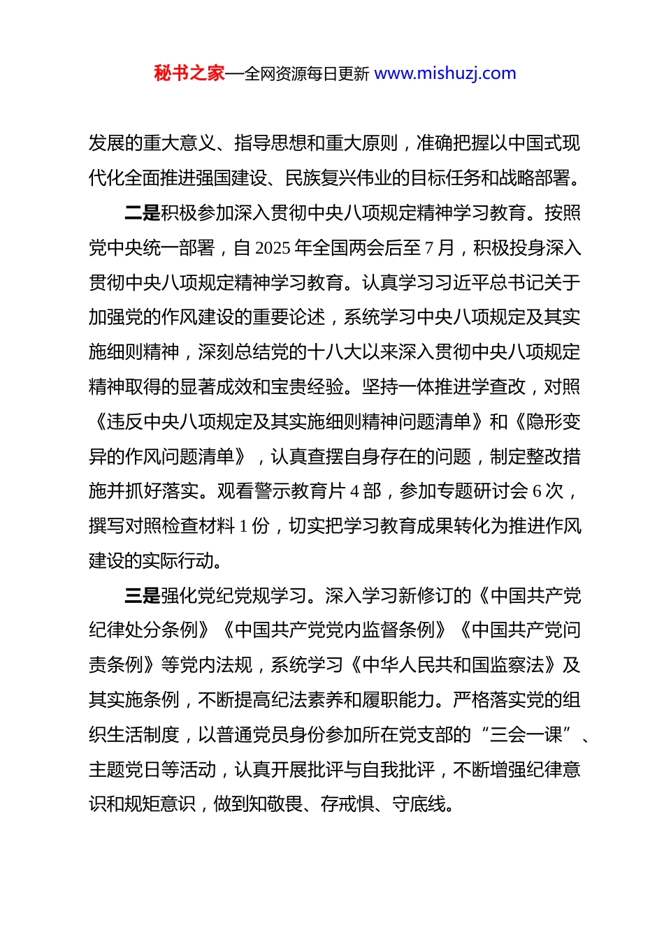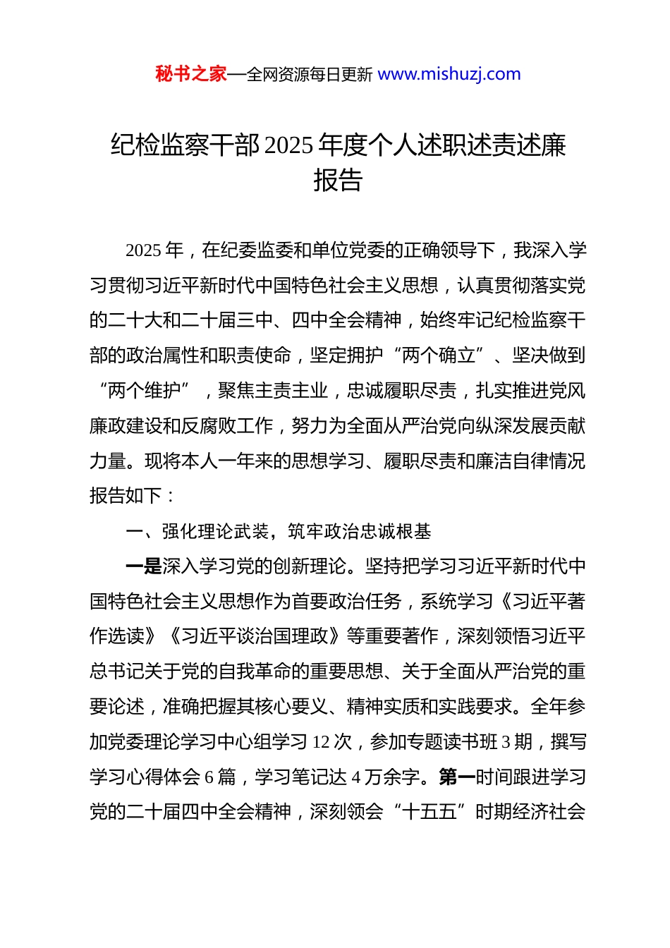 秘书之家—全网资源每日更新 www.mishuzj.com纪检监察干部 2025 年度个人述职述责述廉报告 2025 年,在纪委监委和单位党委的正确领导下,我深入学习贯彻习近平新时代中国特色社会主义思想,认真贯彻落实党的二十大和二十届三中、四中全会精神,始终牢记纪检监察干部的政治属性和职责使命,坚定拥护“两个确立”、坚决做到“两个维护”,聚焦主责主业,忠诚履职尽责,扎实推进党风廉政建设和反腐败工作,努力为全面从严治党向纵深发展贡献力量。现将本人一年来的思想学习、履职尽责和廉洁自律情况报告如下:一、强化理论武装,筑牢政治忠诚根基一是深入学习党的创新理论。坚持把学习习近平新时代中国特色社会主义思想作为首要政治任务,系统学习《习近平著作选读》《习近平谈治国理政》等重要著作,深刻领悟习近平总书记关于党的自我革命的重要思想、关于全面从严治党的重要论述,准确把握其核心要义、精神实质和实践要求。全年参加党委理论学习中心组学习 12 次,参加专题读书班 3 期,撰写学习心得体会 6 篇,学习笔记达 4 万余字。第一时间跟进学习党的二十届四中全会精神,深刻领会“十五五”时期经济社会秘书之家—全网资源每日更新 www.mishuzj.com发展的重大意义、指导思想和重大原则,准确把握以中国式现代化全面推进强国建设、民族复兴伟业的目标任务和战略部署。二是积极参加深入贯彻中央八项规定精神学习教育。按照党中央统一部署,自 2025 年全国两会后至 7 月,积极投身深入贯彻中央八项规定精神学习教育。认真学习习近平总书记关于加强党的作风建设的重要论述,系统学习中央八项规定及其实施细则精神,深刻总结党的十八大以来深入贯彻中央八项规定精神取得的显著成效和宝贵经验。坚持一体推进学查改,对照《违反中央八项规定及其实施细则精神问题清单》和《隐形变异的作风问题清单》,认真查摆自身存在的问题,制定整改措施并抓好落实。观看警示教育片 4 部,参加专题研讨会 6 次,撰写对照检查材料 1 份,切实把学习教育成果转化为推进作风建设的实际行动。三是强化党纪党规学习。深入学习新修订的《中国共产党纪律处分条例》《中国共产党党内监督条例》《中国共产党问责条例》等党内法规,系统学习《中华人民共和国监察法》及其实施条例,不断提高纪法素养和履职能力。严格落实党的组织生活制度,以普通党员身份参加所在党支部的“三会一课”、主题党日等活动,认真开展批评与自我批评,不断增强纪律意识和规矩意识,做到知敬畏、存戒惧、守底线。秘书之家—全网资源每日更新 www.mishuzj.com二、聚焦主责主业,忠诚履行监督职责一是强化政治监督。紧紧围绕“两个维护”这个根本任务,聚焦党中央重大决策部署贯彻落实情况开展政治监督。重点监督检查党的二十届四中全会精神学习贯彻、“十五五”规划部署落实、深入贯彻中央八项规定精神学习教育开展等情况,推动政治监督具体化、精准化、常态化。全年参与政治监督检查8 次,发现问题 15 个,督促整改到位 13 个,2 个问题正在持续整改中二是深化日常监督。坚持抓早抓小、防微杜渐,紧盯关键少数、关键岗位和关键环节,建立健全日常监督机制。全年列席党委会、办公会等重要会议 20 余次,对“三重一大”事项决策程序进行全程监督,提出意见建议 12 条并被采纳。开展明察暗访 10 次,发现并督促整改问题 18 个。运用“四种形态”处置问题线索,开展谈话提醒 32 人次、批评教育 15 人次,切实做到抓早抓小、红脸出汗。三是从严执纪问责。坚持有案必查、有腐必惩,始终保持惩治腐败高压态势。全年受理信访举报 12 件,处置问题线索 15件,初核 10 件,立案 4 件,给予党纪政务处分 5 人。注重发挥查办案件的治本功能,针对查处的典型案例,组织召开警示教育大会 3 次,制发纪检监察建议书 2 份,督促相关单位完善制秘书之家—全网资源每日更新 www.mishuzj.com度机制 5 项,推动实现“查处一案、警示一片、治理一域”四是深化专项整治。扎实开展群众身边不正之风和腐败问题专项整治,聚焦教育医疗、养老社保、生态环保等重点领域,集中整治损害群众利益的突...