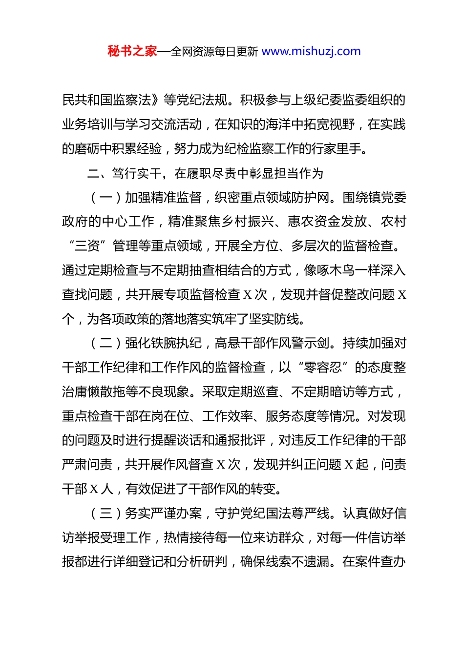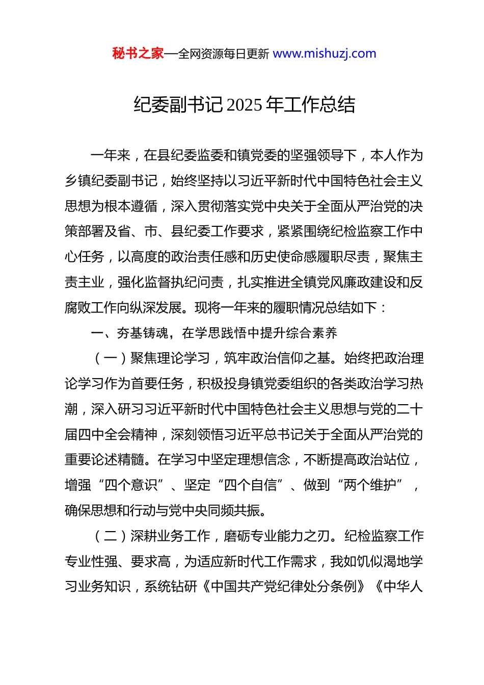 秘书之家—全网资源每日更新 www.mishuzj.com纪委副书记 2025 年工作总结 一年来,在县纪委监委和镇党委的坚强领导下,本人作为乡镇纪委副书记,始终坚持以习近平新时代中国特色社会主义思想为根本遵循,深入贯彻落实党中央关于全面从严治党的决策部署及省、市、县纪委工作要求,紧紧围绕纪检监察工作中心任务,以高度的政治责任感和历史使命感履职尽责,聚焦主责主业,强化监督执纪问责,扎实推进全镇党风廉政建设和反腐败工作向纵深发展。现将一年来的履职情况总结如下:一、夯基铸魂,在学思践悟中提升综合素养(一)聚焦理论学习,筑牢政治信仰之基。始终把政治理论学习作为首要任务,积极投身镇党委组织的各类政治学习热潮,深入研习习近平新时代中国特色社会主义思想与党的二十届四中全会精神,深刻领悟习近平总书记关于全面从严治党的重要论述精髓。在学习中坚定理想信念,不断提高政治站位,增强“四个意识”、坚定“四个自信”、做到“两个维护”,确保思想和行动与党中央同频共振。(二)深耕业务工作,磨砺专业能力之刃。纪检监察工作专业性强、要求高,为适应新时代工作需求,我如饥似渴地学习业务知识,系统钻研《中国共产党纪律处分条例》《中华人秘书之家—全网资源每日更新 www.mishuzj.com民共和国监察法》等党纪法规。积极参与上级纪委监委组织的业务培训与学习交流活动,在知识的海洋中拓宽视野,在实践的磨砺中积累经验,努力成为纪检监察工作的行家里手。二、笃行实干,在履职尽责中彰显担当作为(一)加强精准监督,织密重点领域防护网。围绕镇党委政府的中心工作,精准聚焦乡村振兴、惠农资金发放、农村“三资”管理等重点领域,开展全方位、多层次的监督检查。通过定期检查与不定期抽查相结合的方式,像啄木鸟一样深入查找问题,共开展专项监督检查 X 次,发现并督促整改问题 X个,为各项政策的落地落实筑牢了坚实防线。(二)强化铁腕执纪,高悬干部作风警示剑。持续加强对干部工作纪律和工作作风的监督检查,以“零容忍”的态度整治庸懒散拖等不良现象。采取定期巡查、不定期暗访等方式,重点检查干部在岗在位、工作效率、服务态度等情况。对发现的问题及时进行提醒谈话和通报批评,对违反工作纪律的干部严肃问责,共开展作风督查 X 次,发现并纠正问题 X 起,问责干部 X 人,有效促进了干部作风的转变。(三)务实严谨办案,守护党纪国法尊严线。认真做好信访举报受理工作,热情接待每一位来访群众,对每一件信访举报都进行详细登记和分析研判,确保线索不遗漏。在案件查办秘书之家—全网资源每日更新 www.mishuzj.com过程中,严格按照法定程序和要求开展工作,积极协助纪委书记做好调查取证、谈话笔录、案件审理等工作。一年来,共受理群众信访举报 X 件,其中转立案 X 件,了结 X 件;协助查办违纪违法案件 X 件,处分党员干部 X 人,以铁的纪律维护了党纪国法的严肃性。(四)加强教育引导,厚植廉政文化沃土。协助纪委书记组织开展形式多样的廉政教育培训活动,通过举办廉政讲座、观看警示教育片、开展廉政知识测试等方式,加强对党员干部的廉政教育,提高党员干部的廉洁自律意识。同时,积极推进廉政文化进机关、进农村、进社区、进学校、进企业活动,通过设立廉政文化宣传栏、制作廉政文化标语、开展廉政文化主题活动等方式,营造了浓厚的廉政文化氛围。三、存在问题(一)业务能力有差距,学习提升待加速。尽管通过不断学习和实践,业务能力有了一定提升,但与新形势下纪检监察工作的要求相比,仍存在明显差距。在案件查办、监督检查等关键领域,还存在方法不够灵活、经验不够丰富的问题,亟需进一步加强学习和实践锻炼。(二)创新意识较薄弱,工作方法需更新。在工作中,习惯于遵循传统的方式和方法,缺乏创新意识和创新思维。面对秘书之家—全网资源每日更新 www.mishuzj.com新情况、新问题,研究不够深入,解决办法不够多样,导致工作的针对性和实效性有待进一步提高。(三)沟通协调欠高效,协作配合待加强。纪检监察工作需要与多部门、多单位密切协作,但在实际工作中,有时沟通协调不够及时、有效,存在信息传...