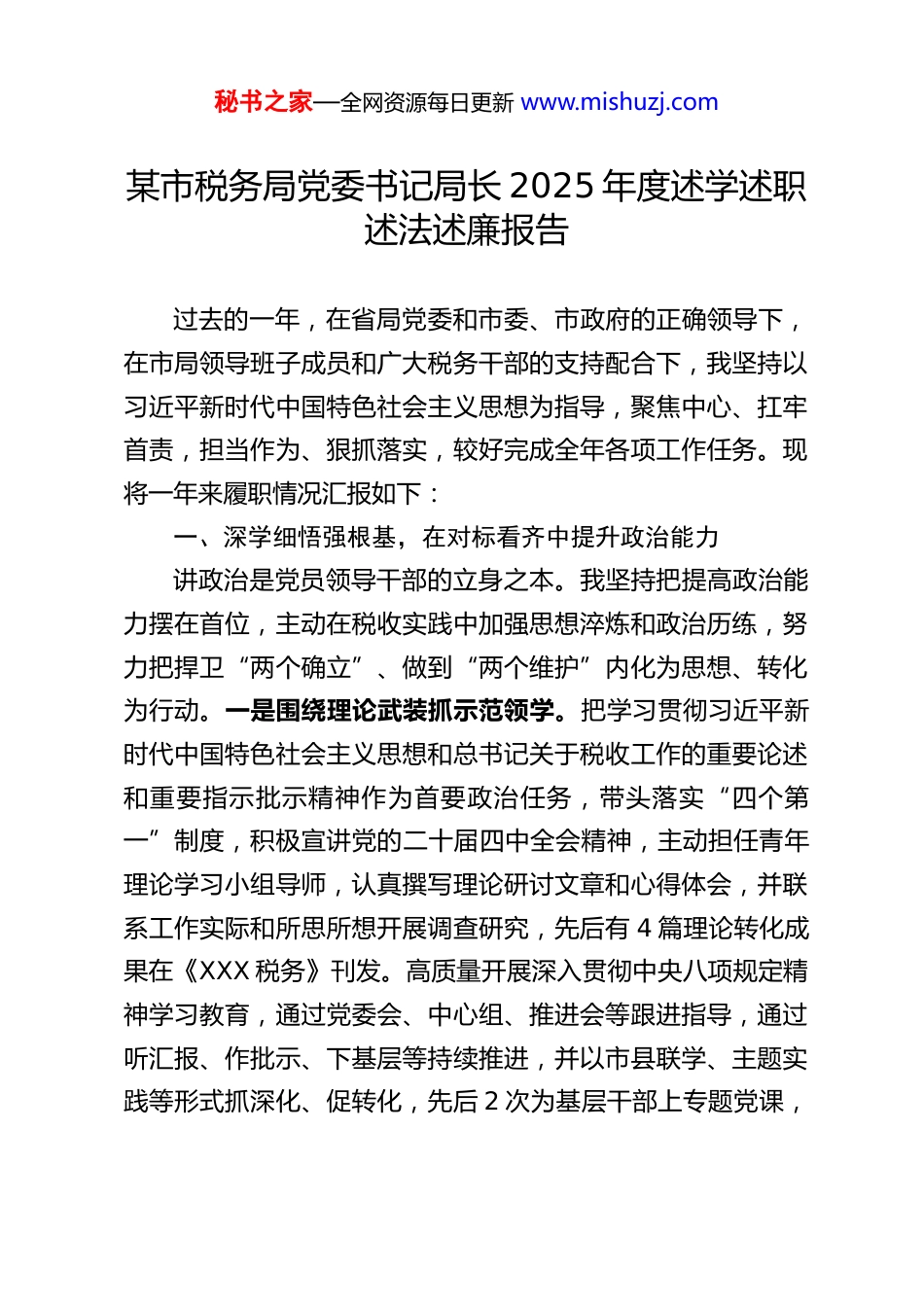 秘书之家—全网资源每日更新 www.mishuzj.com某市税务局党委书记局长 2025 年度述学述职述法述廉报告过去的一年,在省局党委和市委、市政府的正确领导下,在市局领导班子成员和广大税务干部的支持配合下,我坚持以习近平新时代中国特色社会主义思想为指导,聚焦中心、扛牢首责,担当作为、狠抓落实,较好完成全年各项工作任务。现将一年来履职情况汇报如下:一、深学细悟强根基,在对标看齐中提升政治能力讲政治是党员领导干部的立身之本。我坚持把提高政治能力摆在首位,主动在税收实践中加强思想淬炼和政治历练,努力把捍卫“两个确立”、做到“两个维护”内化为思想、转化为行动。一是围绕理论武装抓示范领学。把学习贯彻习近平新时代中国特色社会主义思想和总书记关于税收工作的重要论述和重要指示批示精神作为首要政治任务,带头落实“四个第一”制度,积极宣讲党的二十届四中全会精神,主动担任青年理论学习小组导师,认真撰写理论研讨文章和心得体会,并联系工作实际和所思所想开展调查研究,先后有 4 篇理论转化成果在《XXX 税务》刊发。高质量开展深入贯彻中央八项规定精神学习教育,通过党委会、中心组、推进会等跟进指导,通过听汇报、作批示、下基层等持续推进,并以市县联学、主题实践等形式抓深化、促转化,先后 2 次为基层干部上专题党课,秘书之家—全网资源每日更新 www.mishuzj.com带头查摆整改问题 XX 条。二是围绕党的建设抓规范创建。谋划并牵头推进“抓两头、带中间、强基础”的抓党建“书记项目”,督促领导班子成员落实党建联系点制度,深入基层开展党建和党员管理工作调研,帮助基层解决问题、建强堡垒。以先进支部“导师帮带”、中间支部“分类帮带”、后进支部“驻点帮带”的工作思路,加速推进支部标准化、规范化建设,培育总局“四强”党支部 1 个、省局“四强”党支部 5 个。指导出台党建引领“强基工程”若干措施,形成 6 大类 18 条对策建议,有效引导党员干部在“强基”实践中主动融入、担当作为,工作成效在总局内网党建专栏刊载。三是围绕管党治党抓责任传导。聚焦“两个责任”,以观摩会、样本会形式优化党委与纪检专题会商机制,创新“通报—研判—整改”三步会商法,推动解决主体责任落实不到位、干部监督管理有盲区等问题。坚持严抓严管、常抓常管,年内开展全系统政治生态分析研判 2 次,听取班子成员履行“一岗双责”情况 2 次,面对面与县区局“一把手”、新任科级领导干部、纪检组长、青年干部群体等谈心谈话、明确要求、传导压力。把各级巡视巡察和督察审计发现问题作为关注重点,在对照自查、举一反三的基础上,同步对 XXX 三个县区党委开展政治巡察,发现并督促整改问题 52 条。四是围绕意识形态抓思想防线。扛牢意识形态第一责任,定期开展风险监测和分析研判,对全系统党员和青年干部思想状况进行调查,通过“强基工程”座谈、“七秘书之家—全网资源每日更新 www.mishuzj.com一”主题沙龙等活动,面对面听取各层级党员干部意见建议,时刻把握干部思想动态。落实网络意识形态责任制,优化微信公众号、官方微博等传播阵地,围绕维护法治公平、强化合规管理,开展正反两方面典型案例宣传和曝光,同步加强重点涉访案件指导督办力度,严防涉税舆情风险,营造良好舆论生态。二、担当实干促发展,在攻坚克难中创造过硬业绩敢于担当是党的领导干部必须具备的基本素质。我牢记组织重托和干部群众期待,扛责在肩、履职于行,用具体行动和工作实绩展现担当作为。一是服务保障重大战略。落实服务全国统一大市场建设要求,对违规招商引资涉税问题逢会必讲,指导对 9 个县区开展全覆盖式核查,对相关规范性文件及政策执行情况进行穿透分析,在各级监督检查中均未发现问题。加强出口应征货物税收监管、资源回收企业“反向开票”等重点工作的监督指导,跟进开展监督检查 7 次,确保了党中央及总局、省局关心关注的重大问题在 XX 落地。对接 XXX 协同发展,跟进服务央企 XXX 工作,推动 XX 户央企子公司完成营业收入XX 亿元、产生税收 XXX 万元。二是扛牢抓实主责主业。紧扣组织收入中心任务,既亲自...