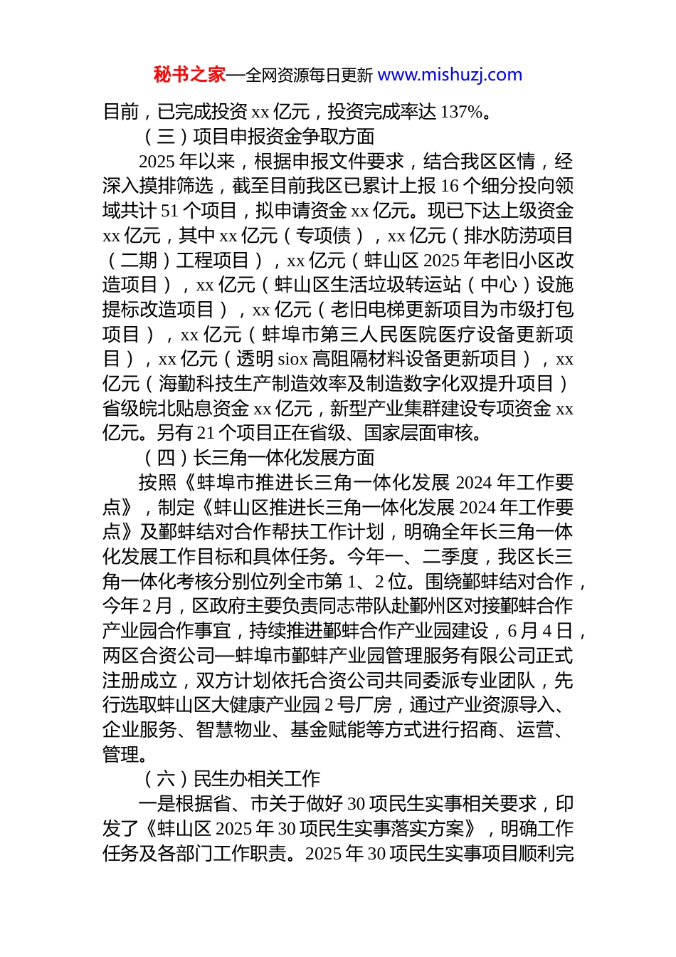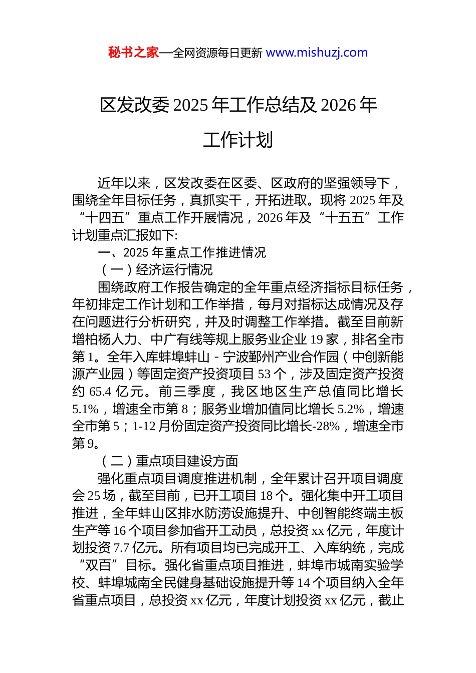秘书之家—全网资源每日更新 www.mishuzj.com区发改委 2025 年工作总结及 2026 年工作计划近年以来,区发改委在区委、区政府的坚强领导下,围绕全年目标任务,真抓实干,开拓进取。现将 2025 年及“十四五”重点工作开展情况,2026 年及“十五五”工作计划重点汇报如下:一、2025 年重点工作推进情况(一)经济运行情况围绕政府工作报告确定的全年重点经济指标目标任务,年初排定工作计划和工作举措,每月对指标达成情况及存在问题进行分析研究,并及时调整工作举措。截至目前新增柏杨人力、中广有线等规上服务业企业 19 家,排名全市第 1。全年入库蚌埠蚌山-宁波鄞州产业合作园(中创新能源产业园)等固定资产投资项目 53 个,涉及固定资产投资约 65.4 亿元。前三季度,我区地区生产总值同比增长5.1%,增速全市第 8;服务业增加值同比增长 5.2%,增速全市第 5;1-12 月份固定资产投资同比增长-28%,增速全市第 9。(二)重点项目建设方面强化重点项目调度推进机制,全年累计召开项目调度会 25 场,截至目前,已开工项目 18 个。强化集中开工项目推进,全年蚌山区排水防涝设施提升、中创智能终端主板生产等 16 个项目参加省开工动员,总投资 xx 亿元,年度计划投资 7.7 亿元。所有项目均已完成开工、入库纳统,完成“双百”目标。强化省重点项目推进,蚌埠市城南实验学校、蚌埠城南全民健身基础设施提升等 14 个项目纳入全年省重点项目,总投资 xx 亿元,年度计划投资 xx 亿元,截止秘书之家—全网资源每日更新 www.mishuzj.com目前,已完成投资 xx 亿元,投资完成率达 137%。(三)项目申报资金争取方面2025 年以来,根据申报文件要求,结合我区区情,经深入摸排筛选,截至目前我区已累计上报 16 个细分投向领域共计 51 个项目,拟申请资金 xx 亿元。现已下达上级资金xx 亿元,其中 xx 亿元(专项债),xx 亿元(排水防涝项目(二期)工程项目),xx 亿元(蚌山区 2025 年老旧小区改造项目),xx 亿元(蚌山区生活垃圾转运站(中心)设施提标改造项目),xx 亿元(老旧电梯更新项目为市级打包项目),xx 亿元(蚌埠市第三人民医院医疗设备更新项目),xx 亿元(透明 siox 高阻隔材料设备更新项目),xx亿元(海勤科技生产制造效率及制造数字化双提升项目)省级皖北贴息资金 xx 亿元,新型产业集群建设专项资金 xx亿元。另有 21 个项目正在省级、国家层面审核。(四)长三角一体化发展方面按照《蚌埠市推进长三角一体化发展 2024 年工作要点》,制定《蚌山区推进长三角一体化发展 2024 年工作要点》及鄞蚌结对合作帮扶工作计划,明确全年长三角一体化发展工作目标和具体任务。今年一、二季度,我区长三角一体化考核分别位列全市第 1、2 位。围绕鄞蚌结对合作,今年 2 月,区政府主要负责同志带队赴鄞州区对接鄞蚌合作产业园合作事宜,持续推进鄞蚌合作产业园建设,6 月 4 日,两区合资公司—蚌埠市鄞蚌产业园管理服务有限公司正式注册成立,双方计划依托合资公司共同委派专业团队,先行选取蚌山区大健康产业园 2 号厂房,通过产业资源导入、企业服务、智慧物业、基金赋能等方式进行招商、运营、管理。(六)民生办相关工作一是根据省、市关于做好 30 项民生实事相关要求,印发了《蚌山区 2025 年 30 项民生实事落实方案》,明确工作任务及各部门工作职责。2025 年 30 项民生实事项目顺利完秘书之家—全网资源每日更新 www.mishuzj.com成年度目标任务。二是扎实推进区人大票决民生实施项目进度,每月定期调度项目工作进度并协调解决项目推进存在的实际问题,升平街西侧口袋公园等 10 个项目全部按期竣工。(七)国防动员相关工作积极配合人武部完成民兵整组工作。参加市应急局、市国动办在淮河文化广场组织开展“5.12 全国防灾减灾日”宣传活动。完成省国动办对国防动员专业队伍的点验工作加快推进军事设施保护工作,即军用运输铁路专线两侧环境整治工作。推动辖区军事设施保护区划定工作,完成“9.18”防空袭疏散演练和“9.16”国防教育日宣传活动。持续推进军事设施保护区划定工作...