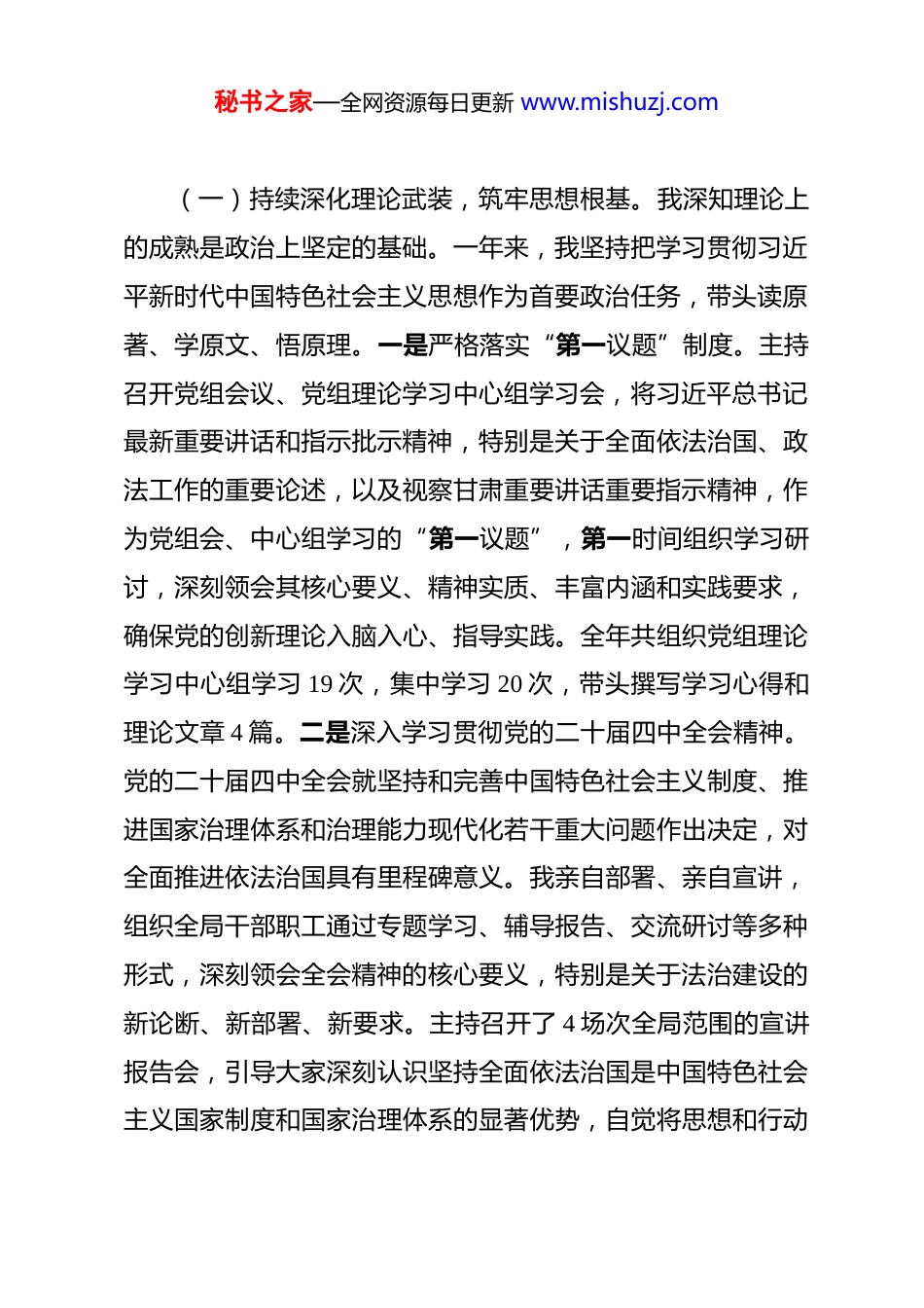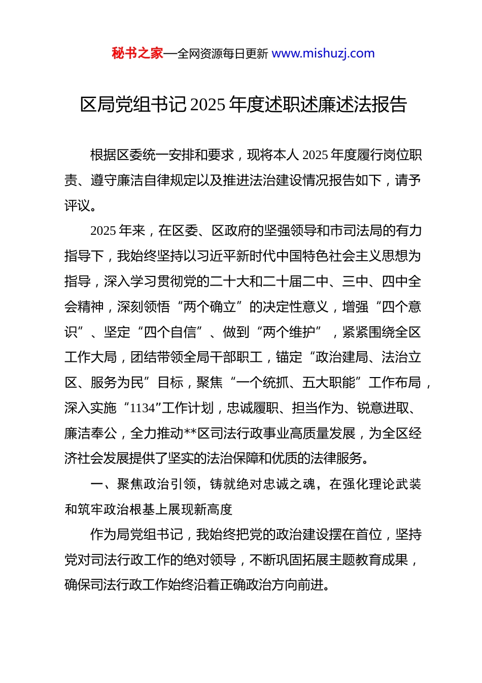 秘书之家—全网资源每日更新 www.mishuzj.com区局党组书记 2025 年度述职述廉述法报告 根据区委统一安排和要求,现将本人 2025 年度履行岗位职责、遵守廉洁自律规定以及推进法治建设情况报告如下,请予评议。2025 年来,在区委、区政府的坚强领导和市司法局的有力指导下,我始终坚持以习近平新时代中国特色社会主义思想为指导,深入学习贯彻党的二十大和二十届二中、三中、四中全会精神,深刻领悟“两个确立”的决定性意义,增强“四个意识”、坚定“四个自信”、做到“两个维护”,紧紧围绕全区工作大局,团结带领全局干部职工,锚定“政治建局、法治立区、服务为民”目标,聚焦“一个统抓、五大职能”工作布局,深入实施“1134”工作计划,忠诚履职、担当作为、锐意进取、廉洁奉公,全力推动**区司法行政事业高质量发展,为全区经济社会发展提供了坚实的法治保障和优质的法律服务。一、聚焦政治引领,铸就绝对忠诚之魂,在强化理论武装和筑牢政治根基上展现新高度作为局党组书记,我始终把党的政治建设摆在首位,坚持党对司法行政工作的绝对领导,不断巩固拓展主题教育成果,确保司法行政工作始终沿着正确政治方向前进。秘书之家—全网资源每日更新 www.mishuzj.com(一)持续深化理论武装,筑牢思想根基。我深知理论上的成熟是政治上坚定的基础。一年来,我坚持把学习贯彻习近平新时代中国特色社会主义思想作为首要政治任务,带头读原著、学原文、悟原理。一是严格落实“第一议题”制度。主持召开党组会议、党组理论学习中心组学习会,将习近平总书记最新重要讲话和指示批示精神,特别是关于全面依法治国、政法工作的重要论述,以及视察甘肃重要讲话重要指示精神,作为党组会、中心组学习的“第一议题”,第一时间组织学习研讨,深刻领会其核心要义、精神实质、丰富内涵和实践要求,确保党的创新理论入脑入心、指导实践。全年共组织党组理论学习中心组学习 19 次,集中学习 20 次,带头撰写学习心得和理论文章 4 篇。二是深入学习贯彻党的二十届四中全会精神。党的二十届四中全会就坚持和完善中国特色社会主义制度、推进国家治理体系和治理能力现代化若干重大问题作出决定,对全面推进依法治国具有里程碑意义。我亲自部署、亲自宣讲,组织全局干部职工通过专题学习、辅导报告、交流研讨等多种形式,深刻领会全会精神的核心要义,特别是关于法治建设的新论断、新部署、新要求。主持召开了 4 场次全局范围的宣讲报告会,引导大家深刻认识坚持全面依法治国是中国特色社会主义国家制度和国家治理体系的显著优势,自觉将思想和行动秘书之家—全网资源每日更新 www.mishuzj.com统一到党中央决策部署上来,切实增强推进法治**建设的责任感和使命感。三是丰富学习形式载体。充分利用“学习强国”、甘肃党建等线上平台,组织开展线上线下相结合的学习活动。通过举办专题讲座、知识竞赛、观看教育片等形式,增强学习的吸引力和感染力,推动理论学习往深里走、往实里走、往心里走。(二)坚决扛起政治责任,确保政令畅通。我始终牢记党组书记是第一责任人,必须不折不扣地将党中央和省委、市委、区委的决策部署落到实处。一是强化政治机关意识。教育引导全局干部职工深刻认识司法行政机关首先是政治机关,必须旗帜鲜明讲政治,不断提高政治判断力、政治领悟力、政治执行力。在工作中,凡重大事项、重要工作、重点案件,均及时向区委请示报告,确保党的路线方针政策在司法行政系统得到全面贯彻。二是严肃党内政治生活。严格执行《关于新形势下党内政治生活的若干准则》,认真落实民主集中制,凡属“三重一大”事项,均经过党组集体讨论决定,充分发扬民主,科学决策。高质量召开了年度民主生活会和专题组织生活会,带头开展批评和自我批评,达到了统一思想、增进团结、改进工作的目的。三是抓实意识形态工作。严格落实意识形态工作责任制,定期分析研判意识形态领域风险,加强对各类阵地管理,秘书之家—全网资源每日更新 www.mishuzj.com特别是对律师、公证、司法鉴定等行业的思想政治引领,确保司法行政领域意识形态安全。二、聚焦主责主业,彰显实干担当之为,在服务全...