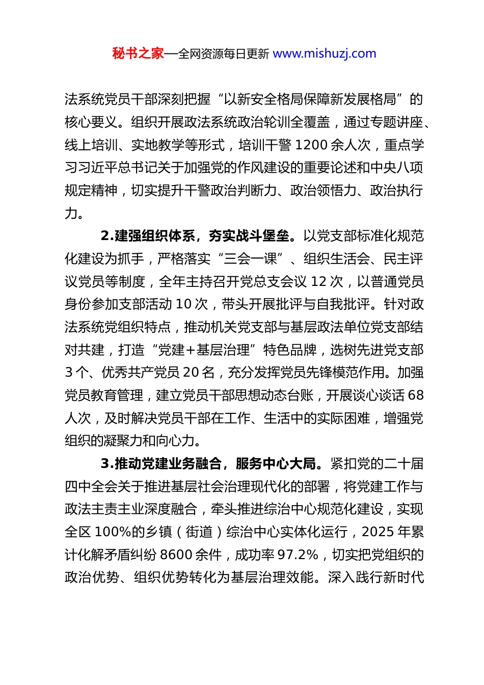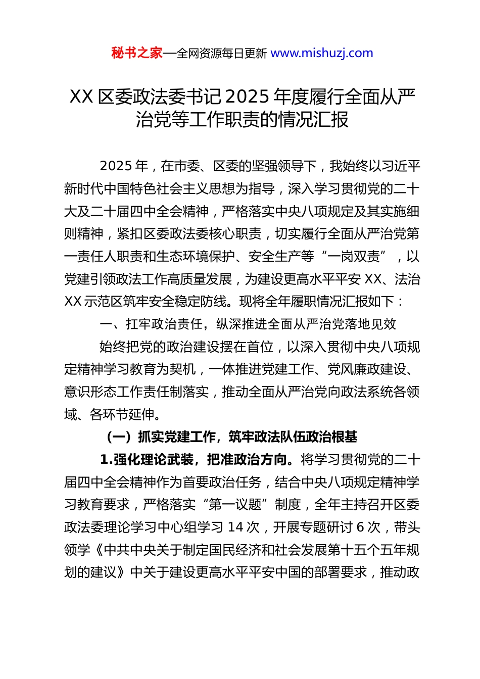 秘书之家—全网资源每日更新 www.mishuzj.comXX 区委政法委书记 2025 年度履行全面从严治党等工作职责的情况汇报2025 年,在市委、区委的坚强领导下,我始终以习近平新时代中国特色社会主义思想为指导,深入学习贯彻党的二十大及二十届四中全会精神,严格落实中央八项规定及其实施细则精神,紧扣区委政法委核心职责,切实履行全面从严治党第一责任人职责和生态环境保护、安全生产等“一岗双责”,以党建引领政法工作高质量发展,为建设更高水平平安 XX、法治XX 示范区筑牢安全稳定防线。现将全年履职情况汇报如下:一、扛牢政治责任,纵深推进全面从严治党落地见效始终把党的政治建设摆在首位,以深入贯彻中央八项规定精神学习教育为契机,一体推进党建工作、党风廉政建设、意识形态工作责任制落实,推动全面从严治党向政法系统各领域、各环节延伸。(一)抓实党建工作,筑牢政法队伍政治根基1.强化理论武装,把准政治方向。将学习贯彻党的二十届四中全会精神作为首要政治任务,结合中央八项规定精神学习教育要求,严格落实“第一议题”制度,全年主持召开区委政法委理论学习中心组学习 14 次,开展专题研讨 6 次,带头领学《中共中央关于制定国民经济和社会发展第十五个五年规划的建议》中关于建设更高水平平安中国的部署要求,推动政秘书之家—全网资源每日更新 www.mishuzj.com法系统党员干部深刻把握“以新安全格局保障新发展格局”的核心要义。组织开展政法系统政治轮训全覆盖,通过专题讲座、线上培训、实地教学等形式,培训干警 1200 余人次,重点学习习近平总书记关于加强党的作风建设的重要论述和中央八项规定精神,切实提升干警政治判断力、政治领悟力、政治执行力。2.建强组织体系,夯实战斗堡垒。以党支部标准化规范化建设为抓手,严格落实“三会一课”、组织生活会、民主评议党员等制度,全年主持召开党总支会议 12 次,以普通党员身份参加支部活动 10 次,带头开展批评与自我批评。针对政法系统党组织特点,推动机关党支部与基层政法单位党支部结对共建,打造“党建+基层治理”特色品牌,选树先进党支部3 个、优秀共产党员 20 名,充分发挥党员先锋模范作用。加强党员教育管理,建立党员干部思想动态台账,开展谈心谈话 68人次,及时解决党员干部在工作、生活中的实际困难,增强党组织的凝聚力和向心力。3.推动党建业务融合,服务中心大局。紧扣党的二十届四中全会关于推进基层社会治理现代化的部署,将党建工作与政法主责主业深度融合,牵头推进综治中心规范化建设,实现全区 100%的乡镇(街道)综治中心实体化运行,2025 年累计化解矛盾纠纷 8600 余件,成功率 97.2%,切实把党组织的政治优势、组织优势转化为基层治理效能。深入践行新时代秘书之家—全网资源每日更新 www.mishuzj.com“枫桥经验”,推动政法力量下沉网格,组建“党员政法先锋队”28 支,参与网格治理、矛盾化解、普法宣传等工作,全年累计开展志愿服务活动 150 余次,服务群众 2 万余人次。(二)从严党风廉政建设,涵养风清气正政治生态1.压实主体责任,层层传导压力。切实履行党风廉政建设第一责任人职责,制定《区委政法委 2025 年党风廉政建设责任清单》,将责任分解到班子成员、各科室及基层政法单位,全年主持召开党风廉政建设专题会议 4 次,研究部署正风肃纪工作,与班子成员、下属单位负责人签订党风廉政建设责任书32 份,形成“一级抓一级、层层抓落实”的工作格局。严格落实党风廉政建设责任制考核,将考核结果与干部评优评先、选拔任用挂钩,倒逼责任落实。2.深化作风建设,落实八项规定。按照中央八项规定精神学习教育“学查改”一体推进要求,组织政法系统开展作风建设专项整治,重点排查形式主义、官僚主义突出问题,累计查摆问题 45 项,制定整改措施 52 条,全部整改到位。带头执行中央八项规定精神,精简会议文件,全年会议数量同比下降20%,发文数量同比下降 15%;严格执行公务接待、公车使用等制度,坚决杜绝违规吃喝、违规收送礼品礼金等行为。深化警示教育,组织干警观看《“头雁”折翅》等警示教育片 6次,编印政法系统违纪...