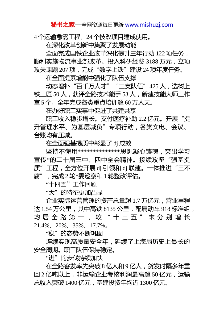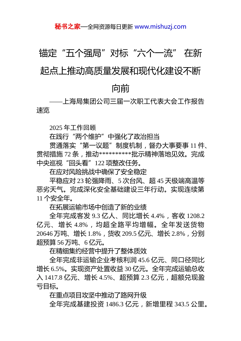 秘书之家—全网资源每日更新 www.mishuzj.com锚定“五个强局”对标“六个一流” 在新起点上推动高质量发展和现代化建设不断向前——上海局集团公司三届一次职工代表大会工作报告速览2025 年工作回顾在践行“两个维护”中强化了政治担当贯通落实“第一议题”制度机制,督办大事要事 11 件、贯彻措施 72 条,推动**********批示精神落地见效。完成中央巡视“回头看”122 项整改任务。在应对风险挑战中确保了安全稳定平稳应对 23 轮强降雨、5 次台风、超 45 天极端高温等恶劣天气。完成深化安全基础建设三年行动。实现连续第11 个安全年。在拓展运输市场中创造了新的业绩全年完成客发 9.3 亿人、同比增长 4.4%,客收 1208.2亿元、增长 4.8%,均超全路平均增幅。全年发送货物20646 万吨、增长 1.8%,货收 209.5 亿元、增长 2.8%,分别超预算 56 万吨、6 亿元。在精细集约经营中提升了整体质效全年完成非运输企业考核利润 45.6 亿元、同口径同比增长 6.5%。实现资产处置收益 30 亿元。全年完成运输总收入 1417.8 亿元、增长 4.5%、超预算 2.3 亿元,超额兑现盈亏目标。在重点项目攻坚中推动了路网升级全年完成基建投资 1486.3 亿元,新增里程 343.5 公里。秘书之家—全网资源每日更新 www.mishuzj.com4 个运输急需工程、24 个技改项目建成使用。在深化改革创新中集聚了发展动能全面完成国铁企业改革深化提升三年行动 122 项任务,顺利实施物流事业部改革。投入科研经费 3188 万元,立项攻关课题 207 项,完成“数字上铁”建设 24 项年度任务。在全面提素增能中强化了队伍支撑动态增补“百千万人才”“三支队伍”425 人,选树上铁工匠 50 人,获评全路技术能手 53 人,新建技能大师工作室 5 个。全年完成各类重点培训超 60 万人天。在办好职工实事中促进了共建共享职工收入稳步增长。支付医疗补助 2.2 亿元。开展“提升管理水平、为基层减负”专项行动,各类文电、会议、台账均有压减。在全面强基提质中彰显了 dj 成效坚持不懈用**************思想凝心铸魂,突出学习宣传*的二十届三中、四中全会精神。接续攻坚“强基提质”工程,全方位开展 dj 引领和 dj 联建。一体推进“三不腐”,完成 2 轮*委巡察和 1 轮整改评估。“十四五”工作回顾“大”的特征更加凸显企业实际运营管理的资产总量超 1.7 万亿元,营业里程达 1.54 万公里,其中高铁 8135 公里,配属动车 918 标准组,均 居 全 路 第 一 , 较 “ 十 三 五 ” 末 分 别 增 长21.4%、20%、35%、17.7%。“稳”的态势不断巩固连续实现高质量安全年,延续了上海局历史上最长的安全周期。职工队伍保持稳定。“进”的步伐持续加快在全路客发率先突破 8 亿人和 9 亿人,货发时隔多年重回 2 亿吨以上,非运输企业考核利润最高超 50 亿元,运输总收入突破 1400 亿元,基建投资年均近 1300 亿元。秘书之家—全网资源每日更新 www.mishuzj.com“人”的合力充分凝聚职工收入实现稳步增长。累计建成交付保障性住房8000 余套。投入“三线”建设资金 13.2 亿元。助困助医助学 49 万人次、4 亿元,职工获得感归属感、企业凝聚力向心力不断增强。2026 年集团公司工作总的要求坚持以**************思想为指导,全面贯彻落实*的二十大和二十届历次全会精神以及中央经济工作会议精神深入学习贯彻******对中央企业和铁路工作的****批示精神,认真落实国铁集团*组部署,聚焦全面建成一流的现代运输企业,坚持以当好排头兵为己任、以深化改革创新为动力,深入运用“五有”工作法,更好统筹发展和安全,全力抓好运输经营、铁路建设、改革管理、科技创新等重点工作,坚定不移推进全面从严治*,实现“十五五”良好开局,努力为加快建设世界一流铁路企业贡献更多上铁力量。2026 年及“十五五”时期面临的形势任务*的二十届四中全会审议通过的“十五五”规划建议,擘画了中国未来五年的发展蓝图。国铁集团工作会议要求全路认真贯彻全会精神,聚焦路网规模质量、运输保障能力、科技创新水平、企业经营质效、铁路治理体系“五个世界一...