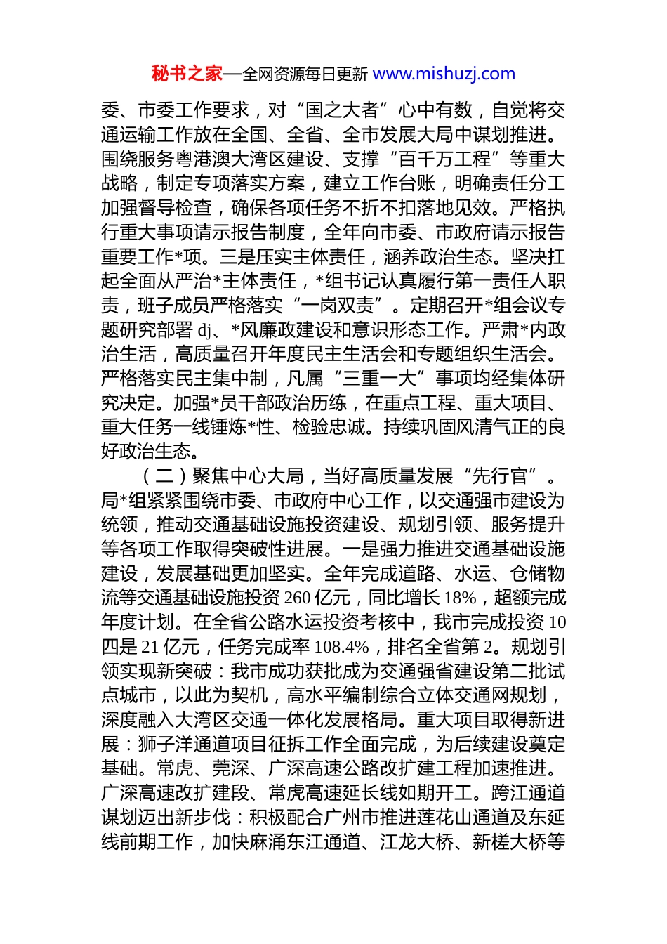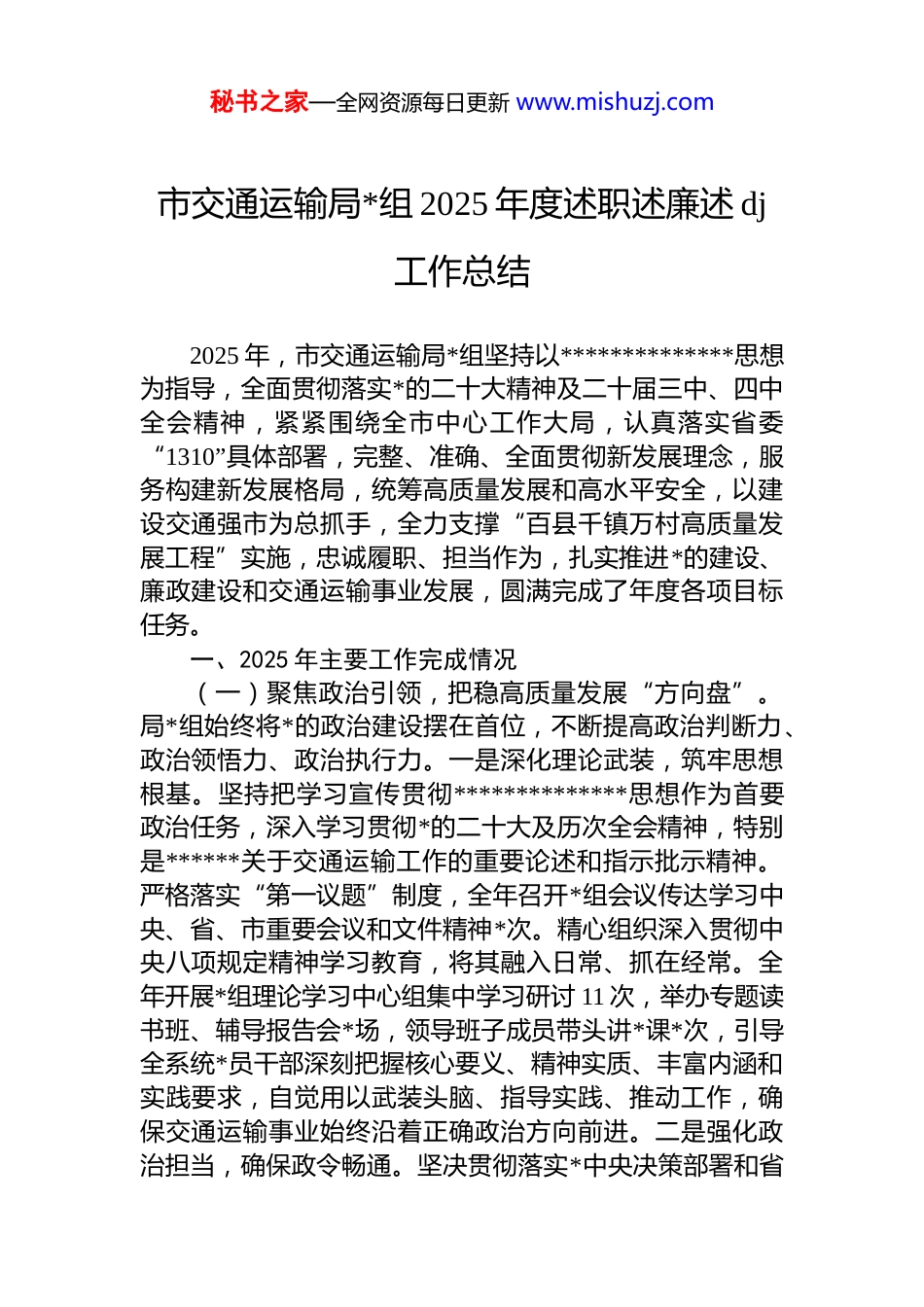 秘书之家—全网资源每日更新 www.mishuzj.com市交通运输局*组 2025 年度述职述廉述 dj工作总结2025 年,市交通运输局*组坚持以**************思想为指导,全面贯彻落实*的二十大精神及二十届三中、四中全会精神,紧紧围绕全市中心工作大局,认真落实省委“1310”具体部署,完整、准确、全面贯彻新发展理念,服务构建新发展格局,统筹高质量发展和高水平安全,以建设交通强市为总抓手,全力支撑“百县千镇万村高质量发展工程”实施,忠诚履职、担当作为,扎实推进*的建设、廉政建设和交通运输事业发展,圆满完成了年度各项目标任务。一、2025 年主要工作完成情况(一)聚焦政治引领,把稳高质量发展“方向盘”。局*组始终将*的政治建设摆在首位,不断提高政治判断力、政治领悟力、政治执行力。一是深化理论武装,筑牢思想根基。坚持把学习宣传贯彻**************思想作为首要政治任务,深入学习贯彻*的二十大及历次全会精神,特别是******关于交通运输工作的重要论述和指示批示精神。严格落实“第一议题”制度,全年召开*组会议传达学习中央、省、市重要会议和文件精神*次。精心组织深入贯彻中央八项规定精神学习教育,将其融入日常、抓在经常。全年开展*组理论学习中心组集中学习研讨 11 次,举办专题读书班、辅导报告会*场,领导班子成员带头讲*课*次,引导全系统*员干部深刻把握核心要义、精神实质、丰富内涵和实践要求,自觉用以武装头脑、指导实践、推动工作,确保交通运输事业始终沿着正确政治方向前进。二是强化政治担当,确保政令畅通。坚决贯彻落实*中央决策部署和省秘书之家—全网资源每日更新 www.mishuzj.com委、市委工作要求,对“国之大者”心中有数,自觉将交通运输工作放在全国、全省、全市发展大局中谋划推进。围绕服务粤港澳大湾区建设、支撑“百千万工程”等重大战略,制定专项落实方案,建立工作台账,明确责任分工加强督导检查,确保各项任务不折不扣落地见效。严格执行重大事项请示报告制度,全年向市委、市政府请示报告重要工作*项。三是压实主体责任,涵养政治生态。坚决扛起全面从严治*主体责任,*组书记认真履行第一责任人职责,班子成员严格落实“一岗双责”。定期召开*组会议专题研究部署 dj、*风廉政建设和意识形态工作。严肃*内政治生活,高质量召开年度民主生活会和专题组织生活会。严格落实民主集中制,凡属“三重一大”事项均经集体研究决定。加强*员干部政治历练,在重点工程、重大项目、重大任务一线锤炼*性、检验忠诚。持续巩固风清气正的良好政治生态。(二)聚焦中心大局,当好高质量发展“先行官”。局*组紧紧围绕市委、市政府中心工作,以交通强市建设为统领,推动交通基础设施投资建设、规划引领、服务提升等各项工作取得突破性进展。一是强力推进交通基础设施建设,发展基础更加坚实。全年完成道路、水运、仓储物流等交通基础设施投资 260 亿元,同比增长 18%,超额完成年度计划。在全省公路水运投资考核中,我市完成投资 10四是 21 亿元,任务完成率 108.4%,排名全省第 2。规划引领实现新突破:我市成功获批成为交通强省建设第二批试点城市,以此为契机,高水平编制综合立体交通网规划,深度融入大湾区交通一体化发展格局。重大项目取得新进展:狮子洋通道项目征拆工作全面完成,为后续建设奠定基础。常虎、莞深、广深高速公路改扩建工程加速推进。广深高速改扩建段、常虎高速延长线如期开工。跨江通道谋划迈出新步伐:积极配合广州市推进莲花山通道及东延线前期工作,加快麻涌东江通道、江龙大桥、新槎大桥等秘书之家—全网资源每日更新 www.mishuzj.com对接广州的干线通道前期研究,加密跨珠江口通道布局。重点片区交通网络持续完善:科学城通道段二期、环莞快速路三期西段、白沙南路配套工程等重点项目开工建设,环莞快速路三期东段常平岗梓片区路网完善工程启动,着力构建重点片区、重点平台 30 分钟交通圈。港口环保设施树立新标杆:港口船舶污染物接收处置公共中心项目建成投用,成为华南地区最大的近海污染防治综合处置中心,为绿色港口建设提供有力支撑。二是精细实施交通综合治理,城乡环境更加宜居。以...