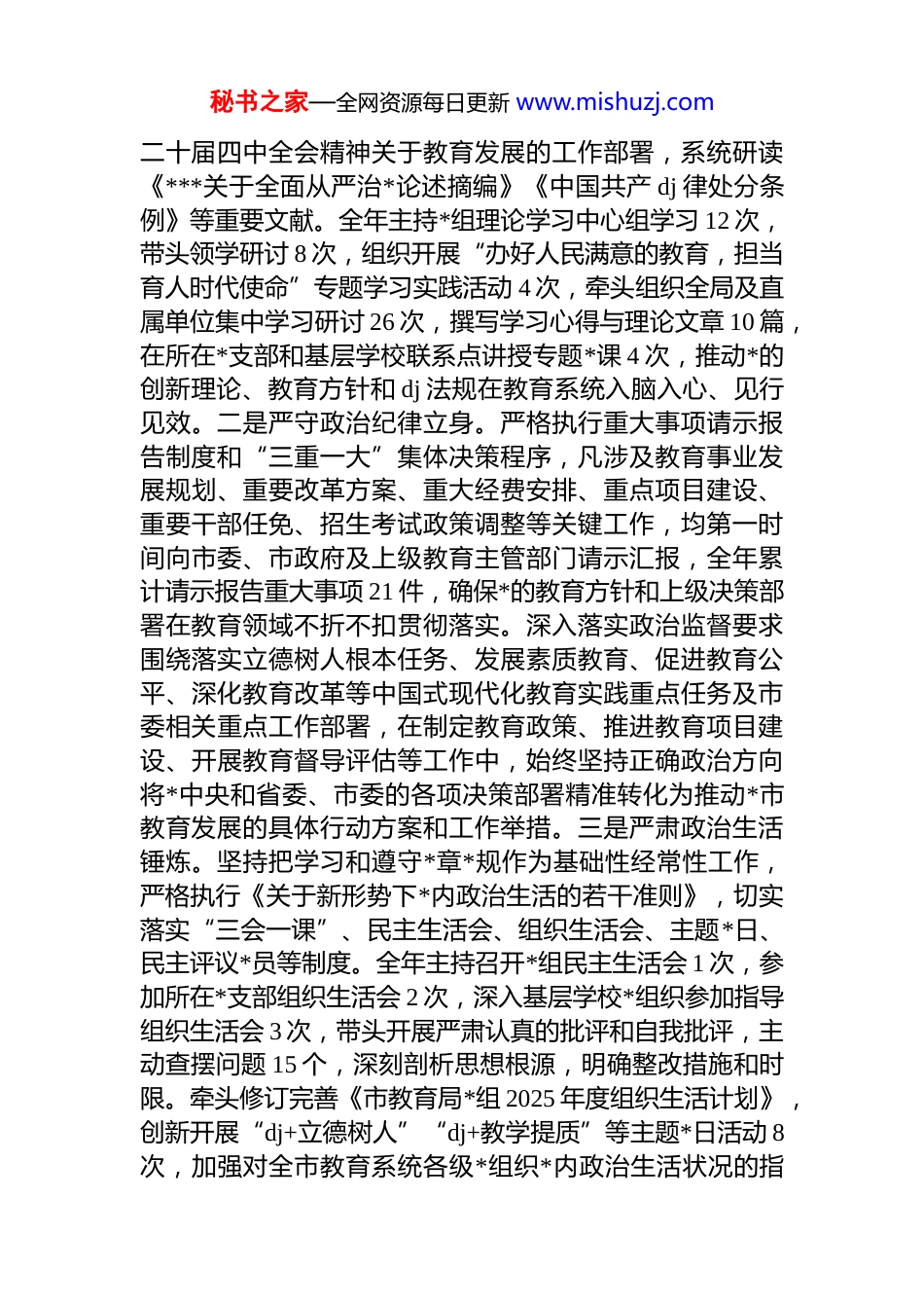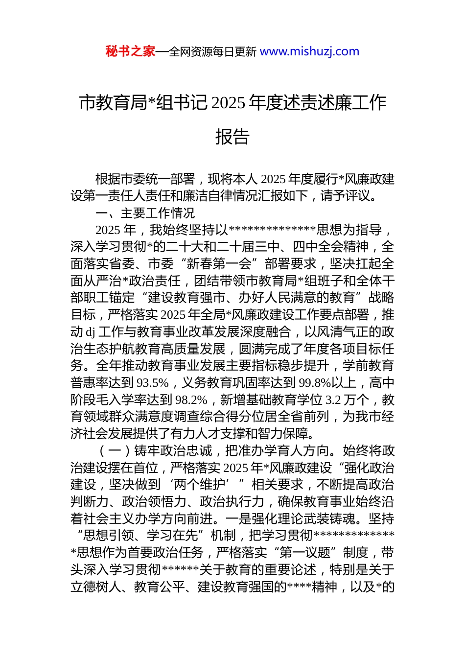 秘书之家—全网资源每日更新 www.mishuzj.com市教育局*组书记 2025 年度述责述廉工作报告根据市委统一部署,现将本人 2025 年度履行*风廉政建设第一责任人责任和廉洁自律情况汇报如下,请予评议。一、主要工作情况2025 年,我始终坚持以**************思想为指导,深入学习贯彻*的二十大和二十届三中、四中全会精神,全面落实省委、市委“新春第一会”部署要求,坚决扛起全面从严治*政治责任,团结带领市教育局*组班子和全体干部职工锚定“建设教育强市、办好人民满意的教育”战略目标,严格落实 2025 年全局*风廉政建设工作要点部署,推动 dj 工作与教育事业改革发展深度融合,以风清气正的政治生态护航教育高质量发展,圆满完成了年度各项目标任务。全年推动教育事业发展主要指标稳步提升,学前教育普惠率达到 93.5%,义务教育巩固率达到 99.8%以上,高中阶段毛入学率达到 98.2%,新增基础教育学位 3.2 万个,教育领域群众满意度调查综合得分位居全省前列,为我市经济社会发展提供了有力人才支撑和智力保障。(一)铸牢政治忠诚,把准办学育人方向。始终将政治建设摆在首位,严格落实 2025 年*风廉政建设“强化政治建设,坚决做到‘两个维护’”相关要求,不断提高政治判断力、政治领悟力、政治执行力,确保教育事业始终沿着社会主义办学方向前进。一是强化理论武装铸魂。坚持“思想引领、学习在先”机制,把学习贯彻**************思想作为首要政治任务,严格落实“第一议题”制度,带头深入学习贯彻******关于教育的重要论述,特别是关于立德树人、教育公平、建设教育强国的****精神,以及*的秘书之家—全网资源每日更新 www.mishuzj.com二十届四中全会精神关于教育发展的工作部署,系统研读《***关于全面从严治*论述摘编》《中国共产 dj 律处分条例》等重要文献。全年主持*组理论学习中心组学习 12 次,带头领学研讨 8 次,组织开展“办好人民满意的教育,担当育人时代使命”专题学习实践活动 4 次,牵头组织全局及直属单位集中学习研讨 26 次,撰写学习心得与理论文章 10 篇,在所在*支部和基层学校联系点讲授专题*课 4 次,推动*的创新理论、教育方针和 dj 法规在教育系统入脑入心、见行见效。二是严守政治纪律立身。严格执行重大事项请示报告制度和“三重一大”集体决策程序,凡涉及教育事业发展规划、重要改革方案、重大经费安排、重点项目建设、重要干部任免、招生考试政策调整等关键工作,均第一时间向市委、市政府及上级教育主管部门请示汇报,全年累计请示报告重大事项 21 件,确保*的教育方针和上级决策部署在教育领域不折不扣贯彻落实。深入落实政治监督要求围绕落实立德树人根本任务、发展素质教育、促进教育公平、深化教育改革等中国式现代化教育实践重点任务及市委相关重点工作部署,在制定教育政策、推进教育项目建设、开展教育督导评估等工作中,始终坚持正确政治方向将*中央和省委、市委的各项决策部署精准转化为推动*市教育发展的具体行动方案和工作举措。三是严肃政治生活锤炼。坚持把学习和遵守*章*规作为基础性经常性工作,严格执行《关于新形势下*内政治生活的若干准则》,切实落实“三会一课”、民主生活会、组织生活会、主题*日、民主评议*员等制度。全年主持召开*组民主生活会 1 次,参加所在*支部组织生活会 2 次,深入基层学校*组织参加指导组织生活会 3 次,带头开展严肃认真的批评和自我批评,主动查摆问题 15 个,深刻剖析思想根源,明确整改措施和时限。牵头修订完善《市教育局*组 2025 年度组织生活计划》,创新开展“dj+立德树人”“dj+教学提质”等主题*日活动 8次,加强对全市教育系统各级*组织*内政治生活状况的指秘书之家—全网资源每日更新 www.mishuzj.com导和监督检查,着力增强*内政治生活的政治性、时代性、原则性、战斗性,营造了风清气正、潜心育人的良好政治生态。(二)扛牢政治责任,深化教育系统全面从严治*。始终坚持把抓好 dj 作为最大政绩,严格落实 2025 年*风廉政建设“压实主体责任”相关要求,认真履行全面从严治*第一责任人职责,推动班子成员落实“一岗双责”...