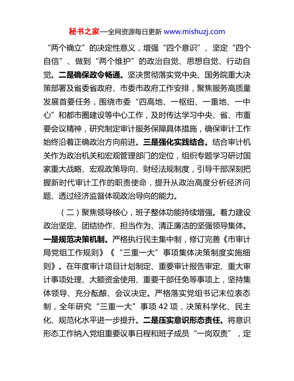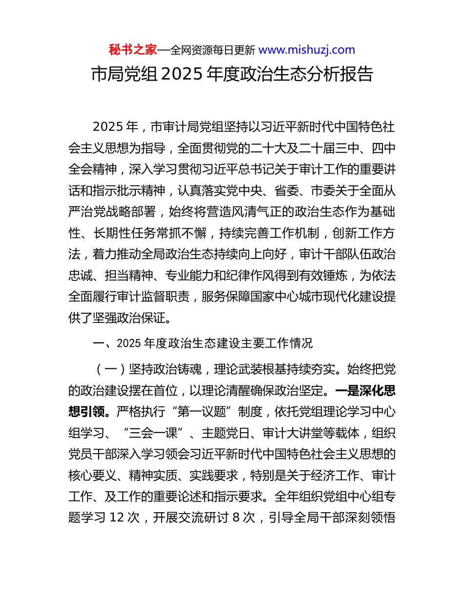 秘书之家—全网资源每日更新 www.mishuzj.com市局党组 2025 年度政治生态分析报告2025 年,市审计局党组坚持以习近平新时代中国特色社会主义思想为指导,全面贯彻党的二十大及二十届三中、四中全会精神,深入学习贯彻习近平总书记关于审计工作的重要讲话和指示批示精神,认真落实党中央、省委、市委关于全面从严治党战略部署,始终将营造风清气正的政治生态作为基础性、长期性任务常抓不懈,持续完善工作机制,创新工作方法,着力推动全局政治生态持续向上向好,审计干部队伍政治忠诚、担当精神、专业能力和纪律作风得到有效锤炼,为依法全面履行审计监督职责,服务保障国家中心城市现代化建设提供了坚强政治保证。一、2025 年度政治生态建设主要工作情况(一)坚持政治铸魂,理论武装根基持续夯实。始终把党的政治建设摆在首位,以理论清醒确保政治坚定。一是深化思想引领。严格执行“第一议题”制度,依托党组理论学习中心组学习、“三会一课”、主题党日、审计大讲堂等载体,组织党员干部深入学习领会习近平新时代中国特色社会主义思想的核心要义、精神实质、实践要求,特别是关于经济工作、审计工作、及工作的重要论述和指示要求。全年组织党组中心组专题学习 12 次,开展交流研讨 8 次,引导全局干部深刻领悟秘书之家—全网资源每日更新 www.mishuzj.com“两个确立”的决定性意义,增强“四个意识”、坚定“四个自信”、做到“两个维护”的政治自觉、思想自觉、行动自觉。二是确保政令畅通。坚决贯彻落实党中央、国务院重大决策部署及省委省政府、市委市政府工作安排,聚焦服务高质量发展首要任务,围绕市委“四高地、一枢纽、一重地、一中心”和都市圈建设等中心工作,及时传达学习中央、省、市重要会议精神,研究制定审计服务保障具体措施,确保审计工作始终沿着正确政治方向前进。三是强化实践结合。结合审计机关作为政治机关和宏观管理部门的定位,组织专题学习研讨国家重大战略、宏观政策导向、财经法规制度,引导干部深刻把握新时代审计工作的职责使命,提升从政治高度分析经济问题、透过经济监督体现政治导向的能力。(二)聚焦领导核心,班子整体功能持续增强。着力建设政治坚定、团结协作、担当作为、清正廉洁的坚强领导集体。一是规范决策机制。严格执行民主集中制,修订完善《市审计局党组工作规则》《“三重一大”事项集体决策制度实施细则》。在年度审计项目计划制定、重要审计报告审定、重大审计事项处理、大额资金使用、重要干部任免等事项上,坚持集体领导、充分酝酿、会议决定。严格落实党组书记末位表态制,全年研究“三重一大”事项 42 项,决策科学化、民主化、规范化水平进一步提升。二是压实意识形态责任。将意识形态工作纳入党组重要议事日程和班子成员“一岗双责”,定秘书之家—全网资源每日更新 www.mishuzj.com期分析研判意识形态领域风险。加强对审计门户网站、微信公众号、工作群等阵地的管理,严格审核对外发布信息、审计结果公告、宣传报道等内容。密切关注审计领域可能出现的意识形态风险点,强化对审计干部网络言行的引导和管理,筑牢意识形态安全防线。三是夯实组织基础。制定《2025 年市审计局党的建设工作要点》,持续推进党支部标准化规范化建设。圆满完成机关党支部换届工作。深化“党建+审计”融合模式,结合审计项目临时党小组建设,开展“党旗在审计一线飘扬”等特色品牌活动,推动党建工作与审计业务同部署、同落实、同检查,有效提升了基层党组织的政治功能和组织力。(三)压实主体责任,管党治党责任持续传导。坚定不移推进全面从严治党向纵深发展、向基层延伸。一是拧紧责任链条。年初召开全市审计机关全面从严治党工作会议,制定印发《2025 年市审计局党组落实全面从严治党主体责任清单》《党风廉政建设和反腐败工作要点》。党组书记认真履行第一责任人职责,班子成员扎实履行“一岗双责”,层层签订党风廉政建设责任书和廉洁从审承诺书,将压力传导到每一个处室、每一个审计组、每一名党员干部。二是抓实清单管理。动态更新完善局党组、党组书记、班子成员落实全面从严治党主体责任“两个清单”(责任清单、...