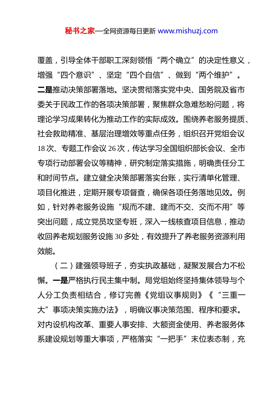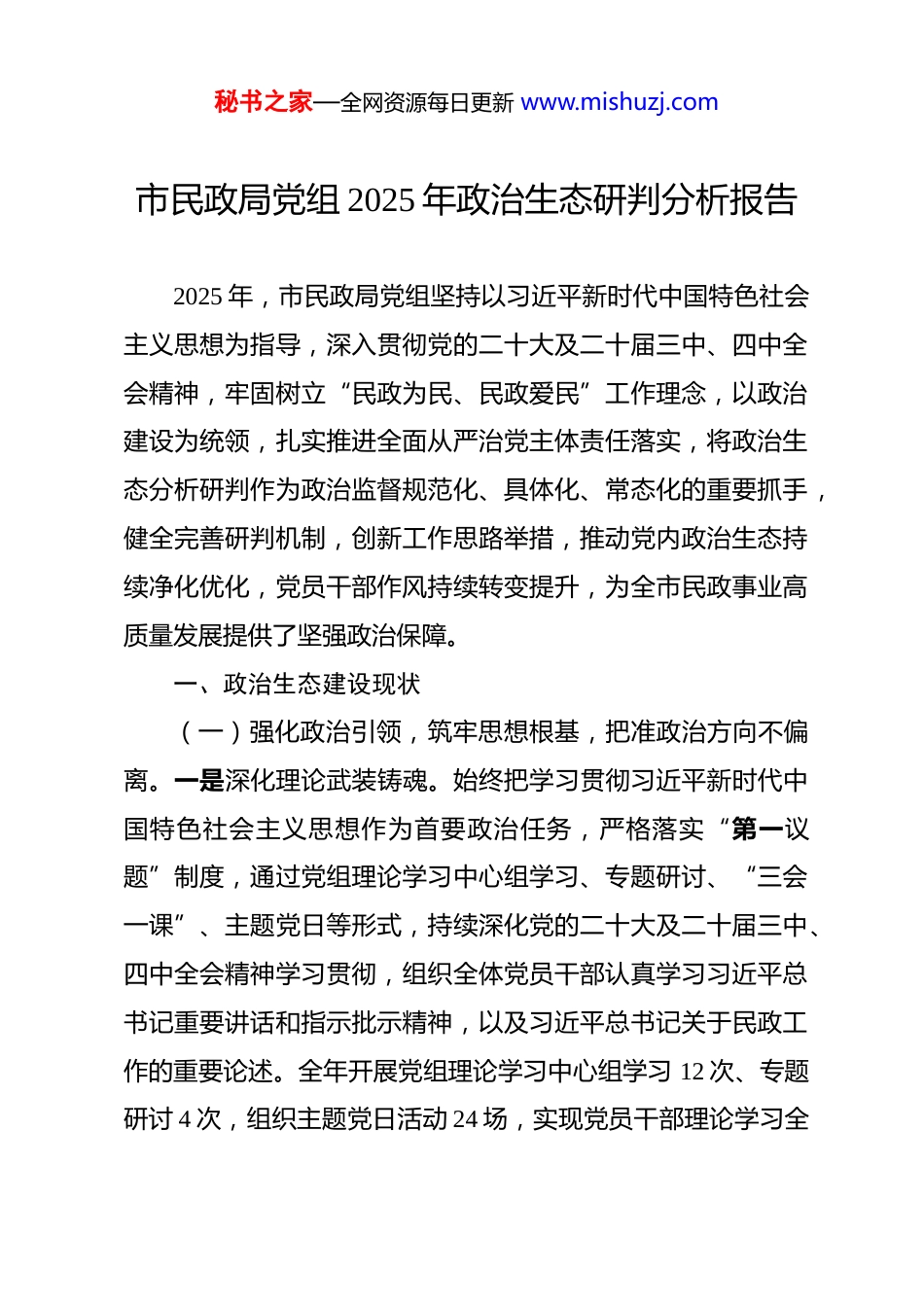 秘书之家—全网资源每日更新 www.mishuzj.com市民政局党组 2025 年政治生态研判分析报告 2025 年,市民政局党组坚持以习近平新时代中国特色社会主义思想为指导,深入贯彻党的二十大及二十届三中、四中全会精神,牢固树立“民政为民、民政爱民”工作理念,以政治建设为统领,扎实推进全面从严治党主体责任落实,将政治生态分析研判作为政治监督规范化、具体化、常态化的重要抓手,健全完善研判机制,创新工作思路举措,推动党内政治生态持续净化优化,党员干部作风持续转变提升,为全市民政事业高质量发展提供了坚强政治保障。一、政治生态建设现状(一)强化政治引领,筑牢思想根基,把准政治方向不偏离。一是深化理论武装铸魂。始终把学习贯彻习近平新时代中国特色社会主义思想作为首要政治任务,严格落实“第一议题”制度,通过党组理论学习中心组学习、专题研讨、“三会一课”、主题党日等形式,持续深化党的二十大及二十届三中、四中全会精神学习贯彻,组织全体党员干部认真学习习近平总书记重要讲话和指示批示精神,以及习近平总书记关于民政工作的重要论述。全年开展党组理论学习中心组学习 12 次、专题研讨 4 次,组织主题党日活动 24 场,实现党员干部理论学习全秘书之家—全网资源每日更新 www.mishuzj.com覆盖,引导全体干部职工深刻领悟“两个确立”的决定性意义,增强“四个意识”、坚定“四个自信”、做到“两个维护”。二是推动决策部署落地。坚决贯彻落实党中央、国务院及省市委关于民政工作的各项决策部署,聚焦群众急难愁盼问题,将理论学习成果转化为推动工作的实际成效。围绕养老服务提质、社会救助精准、基层治理增效等重点任务,组织召开党组会议18 次、专题工作会议 26 次,传达学习全国组织部长会议、全市专项行动部署会议等精神,研究制定落实措施,明确责任分工和时间节点。建立健全决策部署落实台账,实行清单化管理、项目化推进,定期开展专项督查,确保各项任务落地见效。例如,针对养老服务设施“规而不建、建而不交、交而不用”等突出问题,成立党员攻坚专班,深入一线核查项目信息,推动收回养老规划服务设施 30 多处,有效提升了养老服务资源利用效能。(二)建强领导班子,夯实执政基础,凝聚发展合力不松懈。一是严格执行民主集中制。局党组始终坚持集体领导与个人分工负责相结合,修订完善《党组议事规则》《“三重一大”事项决策实施办法》,明确议事决策范围、程序和要求。对内设机构改革、重要人事安排、大额资金使用、养老服务体系建设规划等重大事项,严格落实“一把手”末位表态制,充秘书之家—全网资源每日更新 www.mishuzj.com分发扬民主,广泛征求意见,做到集体研究、民主决策、科学决策。全年共召开党组议事决策会议 15 次,研究“三重一大”事项 42 项,确保决策过程规范、结果公正。班子成员分工明确、各负其责,相互支持、密切配合,形成了团结协作、敢于担当、善于作为的良好工作格局。二是压实意识形态工作责任。将意识形态工作纳入党建工作责任制和年度考核重要内容,完善意识形态工作领导小组职能,健全“党组统一领导、分管领导具体负责、各科室协同配合”的工作机制,形成一级抓一级、层层抓落实的责任链条。定期分析研判意识形态领域形势,利用“三会一课”、集体学习等形式,组织学习意识形态工作相关文件和案例通报,引导干部职工时刻绷紧意识形态安全这根弦。加强对局官网、微信公众号等宣传阵地的管理,严格落实信息发布审核制度,全年发布各类信息 300 余条,无不良信息传播情况。密切关注民政领域热点问题,及时回应社会关切,有效防范化解意识形态风险。三是深化党建业务融合。坚持以党建为引领,召开党组会议专题研究党建工作 4 次,研究制定《2025 年党建工作要点》,明确党建与业务融合发展举措。扎实推进党支部标准化规范化建设,完成 4 个党支部换届工作,培育先进党支部 2 个。聚焦养老服务、社会救助等核心业务,创新开展“党建+民政服务”品牌创建活动,推动党员干部在秘书之家—全网资源每日更新 www.mishuzj.com银发助餐点建设、居家养老服务、困境儿童帮扶等一线亮身...