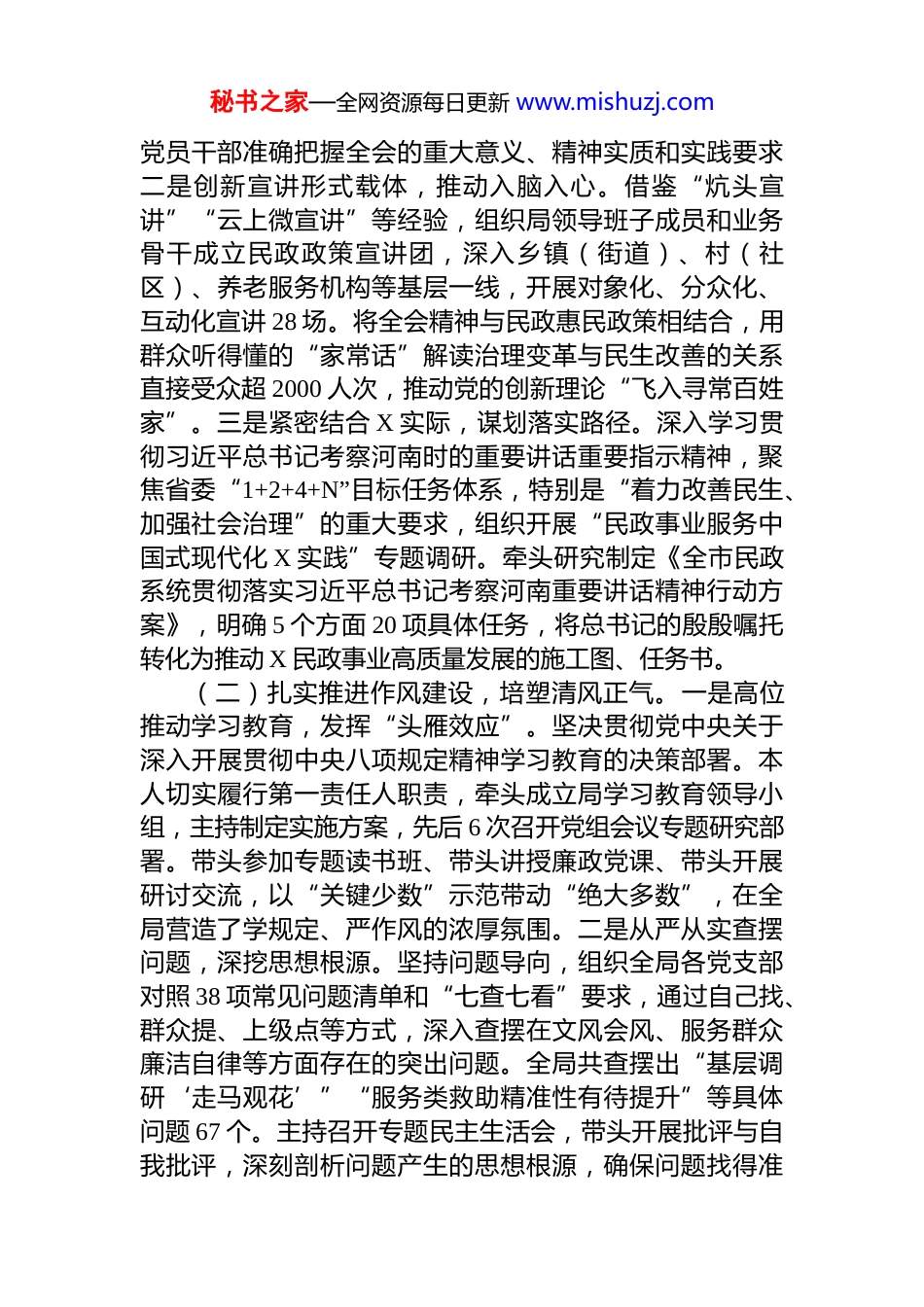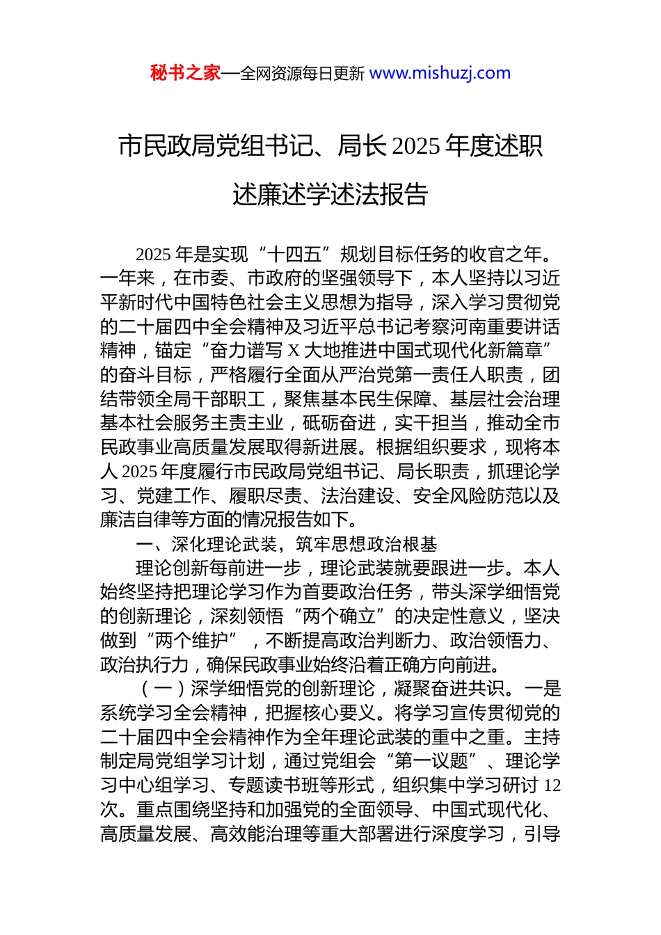 秘书之家—全网资源每日更新 www.mishuzj.com市民政局党组书记、局长 2025 年度述职述廉述学述法报告2025 年是实现“十四五”规划目标任务的收官之年。一年来,在市委、市政府的坚强领导下,本人坚持以习近平新时代中国特色社会主义思想为指导,深入学习贯彻党的二十届四中全会精神及习近平总书记考察河南重要讲话精神,锚定“奋力谱写 X 大地推进中国式现代化新篇章”的奋斗目标,严格履行全面从严治党第一责任人职责,团结带领全局干部职工,聚焦基本民生保障、基层社会治理基本社会服务主责主业,砥砺奋进,实干担当,推动全市民政事业高质量发展取得新进展。根据组织要求,现将本人 2025 年度履行市民政局党组书记、局长职责,抓理论学习、党建工作、履职尽责、法治建设、安全风险防范以及廉洁自律等方面的情况报告如下。一、深化理论武装,筑牢思想政治根基理论创新每前进一步,理论武装就要跟进一步。本人始终坚持把理论学习作为首要政治任务,带头深学细悟党的创新理论,深刻领悟“两个确立”的决定性意义,坚决做到“两个维护”,不断提高政治判断力、政治领悟力、政治执行力,确保民政事业始终沿着正确方向前进。(一)深学细悟党的创新理论,凝聚奋进共识。一是系统学习全会精神,把握核心要义。将学习宣传贯彻党的二十届四中全会精神作为全年理论武装的重中之重。主持制定局党组学习计划,通过党组会“第一议题”、理论学习中心组学习、专题读书班等形式,组织集中学习研讨 12次。重点围绕坚持和加强党的全面领导、中国式现代化、高质量发展、高效能治理等重大部署进行深度学习,引导秘书之家—全网资源每日更新 www.mishuzj.com党员干部准确把握全会的重大意义、精神实质和实践要求二是创新宣讲形式载体,推动入脑入心。借鉴“炕头宣讲”“云上微宣讲”等经验,组织局领导班子成员和业务骨干成立民政政策宣讲团,深入乡镇(街道)、村(社区)、养老服务机构等基层一线,开展对象化、分众化、互动化宣讲 28 场。将全会精神与民政惠民政策相结合,用群众听得懂的“家常话”解读治理变革与民生改善的关系直接受众超 2000 人次,推动党的创新理论“飞入寻常百姓家”。三是紧密结合 X 实际,谋划落实路径。深入学习贯彻习近平总书记考察河南时的重要讲话重要指示精神,聚焦省委“1+2+4+N”目标任务体系,特别是“着力改善民生、加强社会治理”的重大要求,组织开展“民政事业服务中国式现代化 X 实践”专题调研。牵头研究制定《全市民政系统贯彻落实习近平总书记考察河南重要讲话精神行动方案》,明确 5 个方面 20 项具体任务,将总书记的殷殷嘱托转化为推动 X 民政事业高质量发展的施工图、任务书。(二)扎实推进作风建设,培塑清风正气。一是高位推动学习教育,发挥“头雁效应”。坚决贯彻党中央关于深入开展贯彻中央八项规定精神学习教育的决策部署。本人切实履行第一责任人职责,牵头成立局学习教育领导小组,主持制定实施方案,先后 6 次召开党组会议专题研究部署。带头参加专题读书班、带头讲授廉政党课、带头开展研讨交流,以“关键少数”示范带动“绝大多数”,在全局营造了学规定、严作风的浓厚氛围。二是从严从实查摆问题,深挖思想根源。坚持问题导向,组织全局各党支部对照 38 项常见问题清单和“七查七看”要求,通过自己找、群众提、上级点等方式,深入查摆在文风会风、服务群众廉洁自律等方面存在的突出问题。全局共查摆出“基层调研‘走马观花’”“服务类救助精准性有待提升”等具体问题 67 个。主持召开专题民主生活会,带头开展批评与自我批评,深刻剖析问题产生的思想根源,确保问题找得准秘书之家—全网资源每日更新 www.mishuzj.com根源挖得深。三是动真碰硬整改整治,务求常态长效。针对查摆出的问题,牵头建立整改台账,制定 178 项整改措施,明确责任和时限,实行挂图作战、对账销号。重点整治“指尖上的形式主义”,全局文件、会议数量同比精简15%。推动制定修订《局机关公务接待管理办法》、《关于加强民政专项资金监管的若干规定》等内部管理制度 11 项,将学习教育成果固化为制度约束,推动作风建设常态...
