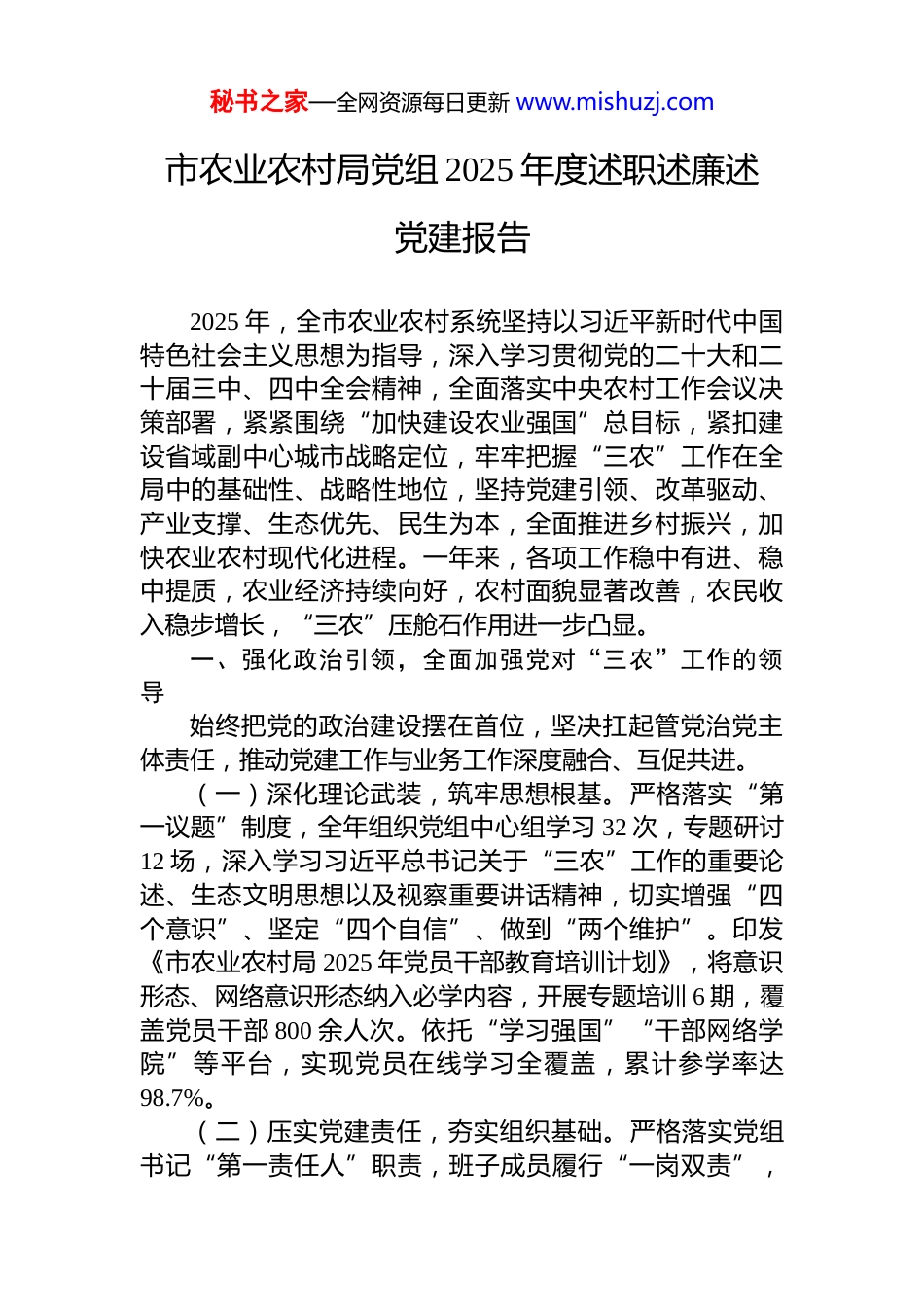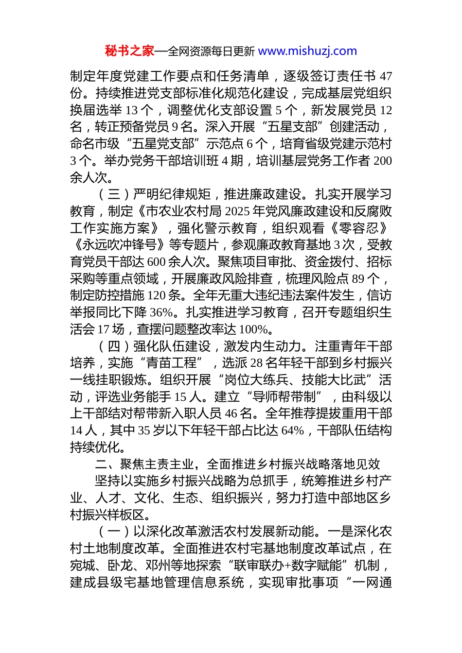 秘书之家—全网资源每日更新 www.mishuzj.com市农业农村局党组 2025 年度述职述廉述党建报告2025 年,全市农业农村系统坚持以习近平新时代中国特色社会主义思想为指导,深入学习贯彻党的二十大和二十届三中、四中全会精神,全面落实中央农村工作会议决策部署,紧紧围绕“加快建设农业强国”总目标,紧扣建设省域副中心城市战略定位,牢牢把握“三农”工作在全局中的基础性、战略性地位,坚持党建引领、改革驱动、产业支撑、生态优先、民生为本,全面推进乡村振兴,加快农业农村现代化进程。一年来,各项工作稳中有进、稳中提质,农业经济持续向好,农村面貌显著改善,农民收入稳步增长,“三农”压舱石作用进一步凸显。 一、强化政治引领,全面加强党对“三农”工作的领导始终把党的政治建设摆在首位,坚决扛起管党治党主体责任,推动党建工作与业务工作深度融合、互促共进。(一)深化理论武装,筑牢思想根基。严格落实“第一议题”制度,全年组织党组中心组学习 32 次,专题研讨12 场,深入学习习近平总书记关于“三农”工作的重要论述、生态文明思想以及视察重要讲话精神,切实增强“四个意识”、坚定“四个自信”、做到“两个维护”。印发《市农业农村局 2025 年党员干部教育培训计划》,将意识形态、网络意识形态纳入必学内容,开展专题培训 6 期,覆盖党员干部 800 余人次。依托“学习强国”“干部网络学院”等平台,实现党员在线学习全覆盖,累计参学率达98.7%。(二)压实党建责任,夯实组织基础。严格落实党组书记“第一责任人”职责,班子成员履行“一岗双责”,秘书之家—全网资源每日更新 www.mishuzj.com制定年度党建工作要点和任务清单,逐级签订责任书 47份。持续推进党支部标准化规范化建设,完成基层党组织换届选举 13 个,调整优化支部设置 5 个,新发展党员 12名,转正预备党员 9 名。深入开展“五星支部”创建活动,命名市级“五星党支部”示范点 6 个,培育省级党建示范村3 个。举办党务干部培训班 4 期,培训基层党务工作者 200余人次。(三)严明纪律规矩,推进廉政建设。扎实开展学习教育,制定《市农业农村局 2025 年党风廉政建设和反腐败工作实施方案》,强化警示教育,组织观看《零容忍》《永远吹冲锋号》等专题片,参观廉政教育基地 3 次,受教育党员干部达 600 余人次。聚焦项目审批、资金拨付、招标采购等重点领域,开展廉政风险排查,梳理风险点 89 个,制定防控措施 120 条。全年无重大违纪违法案件发生,信访举报同比下降 36%。扎实推进学习教育,召开专题组织生活会 17 场,查摆问题整改率达 100%。(四)强化队伍建设,激发内生动力。注重青年干部培养,实施“青苗工程”,选派 28 名年轻干部到乡村振兴一线挂职锻炼。组织开展“岗位大练兵、技能大比武”活动,评选业务能手 15 人。建立“导师帮带制”,由科级以上干部结对帮带新入职人员 46 名。全年推荐提拔重用干部14 人,其中 35 岁以下年轻干部占比达 64%,干部队伍结构持续优化。二、聚焦主责主业,全面推进乡村振兴战略落地见效坚持以实施乡村振兴战略为总抓手,统筹推进乡村产业、人才、文化、生态、组织振兴,努力打造中部地区乡村振兴样板区。(一)以深化改革激活农村发展新动能。一是深化农村土地制度改革。全面推进农村宅基地制度改革试点,在宛城、卧龙、邓州等地探索“联审联办+数字赋能”机制,建成县级宅基地管理信息系统,实现审批事项“一网通秘书之家—全网资源每日更新 www.mishuzj.com办”。2025 年全市共办理宅基地审批 1.2 万宗,面积达 186万平方米,审批效率提升 40%以上。积极推进农房报建“零跑动”改革,组建镇村两级代办队伍 720 人,通过线上系统受理申请 1.4 万件,办结率 91.2%,居全省前列。二是稳妥推进承包地确权后续管理。完成农村土地承包经营权证书换补发 1.3 万本,推动土地经营权纳入不动产统一登记范围。全年新增土地流转面积 28 万亩,累计达 567 万亩,流转率达到 52.3%。支持新型农业经营主体开展土地经营权抵押贷款,发放贷款金额突破 15 亿元,惠及经营主体 1200...