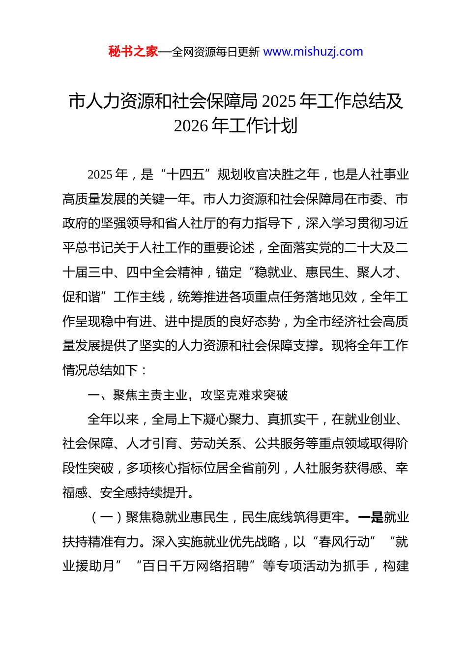 秘书之家—全网资源每日更新 www.mishuzj.com市人力资源和社会保障局 2025 年工作总结及2026 年工作计划 2025 年,是“十四五”规划收官决胜之年,也是人社事业高质量发展的关键一年。市人力资源和社会保障局在市委、市政府的坚强领导和省人社厅的有力指导下,深入学习贯彻习近平总书记关于人社工作的重要论述,全面落实党的二十大及二十届三中、四中全会精神,锚定“稳就业、惠民生、聚人才、促和谐”工作主线,统筹推进各项重点任务落地见效,全年工作呈现稳中有进、进中提质的良好态势,为全市经济社会高质量发展提供了坚实的人力资源和社会保障支撑。现将全年工作情况总结如下:一、聚焦主责主业,攻坚克难求突破全年以来,全局上下凝心聚力、真抓实干,在就业创业、社会保障、人才引育、劳动关系、公共服务等重点领域取得阶段性突破,多项核心指标位居全省前列,人社服务获得感、幸福感、安全感持续提升。(一)聚焦稳就业惠民生,民生底线筑得更牢。一是就业扶持精准有力。深入实施就业优先战略,以“春风行动”“就业援助月”“百日千万网络招聘”等专项活动为抓手,构建秘书之家—全网资源每日更新 www.mishuzj.com“线上+线下”立体招聘网络,全年组织各类招聘会 426 场,服务企业 1.2 万家次,提供岗位 38 万个,达成就业意向 12.5 万人次。强化重点群体帮扶,建立“一人一档一策”帮扶机制,为高校毕业生、农民工、就业困难人员等群体提供“一对一”就业指导 3.2 万人次,帮助 1.8 万名就业困难人员实现就业,零就业家庭动态清零率保持 100%。截至年底,全市城镇新增就业 15.6 万人,完成年度目标的 112%;城镇登记失业率控制在2.35%,低于全省平均水平 0.5 个百分点,就业形势保持稳定向好。二是创业带动效应凸显。完善“政策+资金+孵化+服务”全链条创业支持体系,修订创业担保贷款管理办法,放宽申请条件、提高贷款额度,全年发放创业担保贷款 3.2 亿元,直接扶持创业主体 1860 家,带动就业 7.5 万人。推进创业载体提质升级,新建市级创业孵化基地 6 家、乡村创业驿站 28 个,认定省级创业孵化示范基地 3 家,形成“青创、文创、科创、农创”多元融合的创业格局。成功举办全市创业创新大赛,评选优秀创业项目 60 个,发放奖励资金 500 万元,激发全民创业创新活力,全年新增创业实体 1.6 万家。三是就业服务体系完善。推进“15 分钟乐业圈”建设,完成 32 家零工市场(驿站)布局,实现乡镇(街道)全覆盖,为灵活就业人员提供“家门口”的就业服务。上线 AI 政策服务助手“乐业小智”,整合就业、创秘书之家—全网资源每日更新 www.mishuzj.com业、培训等政策事项,实现政策精准推送、在线咨询答疑。开展职业技能培训提质行动,围绕主导产业和新兴产业需求,开展订单式、定向式培训,全年完成职业技能培训 6.8 万人次,新增技能人才 2.3 万人,有效缓解结构性就业矛盾。(二)聚焦强保障提质量,社保体系织得更密。一是参保扩面持续推进。以灵活就业人员、新业态从业人员为重点,开展参保扩面专项行动,通过数据比对、入户走访、政策宣讲等方式,精准引导未参保人员参保。出台新业态劳动者参保实施办法,推动平台企业与劳动者签订参保协议,全年新增新业态从业人员参保 3.5 万人、灵活就业人员参保 2.1 万人。截至年底,全市基本养老、失业、工伤保险参保人数分别达 426 万、158 万、182 万,参保率均稳定在 98.8%以上,实现应保尽保。二是待遇水平稳步提升。落实社保待遇正常调整机制,企业退休人员基本养老金连续第 21 年上调,人均月增 132 元,调整后月均达3680 元;城乡居民基础养老金标准提高至每人每月 280 元,惠及 92 万城乡老年居民;失业保险金标准提高至最低工资标准的90%,发放失业金及价格临时补贴 2.8 亿元;工伤保险伤残津贴、生活护理费等定期待遇同步上调,惠及 2300 余名工伤职工。三是基金安全防线牢固。开展社保基金安全专项整治“回头看”,聚焦社保参保、待遇发放、基金管理等重点环节,核查秘书之家—全网资源每日更新 www.mishuzj.com数据 150 万条,整...