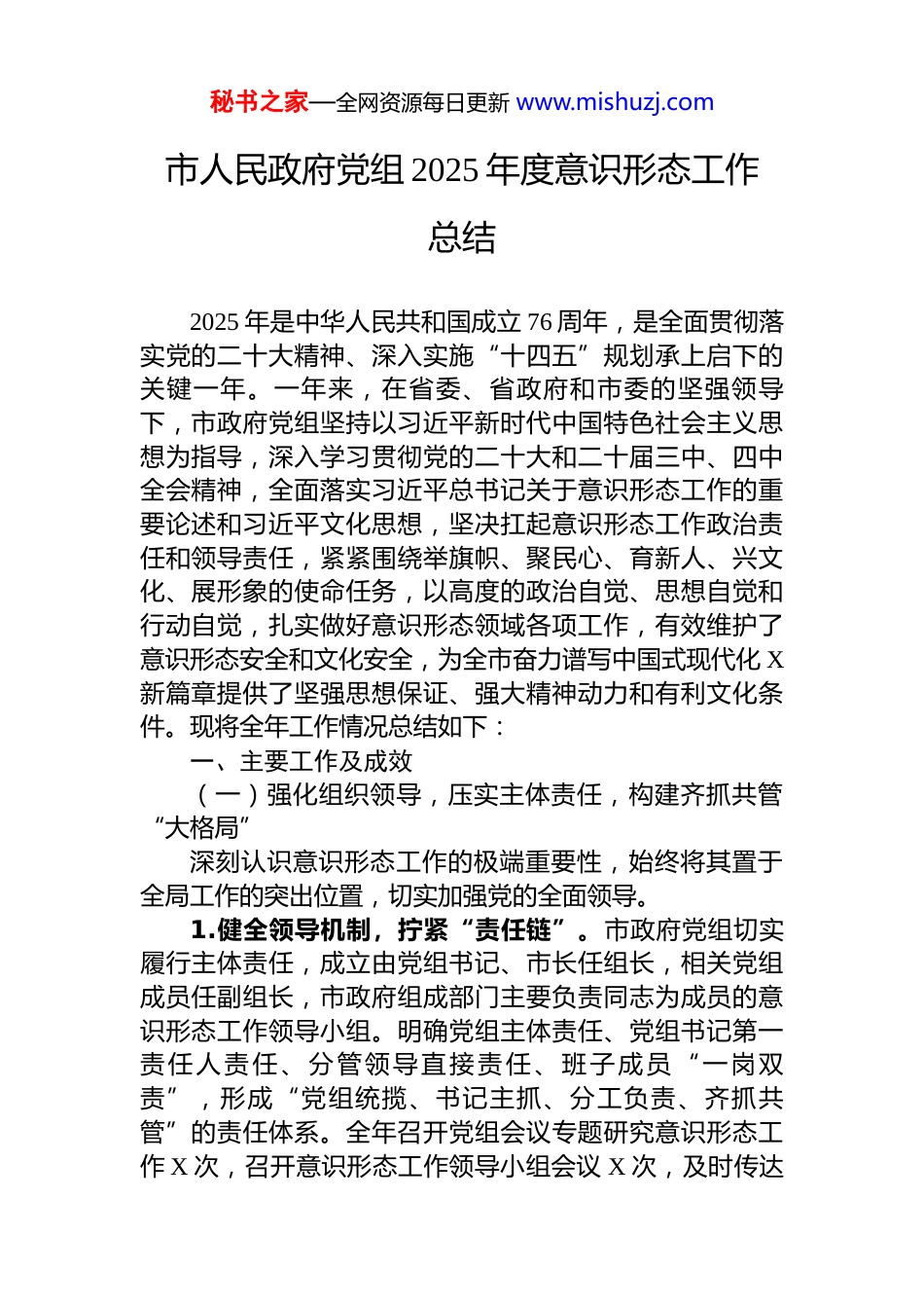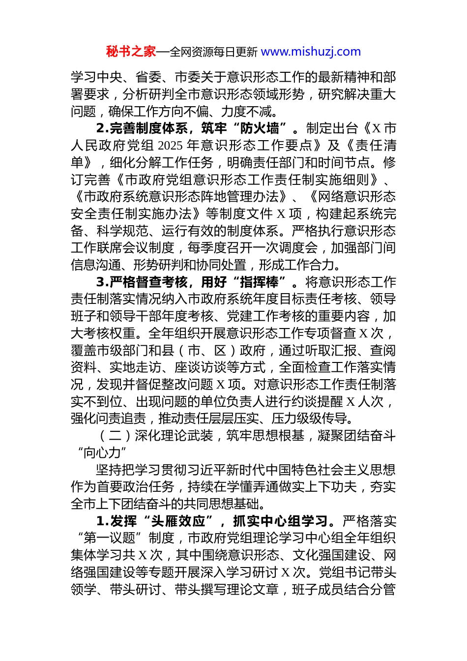 秘书之家—全网资源每日更新 www.mishuzj.com市人民政府党组 2025 年度意识形态工作总结2025 年是中华人民共和国成立 76 周年,是全面贯彻落实党的二十大精神、深入实施“十四五”规划承上启下的关键一年。一年来,在省委、省政府和市委的坚强领导下,市政府党组坚持以习近平新时代中国特色社会主义思想为指导,深入学习贯彻党的二十大和二十届三中、四中全会精神,全面落实习近平总书记关于意识形态工作的重要论述和习近平文化思想,坚决扛起意识形态工作政治责任和领导责任,紧紧围绕举旗帜、聚民心、育新人、兴文化、展形象的使命任务,以高度的政治自觉、思想自觉和行动自觉,扎实做好意识形态领域各项工作,有效维护了意识形态安全和文化安全,为全市奋力谱写中国式现代化 X新篇章提供了坚强思想保证、强大精神动力和有利文化条件。现将全年工作情况总结如下:一、主要工作及成效(一)强化组织领导,压实主体责任,构建齐抓共管“大格局”深刻认识意识形态工作的极端重要性,始终将其置于全局工作的突出位置,切实加强党的全面领导。1.健全领导机制,拧紧“责任链”。市政府党组切实履行主体责任,成立由党组书记、市长任组长,相关党组成员任副组长,市政府组成部门主要负责同志为成员的意识形态工作领导小组。明确党组主体责任、党组书记第一责任人责任、分管领导直接责任、班子成员“一岗双责”,形成“党组统揽、书记主抓、分工负责、齐抓共管”的责任体系。全年召开党组会议专题研究意识形态工作 X 次,召开意识形态工作领导小组会议 X 次,及时传达秘书之家—全网资源每日更新 www.mishuzj.com学习中央、省委、市委关于意识形态工作的最新精神和部署要求,分析研判全市意识形态领域形势,研究解决重大问题,确保工作方向不偏、力度不减。2.完善制度体系,筑牢“防火墙”。制定出台《X 市人民政府党组 2025 年意识形态工作要点》及《责任清单》,细化分解工作任务,明确责任部门和时间节点。修订完善《市政府党组意识形态工作责任制实施细则》、《市政府系统意识形态阵地管理办法》、《网络意识形态安全责任制实施办法》等制度文件 X 项,构建起系统完备、科学规范、运行有效的制度体系。严格执行意识形态工作联席会议制度,每季度召开一次调度会,加强部门间信息沟通、形势研判和协同处置,形成工作合力。3.严格督查考核,用好“指挥棒”。将意识形态工作责任制落实情况纳入市政府系统年度目标责任考核、领导班子和领导干部年度考核、党建工作考核的重要内容,加大考核权重。全年组织开展意识形态工作专项督查 X 次,覆盖市级部门和县(市、区)政府,通过听取汇报、查阅资料、实地走访、座谈访谈等方式,全面检查工作落实情况,发现并督促整改问题 X 项。对意识形态工作责任制落实不到位、出现问题的单位负责人进行约谈提醒 X 人次,强化问责追责,推动责任层层压实、压力级级传导。(二)深化理论武装,筑牢思想根基,凝聚团结奋斗“向心力”坚持把学习贯彻习近平新时代中国特色社会主义思想作为首要政治任务,持续在学懂弄通做实上下功夫,夯实全市上下团结奋斗的共同思想基础。1.发挥“头雁效应”,抓实中心组学习。严格落实“第一议题”制度,市政府党组理论学习中心组全年组织集体学习共 X 次,其中围绕意识形态、文化强国建设、网络强国建设等专题开展深入学习研讨 X 次。党组书记带头领学、带头研讨、带头撰写理论文章,班子成员结合分管秘书之家—全网资源每日更新 www.mishuzj.com领域深入交流。举办学习贯彻习近平文化思想专题读书班,组织专题辅导报告 X 场,推动党的创新理论入脑入心、见行见效。2.创新学习载体,推动全员覆盖。综合运用专题讲座、辅导报告、在线学习、现场教学等多种形式,丰富学习载体。邀请国内知名专家学者围绕意识形态安全、全媒体传播、文化自信等主题作辅导报告 X 场。组织市政府系统党员干部赴 X 革命纪念馆等开展沉浸式现场教学 X 批次。依托“学习强国”学习平台、干部网络学院等线上阵地,建立学习积分通报制度,全市政府系统“学习强国”平台活跃度持续保持在 X%以上,日均参与度、人...