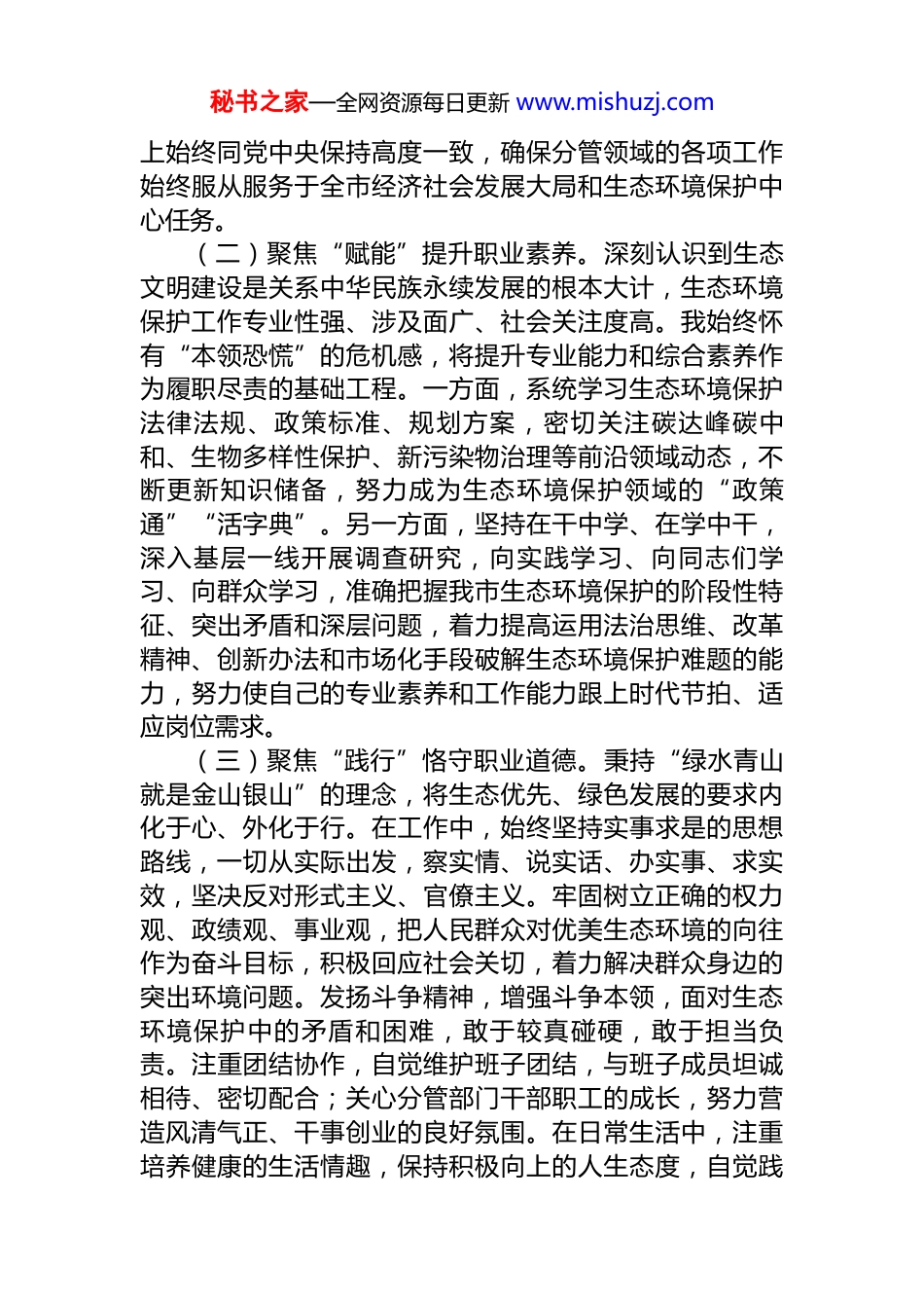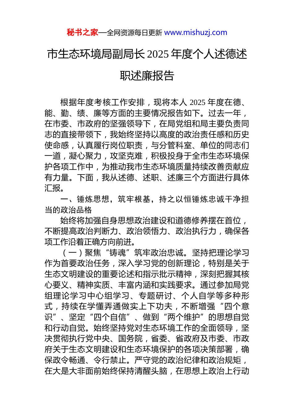 秘书之家—全网资源每日更新 www.mishuzj.com市生态环境局副局长 2025 年度个人述德述职述廉报告根据年度考核工作安排,现将本人 2025 年度在德、能、勤、绩、廉等方面的主要情况报告如下。过去一年,在市委、市政府的坚强领导下,在局党组和局主要负责同志的直接带领下,我始终坚持以高度的政治责任感和历史使命感,认真履行岗位职责,与分管科室、单位的同志们一道,凝心聚力,攻坚克难,积极投身于全市生态环境保护各项工作中,为推动我市生态环境质量持续改善贡献应有力量。下面,我从述德、述职、述廉三个方面进行具体汇报。一、锤炼思想,筑牢根基,持之以恒锤炼忠诚干净担当的政治品格始终将加强自身思想政治建设和道德修养摆在首位,不断提高政治判断力、政治领悟力、政治执行力,确保各项工作沿着正确方向前进。(一)聚焦“铸魂”筑牢政治忠诚。坚持把理论学习作为首要政治任务,深入学习党的创新理论,特别是关于生态文明建设的重要论述和指示批示精神,深刻把握其核心要义、精神实质、丰富内涵和实践要求。通过参加局党组理论学习中心组学习、专题研讨、个人自学等多种形式,持续在学懂弄通做实上下功夫,不断增强“四个意识”、坚定“四个自信”、做到“两个维护”的思想自觉和行动自觉。始终坚持党对生态环境工作的全面领导,坚决贯彻执行党中央、国务院,省委、省政府及市委、市政府关于生态文明建设和生态环境保护的各项决策部署,确保政令畅通、令行禁止。严守党的政治纪律和政治规矩,在大是大非面前始终保持清醒头脑,在思想上政治上行动秘书之家—全网资源每日更新 www.mishuzj.com上始终同党中央保持高度一致,确保分管领域的各项工作始终服从服务于全市经济社会发展大局和生态环境保护中心任务。(二)聚焦“赋能”提升职业素养。深刻认识到生态文明建设是关系中华民族永续发展的根本大计,生态环境保护工作专业性强、涉及面广、社会关注度高。我始终怀有“本领恐慌”的危机感,将提升专业能力和综合素养作为履职尽责的基础工程。一方面,系统学习生态环境保护法律法规、政策标准、规划方案,密切关注碳达峰碳中和、生物多样性保护、新污染物治理等前沿领域动态,不断更新知识储备,努力成为生态环境保护领域的“政策通”“活字典”。另一方面,坚持在干中学、在学中干,深入基层一线开展调查研究,向实践学习、向同志们学习、向群众学习,准确把握我市生态环境保护的阶段性特征、突出矛盾和深层问题,着力提高运用法治思维、改革精神、创新办法和市场化手段破解生态环境保护难题的能力,努力使自己的专业素养和工作能力跟上时代节拍、适应岗位需求。(三)聚焦“践行”恪守职业道德。秉持“绿水青山就是金山银山”的理念,将生态优先、绿色发展的要求内化于心、外化于行。在工作中,始终坚持实事求是的思想路线,一切从实际出发,察实情、说实话、办实事、求实效,坚决反对形式主义、官僚主义。牢固树立正确的权力观、政绩观、事业观,把人民群众对优美生态环境的向往作为奋斗目标,积极回应社会关切,着力解决群众身边的突出环境问题。发扬斗争精神,增强斗争本领,面对生态环境保护中的矛盾和困难,敢于较真碰硬,敢于担当负责。注重团结协作,自觉维护班子团结,与班子成员坦诚相待、密切配合;关心分管部门干部职工的成长,努力营造风清气正、干事创业的良好氛围。在日常生活中,注重培养健康的生活情趣,保持积极向上的人生态度,自觉践秘书之家—全网资源每日更新 www.mishuzj.com行社会主义核心价值观,遵守社会公德、职业道德、家庭美德,保持共产党人的高尚情操和政治本色。二、履职尽责,担当作为,全力以赴推动生态环境保护重点工作落地见效根据局党组分工,我主要负责(根据实际情况调整,例如:水生态环境保护、土壤与固废管理、环境监测与应急、生态环境保护督察整改协调等方面)工作。一年来,我紧紧围绕全市生态环境保护年度目标任务,聚焦主责主业,狠抓工作落实,主要开展了以下工作:(一)精描细绘“水文章”,着力守护碧波长清。以持续改善水环境质量为核心,统筹水资源、水环境、水生态治理。一是强化目标管理。紧盯国考、省...