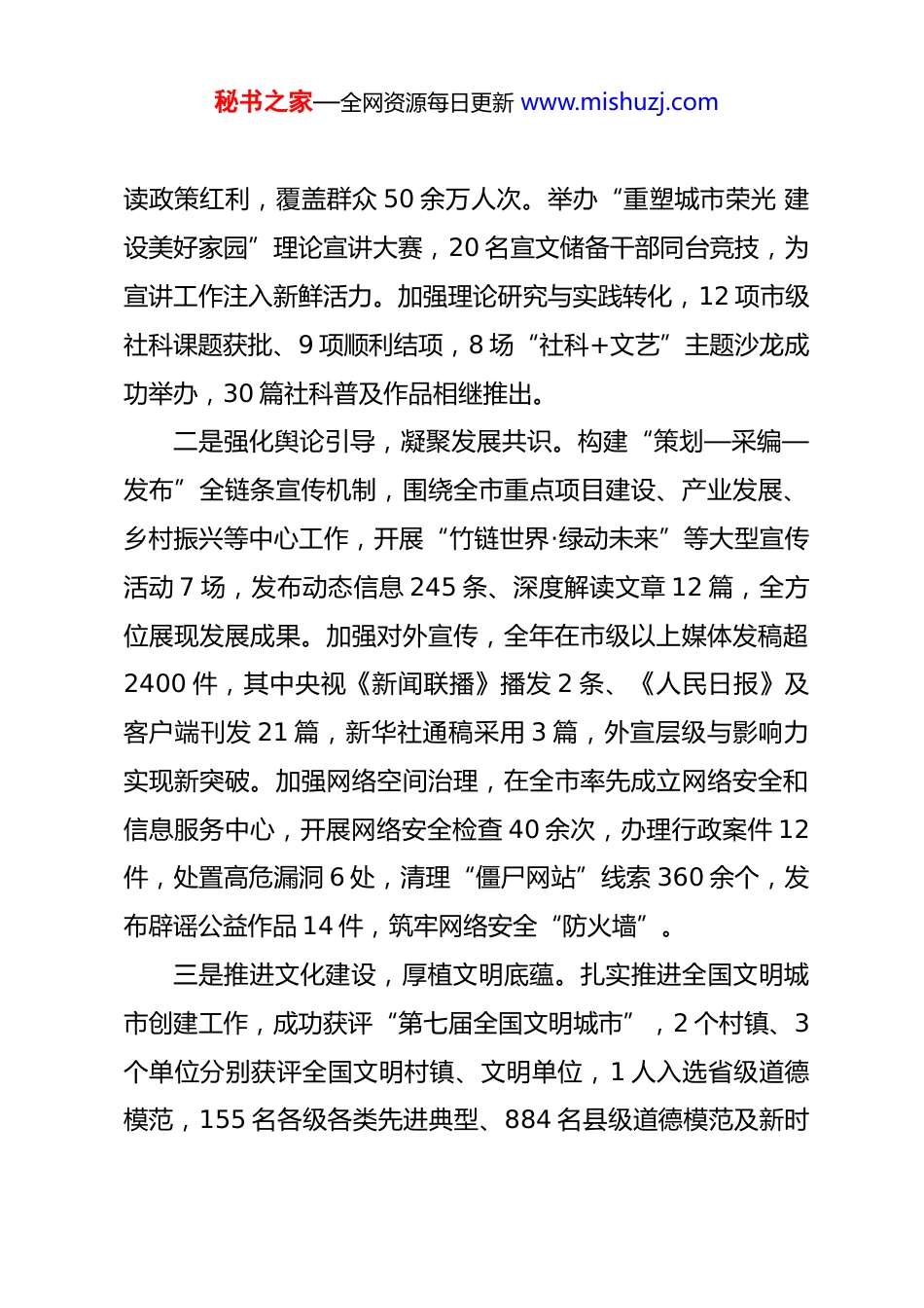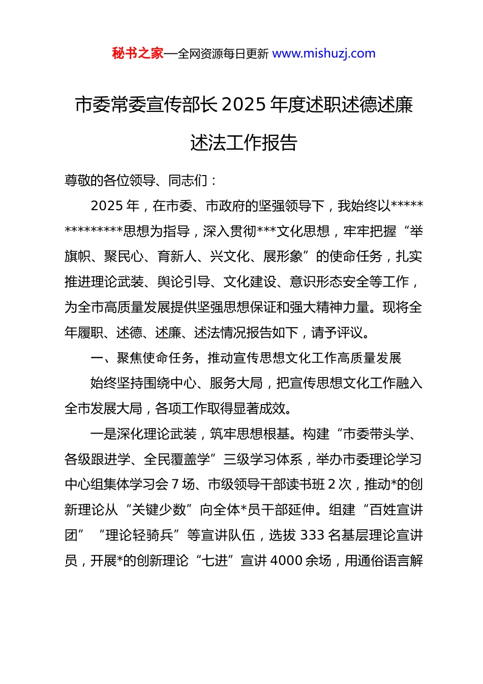 秘书之家—全网资源每日更新 www.mishuzj.com市委常委宣传部长 2025 年度述职述德述廉述法工作报告尊敬的各位领导、同志们:2025 年,在市委、市政府的坚强领导下,我始终以**************思想为指导,深入贯彻***文化思想,牢牢把握“举旗帜、聚民心、育新人、兴文化、展形象”的使命任务,扎实推进理论武装、舆论引导、文化建设、意识形态安全等工作,为全市高质量发展提供坚强思想保证和强大精神力量。现将全年履职、述德、述廉、述法情况报告如下,请予评议。一、聚焦使命任务,推动宣传思想文化工作高质量发展始终坚持围绕中心、服务大局,把宣传思想文化工作融入全市发展大局,各项工作取得显著成效。一是深化理论武装,筑牢思想根基。构建“市委带头学、各级跟进学、全民覆盖学”三级学习体系,举办市委理论学习中心组集体学习会 7 场、市级领导干部读书班 2 次,推动*的创新理论从“关键少数”向全体*员干部延伸。组建“百姓宣讲团”“理论轻骑兵”等宣讲队伍,选拔 333 名基层理论宣讲员,开展*的创新理论“七进”宣讲 4000 余场,用通俗语言解秘书之家—全网资源每日更新 www.mishuzj.com读政策红利,覆盖群众 50 余万人次。举办“重塑城市荣光 建设美好家园”理论宣讲大赛,20 名宣文储备干部同台竞技,为宣讲工作注入新鲜活力。加强理论研究与实践转化,12 项市级社科课题获批、9 项顺利结项,8 场“社科+文艺”主题沙龙成功举办,30 篇社科普及作品相继推出。二是强化舆论引导,凝聚发展共识。构建“策划—采编—发布”全链条宣传机制,围绕全市重点项目建设、产业发展、乡村振兴等中心工作,开展“竹链世界·绿动未来”等大型宣传活动 7 场,发布动态信息 245 条、深度解读文章 12 篇,全方位展现发展成果。加强对外宣传,全年在市级以上媒体发稿超2400 件,其中央视《新闻联播》播发 2 条、《人民日报》及客户端刊发 21 篇,新华社通稿采用 3 篇,外宣层级与影响力实现新突破。加强网络空间治理,在全市率先成立网络安全和信息服务中心,开展网络安全检查 40 余次,办理行政案件 12件,处置高危漏洞 6 处,清理“僵尸网站”线索 360 余个,发布辟谣公益作品 14 件,筑牢网络安全“防火墙”。三是推进文化建设,厚植文明底蕴。扎实推进全国文明城市创建工作,成功获评“第七届全国文明城市”,2 个村镇、3个单位分别获评全国文明村镇、文明单位,1 人入选省级道德模范,155 名各级各类先进典型、884 名县级道德模范及新时秘书之家—全网资源每日更新 www.mishuzj.com代好少年不断涌现。开展文化惠民活动,组织市、县“三下乡”示范活动 2 场,“百姓大舞台”演出 113 场,农村电影公益放映 3800 余场,惠及群众超 30 万人次。升级改造 5 个“城市阅读空间”,规范运营 235 个农家书屋,补充上架新图书 25 万册,让群众在家门口享受“精神食粮”。加强文艺创作,市文联获评市级“文艺人才工作”先进单位,全年发表作品超 500 件,124 件作品斩获国、省奖项,48 人入选省市协会会员,打造《家乡欢歌》等一批具有地方特色的文艺精品。四是筑牢意识形态防线,守好安全底线。出台《意识形态工作会商研判和交办提醒工作制度》,夯实“1 建 1 落 6 抓”工作机制,市委常委会 4 次开展意识形态领域形势分析研判,2 次专题研究,扎实推进省委巡视检查意识形态反馈整改,制定“4+15”整改方案,持续巩固整改成果。将意识形态工作责任制落实情况纳入干部提拔任用考核,全年查核 27 批1400 余人次,确保责任落实无死角。加强阵地管理,对新闻媒体、学校、**场所等各类阵地开展“拉网式”排查 240 家(次),销毁非法出版物 400 余册,开展 4 次校园周边环境专项整治,有效净化文化市场环境。严格执行 7×24 小时网络值班制度,收集转办涉市网络舆情 600 余条,报送舆情报告 214期,快速查删不实信息及不当评论 800 余条,形成闭环处置机秘书之家—全网资源每日更新 www.mishuzj.com制。二、践行初心使命,涵养高尚政治品格始终把品德修养作为立身之本,自觉践行社会主义核心价值观...