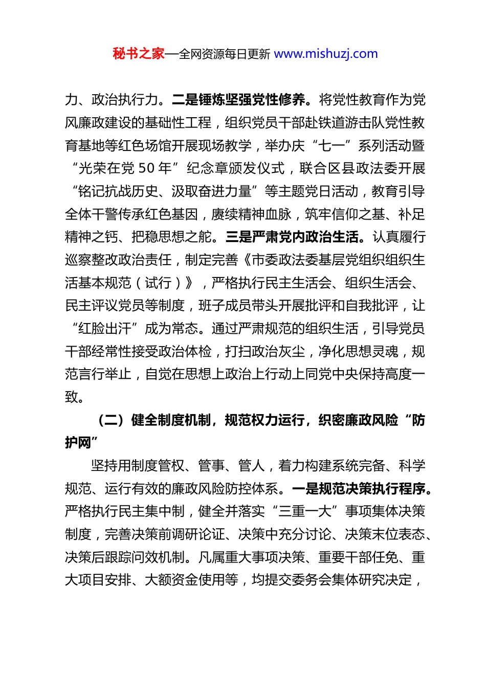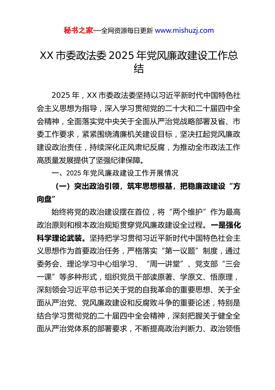 秘书之家—全网资源每日更新 www.mishuzj.comXX 市委政法委 2025 年党风廉政建设工作总结2025 年,XX 市委政法委坚持以习近平新时代中国特色社会主义思想为指导,深入学习贯彻党的二十大和二十届四中全会精神,全面落实党中央关于全面从严治党战略部署及省、市委工作要求,紧紧围绕清廉机关建设目标,坚决扛起党风廉政建设政治责任,持续深化正风肃纪反腐,为推动全市政法工作高质量发展提供了坚强纪律保障。一、2025 年党风廉政建设工作开展情况(一)突出政治引领,筑牢思想根基,把稳廉政建设“方向盘”始终将党的政治建设摆在首位,将“两个维护”作为最高政治原则和根本政治规矩贯穿党风廉政建设全过程。一是强化科学理论武装。坚持把学习贯彻习近平新时代中国特色社会主义思想作为首要政治任务,严格落实“第一议题”制度,通过委务会、理论学习中心组学习、“周一讲堂”、党支部“三会一课”等多种形式,组织党员干部读原著、学原文、悟原理,深刻领会习近平总书记关于党的自我革命的重要思想、关于全面从严治党、党风廉政建设和反腐败斗争的重要论述,特别是结合学习贯彻党的二十届四中全会精神,深刻把握关于健全全面从严治党体系的部署要求,不断提高政治判断力、政治领悟秘书之家—全网资源每日更新 www.mishuzj.com力、政治执行力。二是锤炼坚强党性修养。将党性教育作为党风廉政建设的基础性工程,组织党员干部赴铁道游击队党性教育基地等红色场馆开展现场教学,举办庆“七一”系列活动暨“光荣在党 50 年”纪念章颁发仪式,联合区县政法委开展“铭记抗战历史、汲取奋进力量”等主题党日活动,教育引导全体干警传承红色基因,赓续精神血脉,筑牢信仰之基、补足精神之钙、把稳思想之舵。三是严肃党内政治生活。认真履行巡察整改政治责任,制定完善《市委政法委基层党组织组织生活基本规范(试行)》,严格执行民主生活会、组织生活会、民主评议党员等制度,班子成员带头开展批评和自我批评,让“红脸出汗”成为常态。通过严肃规范的组织生活,引导党员干部经常性接受政治体检,打扫政治灰尘,净化思想灵魂,规范言行举止,自觉在思想上政治上行动上同党中央保持高度一致。(二)健全制度机制,规范权力运行,织密廉政风险“防护网”坚持用制度管权、管事、管人,着力构建系统完备、科学规范、运行有效的廉政风险防控体系。一是规范决策执行程序。严格执行民主集中制,健全并落实“三重一大”事项集体决策制度,完善决策前调研论证、决策中充分讨论、决策末位表态、决策后跟踪问效机制。凡属重大事项决策、重要干部任免、重大项目安排、大额资金使用等,均提交委务会集体研究决定,秘书之家—全网资源每日更新 www.mishuzj.com并主动邀请派驻纪检监察组列席指导,确保权力在阳光下运行、在规范中行使。二是压实管党治党责任。委领导班子切实履行主体责任,定期专题研究部署党风廉政建设和政治生态建设工作,听取班子成员履行“一岗双责”情况汇报,层层传导压力。认真落实党风廉政建设“十个一”工作机制,精准有效运用监督执纪“第一种形态”,聚焦领导班子成员、内设机构负责人及执法司法、干部人事、项目资金管理等关键岗位人员,常态化开展廉政风险点排查,实现廉政谈话提醒全覆盖,抓早抓小、防微杜渐。三是深化作风建设长效机制。将深入贯彻中央八项规定精神学习教育作为全年重要政治任务常抓不懈,通过举办专题读书班、开展“规矩立心、清廉立行”党风廉政建设月活动等形式,组织党员干部深刻对照反思,持续整治“四风”特别是形式主义、官僚主义顽瘴痼疾。活动围绕对照查摆问题、深入开展谈心谈话、做实做细廉政提醒、大兴调查研究、领导干部讲授专题廉政党课、常态化开展警示教育等六个方面深化拓展,推动中央八项规定精神及其实施细则入脑入心、化风成俗。(三)深化监督执纪,保持高压态势,打好正风肃纪“组合拳”坚持严的基调不动摇,强化监督执纪问责,一体推进不敢腐、不能腐、不想腐。一是强化政治监督。聚焦贯彻落实习近平总书记重要指示批示精神和党中央重大决策部署、服务保障秘书之家—全网资源每日更新 www.mishuzj.com全市高质量发展...