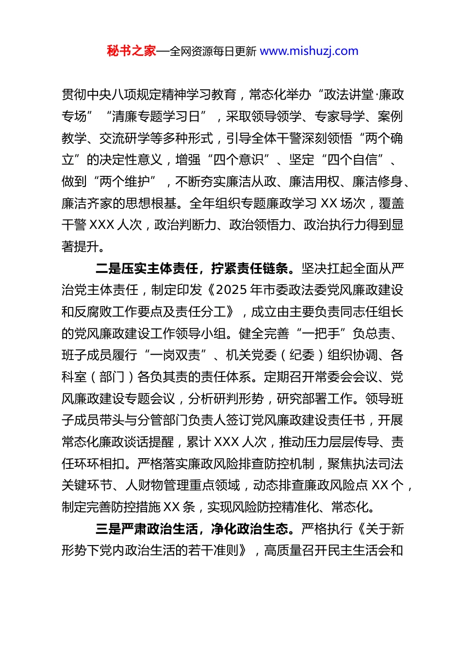 秘书之家—全网资源每日更新 www.mishuzj.comXX 市委政法委 2025 年度党风廉政建设工作总结2025 年,XX 市委政法委在省委政法委有力指导和市委坚强领导下,坚持以党的创新理论为指导,深入贯彻落实党的二十届四中全会精神和关于全面从严治党战略部署,牢牢把握“锻造绝对忠诚、绝对纯洁、绝对可靠的政法铁军”目标要求,将党风廉政建设作为推动政法工作高质量发展的根本保障,系统谋划、精准发力、纵深推进,为全市政法工作现代化提供了坚强的纪律作风保障。现将全年工作情况总结如下:一、2025 年工作开展情况(一)聚焦政治统领,筑牢忠诚根基,把稳清廉建设“方向盘”始终将党的政治建设摆在首位,以高度的政治自觉引领党风廉政建设方向。一是强化理论武装,淬炼政治忠诚。坚持把学习党的创新理论作为首要政治任务,严格落实“第一议题”制度。将党的二十大、二十届历次全会精神,特别是二十届四中全会关于“健全全面从严治党体系”的重大部署,以及习近平总书记关于党的自我革命、党风廉政建设和反腐败斗争的重要论述、《中国共产党政法工作条例》等党内法规,纳入理论学习中心组学习、“三会一课”、政治轮训的核心内容。结合深入开展秘书之家—全网资源每日更新 www.mishuzj.com贯彻中央八项规定精神学习教育,常态化举办“政法讲堂·廉政专场”“清廉专题学习日”,采取领导领学、专家导学、案例教学、交流研学等多种形式,引导全体干警深刻领悟“两个确立”的决定性意义,增强“四个意识”、坚定“四个自信”、做到“两个维护”,不断夯实廉洁从政、廉洁用权、廉洁修身、廉洁齐家的思想根基。全年组织专题廉政学习 XX 场次,覆盖干警 XXX 人次,政治判断力、政治领悟力、政治执行力得到显著提升。二是压实主体责任,拧紧责任链条。坚决扛起全面从严治党主体责任,制定印发《2025 年市委政法委党风廉政建设和反腐败工作要点及责任分工》,成立由主要负责同志任组长的党风廉政建设工作领导小组。健全完善“一把手”负总责、班子成员履行“一岗双责”、机关党委(纪委)组织协调、各科室(部门)各负其责的责任体系。定期召开常委会会议、党风廉政建设专题会议,分析研判形势,研究部署工作。领导班子成员带头与分管部门负责人签订党风廉政建设责任书,开展常态化廉政谈话提醒,累计 XXX 人次,推动压力层层传导、责任环环相扣。严格落实廉政风险排查防控机制,聚焦执法司法关键环节、人财物管理重点领域,动态排查廉政风险点 XX 个,制定完善防控措施 XX 条,实现风险防控精准化、常态化。三是严肃政治生活,净化政治生态。严格执行《关于新形势下党内政治生活的若干准则》,高质量召开民主生活会和秘书之家—全网资源每日更新 www.mishuzj.com组织生活会,严肃认真开展批评与自我批评,让“红脸出汗”成为常态。将中央八项规定精神及其实施细则作为铁规矩、硬杠杠,融入日常教育管理监督。深入开展“纪律作风深化提升”活动,围绕“六大纪律”特别是政治纪律和政治规矩执行情况,组织党员干部自查自纠,对发现的苗头性、倾向性问题及时约谈函询、督促整改。年内整改涉及工作作风、履职尽责等方面问题 XX 项,进一步严明了纪律规矩,筑牢了拒腐防变的政治防线。(二)聚焦制度固本,织密监督网络,夯实清廉建设“压舱石”坚持用制度管权、管事、管人,着力构建系统完备、科学规范、运行有效的廉政风险防控体系。一是健全权力运行制约机制。紧盯政法工作权力运行的关键点、内部管理的薄弱点、问题易发的风险点,修订完善《市委政法委“三重一大”事项集体决策实施办法》,将重大政策制定、重要干部任免、重大项目安排、大额资金使用以及重大案件协调、重要考核评优等全部纳入集体决策范围,确保权力在阳光下运行。全面梳理委机关职权事项,推行“权力清单+责任清单+风险清单”管理模式,明晰 XX 项核心权力的运行流程、责任主体和廉政风险等级,通过机关内网、公示栏等载体公开,主动接受监督。二是完善廉政风险源头防控机制。修订《市委政法委机秘书之家—全网资源每日更新 www.mishuzj.com关内部管理制度汇编》,涵盖财务、公务接待、公务用车、固...