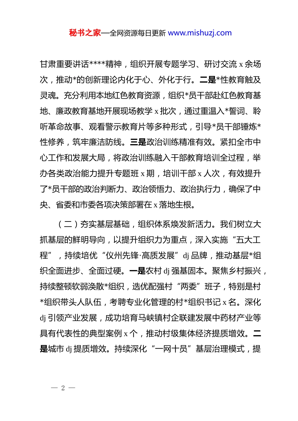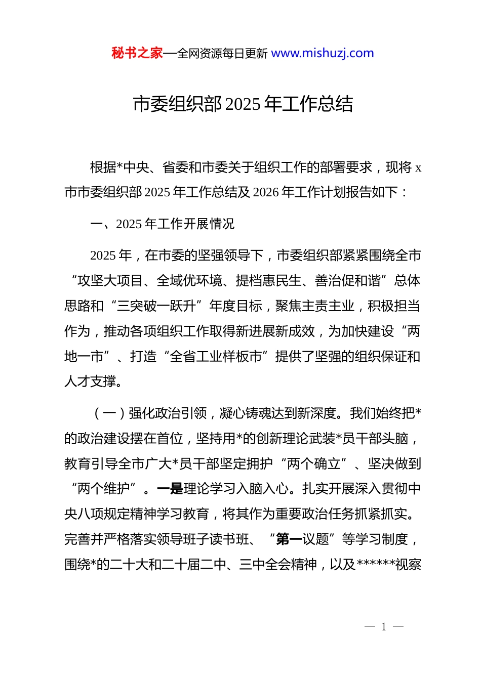 秘书之家—全网资源每日更新 www.mishuzj.com市委组织部 2025 年工作总结根据*中央、省委和市委关于组织工作的部署要求,现将 x市市委组织部 2025 年工作总结及 2026 年工作计划报告如下:一、2025 年工作开展情况2025 年,在市委的坚强领导下,市委组织部紧紧围绕全市“攻坚大项目、全域优环境、提档惠民生、善治促和谐”总体思路和“三突破一跃升”年度目标,聚焦主责主业,积极担当作为,推动各项组织工作取得新进展新成效,为加快建设“两地一市”、打造“全省工业样板市”提供了坚强的组织保证和人才支撑。(一)强化政治引领,凝心铸魂达到新深度。我们始终把*的政治建设摆在首位,坚持用*的创新理论武装*员干部头脑,教育引导全市广大*员干部坚定拥护“两个确立”、坚决做到“两个维护”。一是理论学习入脑入心。扎实开展深入贯彻中央八项规定精神学习教育,将其作为重要政治任务抓紧抓实。完善并严格落实领导班子读书班、“第一议题”等学习制度,围绕*的二十大和二十届二中、三中全会精神,以及******视察— 1 —秘书之家—全网资源每日更新 www.mishuzj.com甘肃重要讲话****精神,组织开展专题学习、研讨交流 x 余场次,推动*的创新理论内化于心、外化于行。二是*性教育触及灵魂。充分利用本地红色教育资源,组织*员干部赴红色教育基地、廉政教育基地开展现场教学 x 批次,通过重温入*誓词、聆听革命故事、观看警示教育片等多种形式,引导*员干部锤炼*性修养,筑牢廉洁防线。三是政治训练精准有效。紧扣全市中心工作和发展大局,将政治训练融入干部教育培训全过程,举办各类政治能力提升专题班 x 期,培训干部 x 人次,有效提升了*员干部的政治判断力、政治领悟力、政治执行力,确保了中央、省委和市委各项决策部署在 x 落地生根。(二)夯实基层基础,组织体系焕发新活力。我们树立大抓基层的鲜明导向,以提升组织力为重点,深入实施“五大工程”,持续培优“仪州先锋·高质发展”dj 品牌,推动基层*组织全面进步、全面过硬。一是农村 dj 强基固本。聚焦乡村振兴,持续整顿软弱涣散*组织,选优配强村“两委”班子,特别是村*组织带头人队伍,考聘专业化管理的村*组织书记 x 名。深化dj 引领产业发展,成功培育马峡镇村企联建发展中药材产业等具有代表性的典型案例 x 个,推动村级集体经济提质增效。二是城市 dj 提质增效。持续深化“一网十员”基层治理模式,提— 2 —秘书之家—全网资源每日更新 www.mishuzj.com升网格化管理服务水平。积极培育“红色物业”x 个,有效破解小区治理难题。高标准配建“仪州·红小站”x 个,引进专业养老、医疗等社会服务组织 x 个,打通服务群众“最后一百米”。三是新兴领域 dj 创新突破。将非公企业 dj 作为重中之重,x 工业园区探索构建“*工委—非公企业综合*委—企业*支部”三级组织架构,成立园区非公企业综合*委,对辖区内 x 户入驻企业精准摸排,在 x 户“三有”非公企业建立*支部 x 个,*的组织和工作覆盖质量显著提升。同时,规划建设集成多项功能的*群服务中心,打造“仪州先锋·工业尖兵”总品牌,引导企业培育“一企一品”子品牌,推动 dj 与企业发展深度融合。四是传统领域 dj 巩固深化。在机关,有效落实“四强”*支部建设和模范机关创建。在学校、医院,严格落实*组织领导下的校长(院长)负责制,持续深化“双培双促”活动和 dj“双优”工程。通过“五区 dj”模式,促进了不同领域 dj 工作的有机融合和相互促进。(三)优化选育管用,干部队伍展现新气象。我们坚持*管干部原则,落实新时代好干部标准,着力打造一支忠诚干净担当的高素质专业化干部队伍。一是树立鲜明用人导向。突出重担当、重实干、重实绩的导向,注重在招商引资、项目建设、— 3 —秘书之家—全网资源每日更新 www.mishuzj.com产业发展、乡村振兴等一线火线考察识别干部。常态化开展干部调研,全年开展综合调研 x 次、专项调研 x 次,近距离、多维度了解干部真实表现,为市委科学选人用人提供精准依据。二是优化队伍结构功能。分行业、分领域、分系统对领导班子和干部队伍进行分...