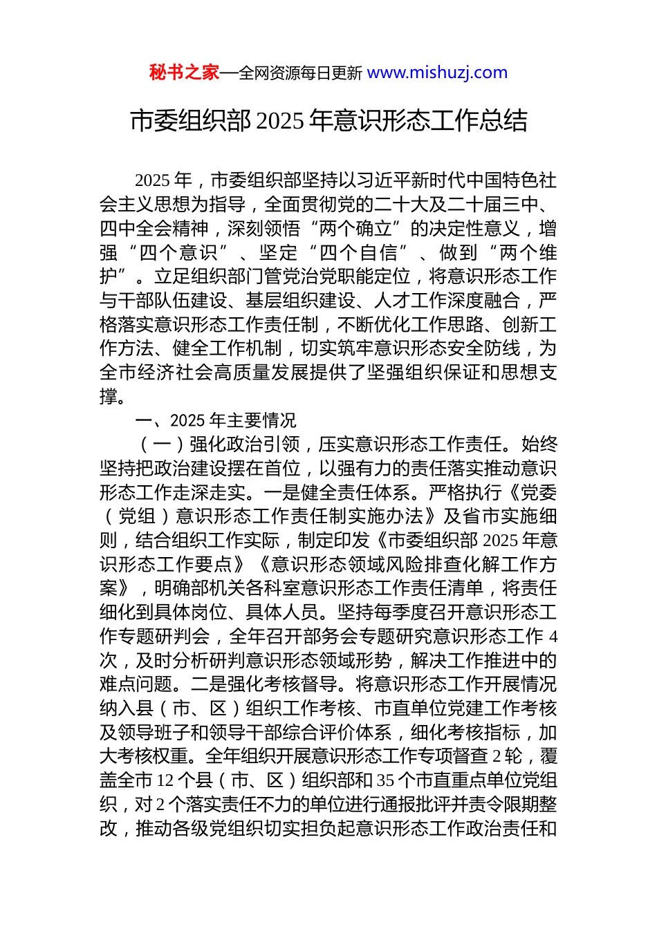 秘书之家—全网资源每日更新 www.mishuzj.com市委组织部 2025 年意识形态工作总结2025 年,市委组织部坚持以习近平新时代中国特色社会主义思想为指导,全面贯彻党的二十大及二十届三中、四中全会精神,深刻领悟“两个确立”的决定性意义,增强“四个意识”、坚定“四个自信”、做到“两个维护”。立足组织部门管党治党职能定位,将意识形态工作与干部队伍建设、基层组织建设、人才工作深度融合,严格落实意识形态工作责任制,不断优化工作思路、创新工作方法、健全工作机制,切实筑牢意识形态安全防线,为全市经济社会高质量发展提供了坚强组织保证和思想支撑。一、2025 年主要情况(一)强化政治引领,压实意识形态工作责任。始终坚持把政治建设摆在首位,以强有力的责任落实推动意识形态工作走深走实。一是健全责任体系。严格执行《党委(党组)意识形态工作责任制实施办法》及省市实施细则,结合组织工作实际,制定印发《市委组织部 2025 年意识形态工作要点》《意识形态领域风险排查化解工作方案》,明确部机关各科室意识形态工作责任清单,将责任细化到具体岗位、具体人员。坚持每季度召开意识形态工作专题研判会,全年召开部务会专题研究意识形态工作 4次,及时分析研判意识形态领域形势,解决工作推进中的难点问题。二是强化考核督导。将意识形态工作开展情况纳入县(市、区)组织工作考核、市直单位党建工作考核及领导班子和领导干部综合评价体系,细化考核指标,加大考核权重。全年组织开展意识形态工作专项督查 2 轮,覆盖全市 12 个县(市、区)组织部和 35 个市直重点单位党组织,对 2 个落实责任不力的单位进行通报批评并责令限期整改,推动各级党组织切实担负起意识形态工作政治责任和秘书之家—全网资源每日更新 www.mishuzj.com领导责任。三是深化政治教育。深入开展政治机关意识教育,组织部机关全体干部集中学习习近平总书记关于意识形态工作的重要论述、重要指示批示精神 3 次,引导干部深刻认识意识形态工作的极端重要性,增强做好意识形态工作的政治自觉、思想自觉和行动自觉。举办“强化意识形态担当”专题研讨班,组织市县两级组织部门干部开展交流研讨,进一步统一思想、凝聚共识。(二)深化理论武装,筑牢思想根基。以学习贯彻习近平新时代中国特色社会主义思想为主线,健全理论武装工作机制,推动党的创新理论入脑入心。一是严格落实“第一议题”制度。部理论学习中心组围绕“中国式现代化理论与实践”“新质生产力培育”“总体国家安全观”等重大主题开展专题学习研讨 12 次,中心组成员撰写调研报告、理论文章 40 余篇。将习近平总书记关于党的建设的重要思想、关于意识形态工作的重要论述作为各类干部培训班的核心课程,全年举办市管干部专题培训班 4 期、年轻干部培训班 6 期,培训干部 1200 余人次,推动党的创新理论在干部队伍中深化、内化、转化。二是创新理论宣讲模式。组建“组工先锋”宣讲团,深入机关、企业、社区、农村,采用“理论+故事”“理论+案例”“理论+文艺”等形式,开展对象化、分众化宣讲活动 86 场次,直接受众达5000 余人次。依托“学习强国”学习平台、“我市先锋”微信公众号等线上载体,开设“理论微课堂”专栏,推送理论解读文章 200 余篇、微视频 35 个,让党的创新理论随时随地可学可感。三是加强年轻干部思想引领。深入实施青年理论学习提升工程,制定部机关青年理论学习小组学习规则,组织开展“青年学习汇”“红色基因我传承”等活动 28 次。开展“根在基层”调研实践活动,组织年轻干部深入基层一线了解社情民意,在实践中坚定理想信念、提升意识形态工作能力。选树青年理论学习模范个人 10名、模范小组 3 个,营造比学赶超的浓厚学习氛围。秘书之家—全网资源每日更新 www.mishuzj.com(三)聚焦主责主业,强化意识形态阵地管理。立足组织部门职能,将意识形态工作贯穿干部选拔任用、基层组织建设、人才工作全过程,守好守牢各类意识形态阵地。一是严把干部选拔任用意识形态关口。深入推行发展党员意识形态必察、选拔任用干部意识形态必察、村(社区)“两委”换届意识...