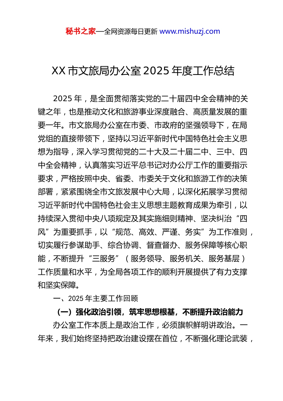 秘书之家—全网资源每日更新 www.mishuzj.comXX 市文旅局办公室 2025 年度工作总结2025 年,是全面贯彻落实党的二十届四中全会精神的关键之年,也是推动文化和旅游事业深度融合、高质量发展的重要一年。市文旅局办公室在市委、市政府的坚强领导下,在局党组的直接带领下,坚持以习近平新时代中国特色社会主义思想为指导,深入学习贯彻党的二十大及二十届二中、三中、四中全会精神,认真落实习近平总书记对办公厅工作的重要指示要求,严格按照中央、省委、市委关于文化和旅游工作的决策部署,紧紧围绕全市文旅发展中心大局,以深化拓展学习贯彻习近平新时代中国特色社会主义思想主题教育成果为牵引,以持续深入贯彻中央八项规定及其实施细则精神、坚决纠治“四风”为重要抓手,以“规范、高效、严谨、务实”为工作准则,切实履行参谋助手、综合协调、督查督办、服务保障等核心职能,不断提升“三服务”(服务领导、服务机关、服务基层)工作质量和水平,为全局各项工作的顺利开展提供了有力支撑和坚实保障。一、2025 年主要工作回顾(一)强化政治引领,筑牢思想根基,不断提升政治能力办公室工作本质上是政治工作,必须旗帜鲜明讲政治。一年来,我们始终坚持把政治建设摆在首位,不断强化理论武装,秘书之家—全网资源每日更新 www.mishuzj.com确保办公室工作始终沿着正确政治方向前进。1.深化理论学习教育,统一思想认识。将学习党的创新理论作为办公室会议、支部学习的“第一议题”,制定并严格执行年度学习计划。一是系统学习核心要义。组织办公室全体人员持续深入学习习近平新时代中国特色社会主义思想,重点研读《习近平谈治国理政》(第一至五卷),特别是习近平总书记关于文化建设、旅游发展、意识形态工作的重要论述,深刻领会其核心要义、精神实质、丰富内涵和实践要求。二是专题学习贯彻党的二十届四中全会精神。通过举办专题读书班、邀请专家辅导、开展交流研讨等多种形式,原原本本、逐字逐句学习全会公报、决定等重要文件,引导办公室干部深刻理解推进国家治理体系和治理能力现代化的重大意义、总体目标和重点任务,自觉将办公室工作置于国家治理大格局中思考和谋划,增强贯彻落实的思想自觉和行动自觉。三是扎实开展深入贯彻中央八项规定精神学习教育。将中央八项规定精神及其最新配套制度规定纳入常态化学习内容,组织观看警示教育片,通报违反八项规定精神典型案例,开展“转作风、树新风”主题讨论,引导办公室干部深刻认识作风建设的极端重要性,时刻绷紧纪律规矩这根弦,从小事小节做起,筑牢拒腐防变的思想防线。2.提升政治“三力”,做到“两个维护”。一是提高政治判断力。要求办公室干部善于从一般事务中发现政治问题,从秘书之家—全网资源每日更新 www.mishuzj.com苗头性、倾向性问题中感知政治风险,特别是在文稿起草、信息报送、舆情应对、活动策划等工作中,始终保持清醒的政治头脑,确保各项工作符合党的路线方针政策。二是提高政治领悟力。教育引导干部深刻领会党中央决策部署和上级指示要求的精神实质,准确把握市委、市政府和局党组的工作意图,做到知其然、知其所以然、知其所以必然,确保执行不偏向、不走样。三是提高政治执行力。将“两个维护”作为最高政治原则和根本政治规矩,体现在坚决贯彻落实党中央决策部署的行动上,体现在履职尽责、做好本职工作的实效上,体现在办公室干部的日常言行上,确保政令畅通、令行禁止。(二)聚焦中心大局,发挥参谋助手作用,服务科学决策办公室是局党组的“智囊团”和“参谋部”,我们始终围绕全市文旅发展大局和局党组中心工作,努力做到参在点子上、谋在关键处。1.高质量完成文稿起草工作。坚持把以文辅政作为办公室的核心能力来建设。一年来,紧紧围绕全市文旅工作会议、重大项目推进、上级调研汇报、年度工作总结计划等关键节点,牵头或参与起草了各类重要文件、领导讲话、工作报告、调研报告、政策文件、情况汇报等共计 XX 篇,约 XX 万字。在起草过程中,注重准确把握上级精神、紧密结合 XX 市文旅实际、充分反映基层呼声,努力提升文稿的思想性、指导性和可操作性。例如,在起草《X...