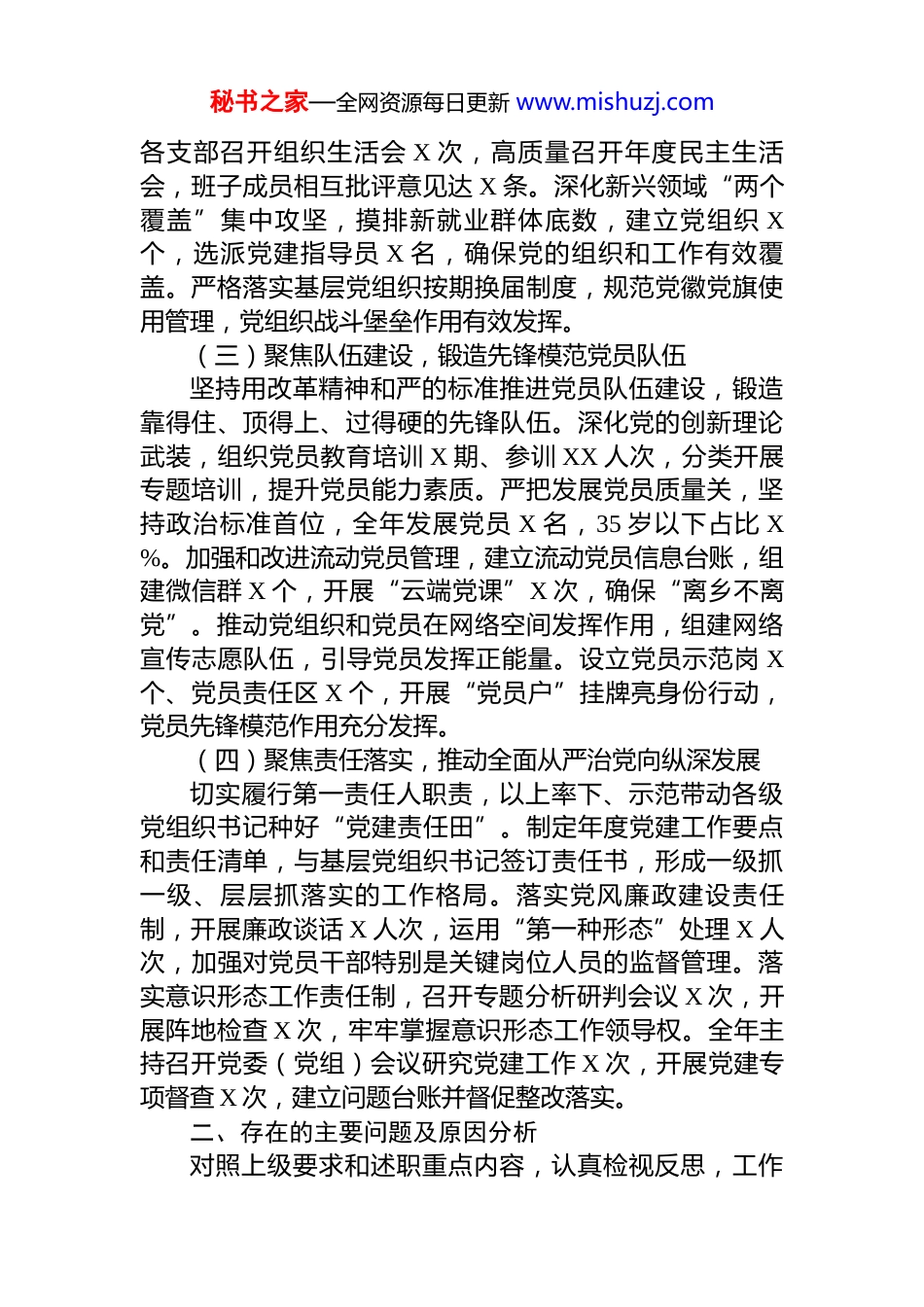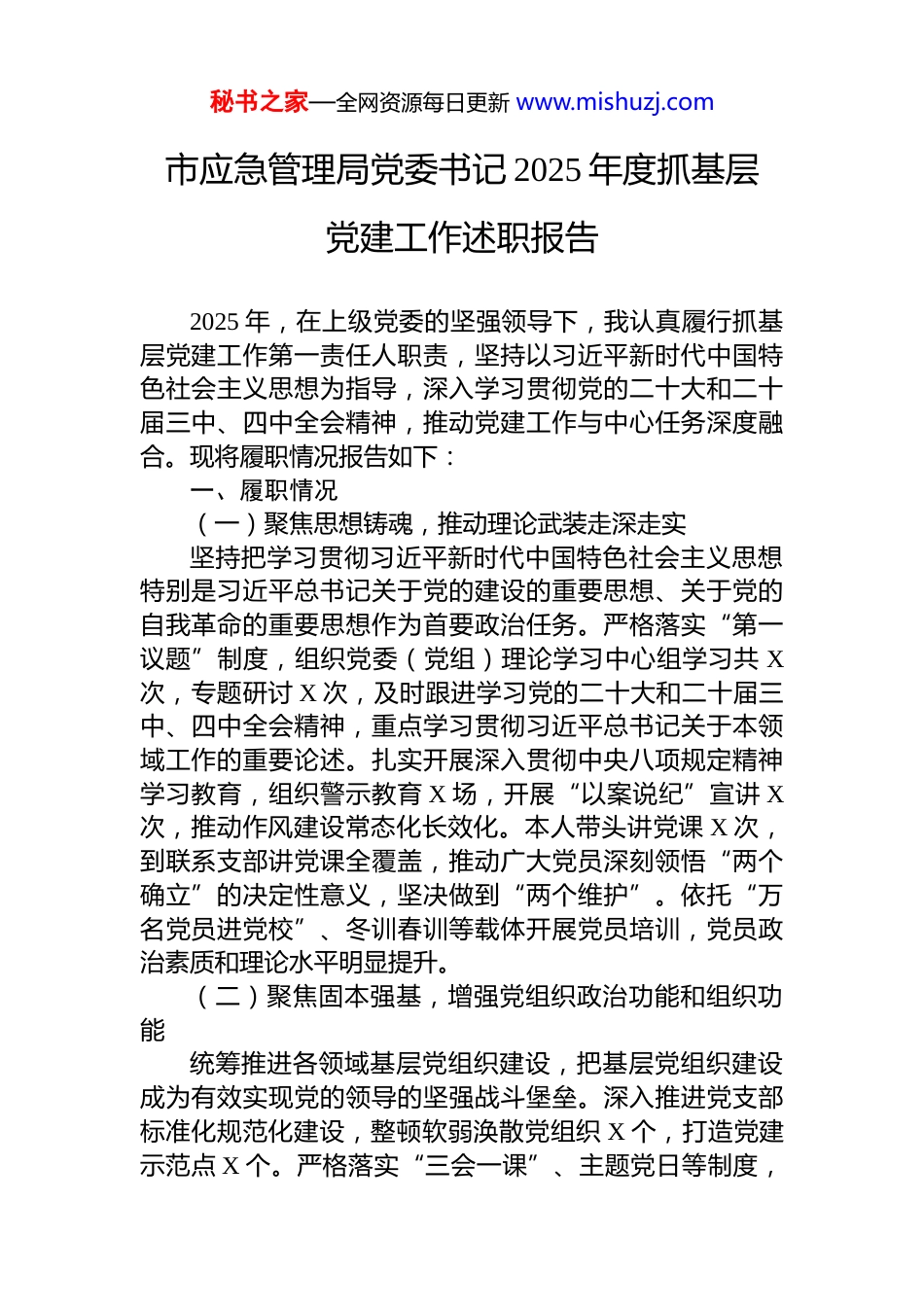 秘书之家—全网资源每日更新 www.mishuzj.com市应急管理局党委书记 2025 年度抓基层党建工作述职报告2025 年,在上级党委的坚强领导下,我认真履行抓基层党建工作第一责任人职责,坚持以习近平新时代中国特色社会主义思想为指导,深入学习贯彻党的二十大和二十届三中、四中全会精神,推动党建工作与中心任务深度融合。现将履职情况报告如下:一、履职情况(一)聚焦思想铸魂,推动理论武装走深走实坚持把学习贯彻习近平新时代中国特色社会主义思想特别是习近平总书记关于党的建设的重要思想、关于党的自我革命的重要思想作为首要政治任务。严格落实“第一议题”制度,组织党委(党组)理论学习中心组学习共 X次,专题研讨 X 次,及时跟进学习党的二十大和二十届三中、四中全会精神,重点学习贯彻习近平总书记关于本领域工作的重要论述。扎实开展深入贯彻中央八项规定精神学习教育,组织警示教育 X 场,开展“以案说纪”宣讲 X次,推动作风建设常态化长效化。本人带头讲党课 X 次,到联系支部讲党课全覆盖,推动广大党员深刻领悟“两个确立”的决定性意义,坚决做到“两个维护”。依托“万名党员进党校”、冬训春训等载体开展党员培训,党员政治素质和理论水平明显提升。(二)聚焦固本强基,增强党组织政治功能和组织功能统筹推进各领域基层党组织建设,把基层党组织建设成为有效实现党的领导的坚强战斗堡垒。深入推进党支部标准化规范化建设,整顿软弱涣散党组织 X 个,打造党建示范点 X 个。严格落实“三会一课”、主题党日等制度,秘书之家—全网资源每日更新 www.mishuzj.com各支部召开组织生活会 X 次,高质量召开年度民主生活会,班子成员相互批评意见达 X 条。深化新兴领域“两个覆盖”集中攻坚,摸排新就业群体底数,建立党组织 X个,选派党建指导员 X 名,确保党的组织和工作有效覆盖。严格落实基层党组织按期换届制度,规范党徽党旗使用管理,党组织战斗堡垒作用有效发挥。(三)聚焦队伍建设,锻造先锋模范党员队伍坚持用改革精神和严的标准推进党员队伍建设,锻造靠得住、顶得上、过得硬的先锋队伍。深化党的创新理论武装,组织党员教育培训 X 期、参训 XX 人次,分类开展专题培训,提升党员能力素质。严把发展党员质量关,坚持政治标准首位,全年发展党员 X 名,35 岁以下占比 X%。加强和改进流动党员管理,建立流动党员信息台账,组建微信群 X 个,开展“云端党课”X 次,确保“离乡不离党”。推动党组织和党员在网络空间发挥作用,组建网络宣传志愿队伍,引导党员发挥正能量。设立党员示范岗 X个、党员责任区 X 个,开展“党员户”挂牌亮身份行动,党员先锋模范作用充分发挥。(四)聚焦责任落实,推动全面从严治党向纵深发展切实履行第一责任人职责,以上率下、示范带动各级党组织书记种好“党建责任田”。制定年度党建工作要点和责任清单,与基层党组织书记签订责任书,形成一级抓一级、层层抓落实的工作格局。落实党风廉政建设责任制,开展廉政谈话 X 人次,运用“第一种形态”处理 X 人次,加强对党员干部特别是关键岗位人员的监督管理。落实意识形态工作责任制,召开专题分析研判会议 X 次,开展阵地检查 X 次,牢牢掌握意识形态工作领导权。全年主持召开党委(党组)会议研究党建工作 X 次,开展党建专项督查 X 次,建立问题台账并督促整改落实。二、存在的主要问题及原因分析对照上级要求和述职重点内容,认真检视反思,工作秘书之家—全网资源每日更新 www.mishuzj.com中还存在以下突出问题:(一)理论学习与推动实践结合不够紧密一是学习深度不够。对习近平总书记关于党的建设的重要思想、关于党的自我革命的重要思想学习还停留在一般了解层面,没有真正做到学深悟透、融会贯通。二是学习覆盖不全。深入贯彻中央八项规定精神学习教育向基层延伸不够,部分党员参学率不高,对作风建设常态化长效化要求理解不够深入。三是学用转化不足。理论学习对指导工作实践的作用发挥不够充分,存在学用“两张皮”现象。(二)各领域党组织建设发展不够均衡一是基层党组织建设质量参差不齐。个别党支部政治功能和组...