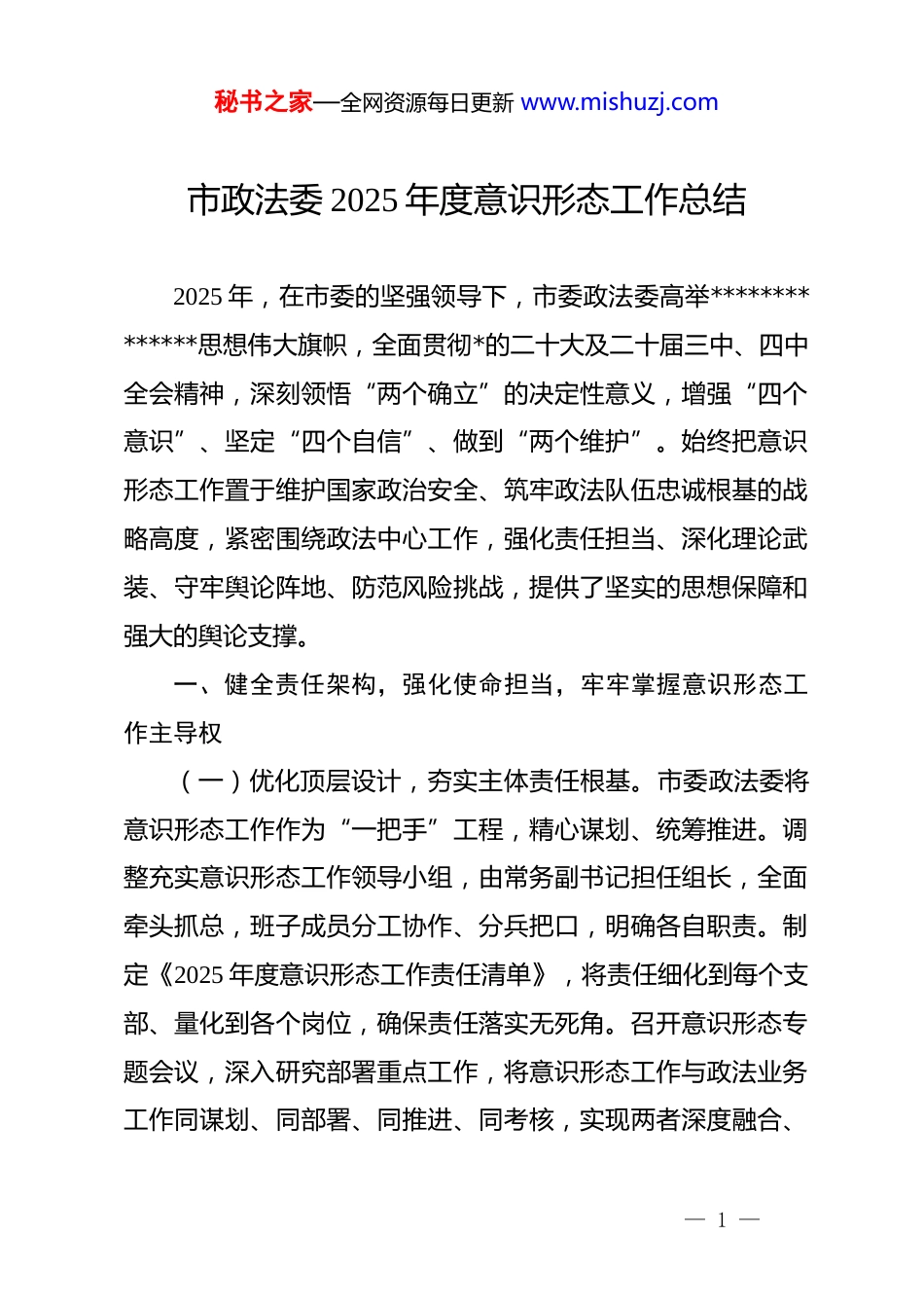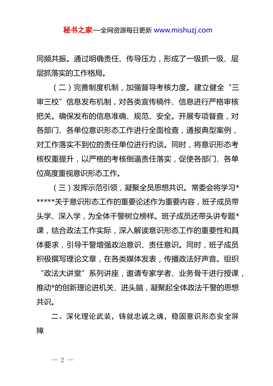 秘书之家—全网资源每日更新 www.mishuzj.com市政法委 2025 年度意识形态工作总结2025 年,在市委的坚强领导下,市委政法委高举**************思想伟大旗帜,全面贯彻*的二十大及二十届三中、四中全会精神,深刻领悟“两个确立”的决定性意义,增强“四个意识”、坚定“四个自信”、做到“两个维护”。始终把意识形态工作置于维护国家政治安全、筑牢政法队伍忠诚根基的战略高度,紧密围绕政法中心工作,强化责任担当、深化理论武装、守牢舆论阵地、防范风险挑战,提供了坚实的思想保障和强大的舆论支撑。一、健全责任架构,强化使命担当,牢牢掌握意识形态工作主导权(一)优化顶层设计,夯实主体责任根基。市委政法委将意识形态工作作为“一把手”工程,精心谋划、统筹推进。调整充实意识形态工作领导小组,由常务副书记担任组长,全面牵头抓总,班子成员分工协作、分兵把口,明确各自职责。制定《2025 年度意识形态工作责任清单》,将责任细化到每个支部、量化到各个岗位,确保责任落实无死角。召开意识形态专题会议,深入研究部署重点工作,将意识形态工作与政法业务工作同谋划、同部署、同推进、同考核,实现两者深度融合、— 1 —秘书之家—全网资源每日更新 www.mishuzj.com同频共振。通过明确责任、传导压力,形成了一级抓一级、层层抓落实的工作格局。(二)完善制度机制,加强督导考核力度。建立健全“三审三校”信息发布机制,对各类宣传稿件、信息进行严格审核把关。确保发布的信息准确、规范、安全。开展专项督查,对各部门、各单位意识形态工作进行全面检查,通报典型案例,对工作落实不到位的责任单位进行约谈。同时,将意识形态考核权重提升,以严格的考核倒逼责任落实,促使各部门、各单位高度重视意识形态工作。(三)发挥示范引领,凝聚全员思想共识。常委会将学习******关于意识形态工作的重要论述作为重要内容,班子成员带头学、深入学,为全体干警树立榜样。班子成员还带头讲专题*课,结合政法工作实际,深入解读意识形态工作的重要性和具体要求,引导干警增强政治意识、责任意识。同时,班子成员积极撰写理论文章,在各类媒体发表,传播政法好声音。组织“政法大讲堂”系列讲座,邀请专家学者、业务骨干进行授课,推动*的创新理论进机关、进头脑,凝聚起全体政法干警的思想共识。二、深化理论武装,铸就忠诚之魂,稳固意识形态安全屏障— 2 —秘书之家—全网资源每日更新 www.mishuzj.com(一)聚焦“关键少数”,强化政治素养锤炼。严格落实“第一议题”制度,将学习******重要讲话精神作为每次会议的首要内容,确保政法干警始终在思想上、政治上、行动上同以***同志为核心的*中央保持高度一致。围绕******重要讲话精神开展专题研讨,引导“关键少数”深入思考、学深悟透。组织“沿着***足迹看变化”实地研学活动,分批赴红色教育基地参观学习,让政法干警亲身感受*的光辉历史和伟大成就,增强政治认同和情感认同。举办“政法姓*”主题演讲比赛,激发政法干警的政治热情和忠诚意识,进一步坚定理想信念。(二)创新学习模式,激发队伍奋进活力。打造“线上线下双课堂”学习模式,满足干警多样化学习需求。线上开通“微*课”专栏,定期推送学习视频[x]期,内容涵盖*的理论、政策法规、政法业务等方面,方便干警利用碎片化时间进行学习。线下开展“书香政法”读书活动,组建青年理论学习小组,鼓励青年干警多读书、读好书,提升综合素质。举办辩论赛、知识竞赛,激发干警学习的积极性和主动性,形成“比学赶超”的浓厚氛围。通过创新学习形式,提高了学习效果,增强了队伍的凝聚力和战斗力。(三)注重成果转化,服务政法实战需求。围绕“市域社会治理现代化”“防范化解重大风险”等政法工作重点课题,— 3 —秘书之家—全网资源每日更新 www.mishuzj.com深入基层、深入实际,了解情况、发现问题。为政法工作决策提供了有力参考。建立“理论+实践”转化机制,将理论学习成果应用到实际工作中,推动“枫桥经验”本地化实践。通过借鉴“枫桥经验”,创新工作方法,有效维护了社会稳定,提升了政法工作的效能。三、坚守舆论阵地,弘扬法治正气,...