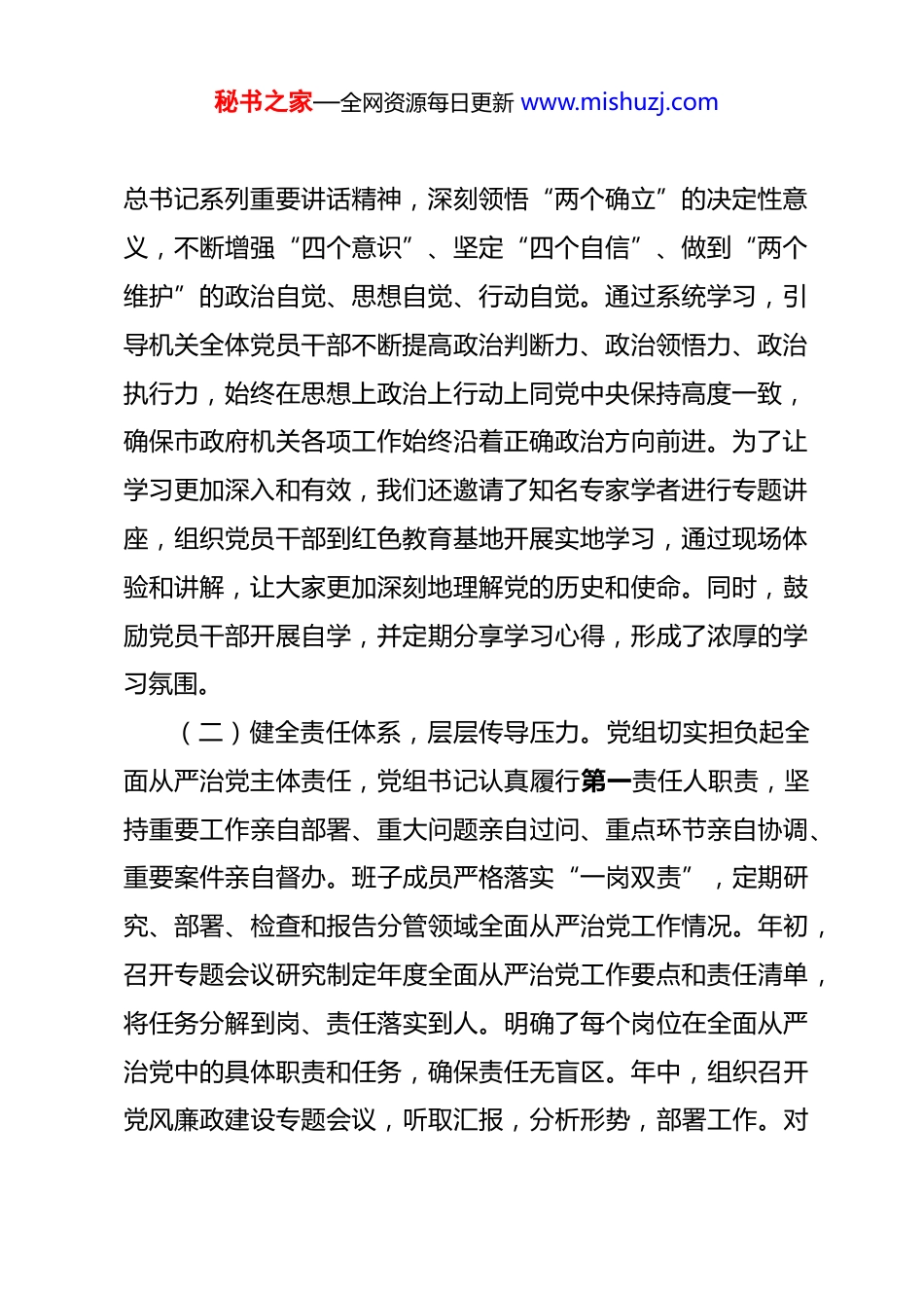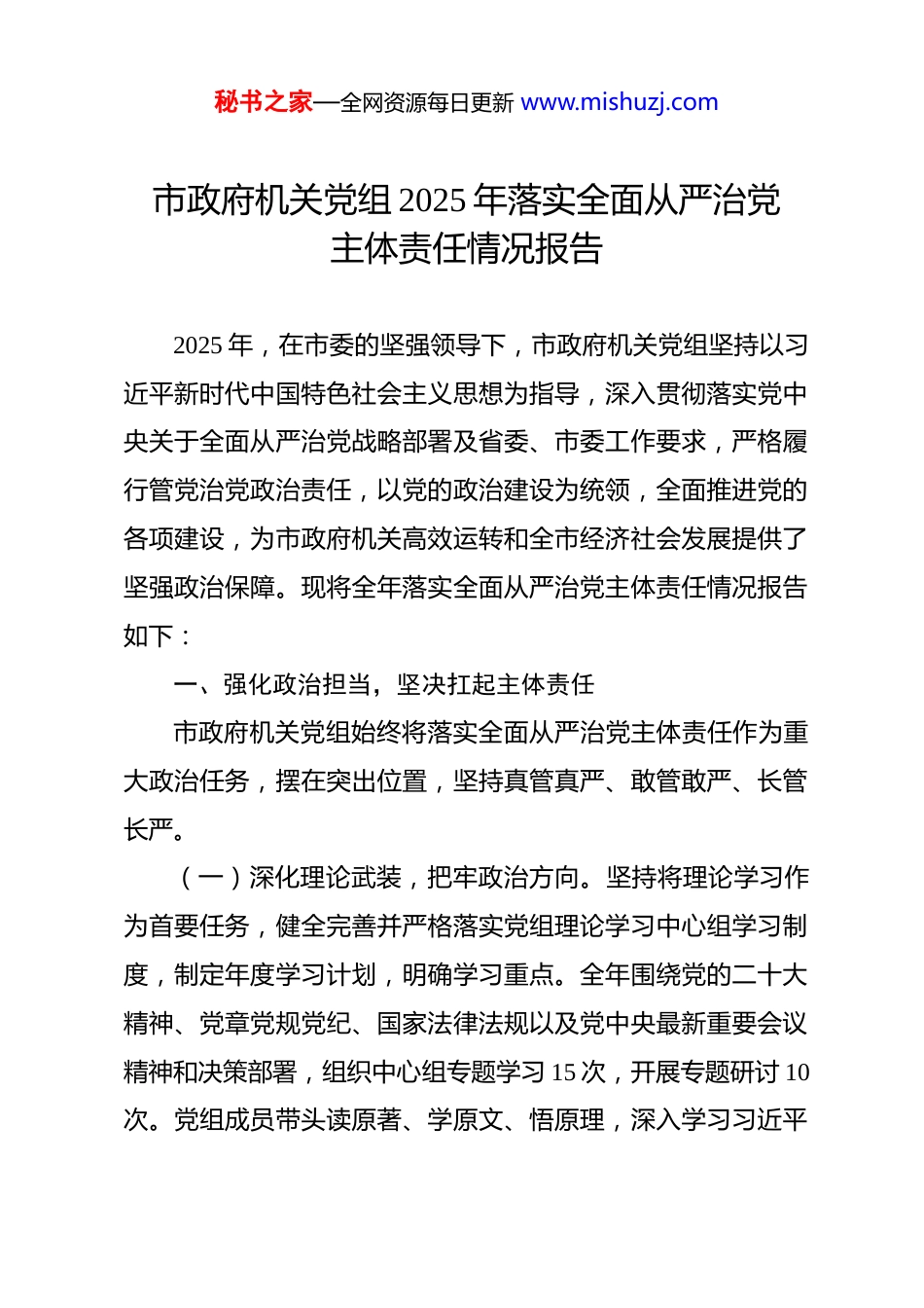 秘书之家—全网资源每日更新 www.mishuzj.com市政府机关党组 2025 年落实全面从严治党主体责任情况报告 2025 年,在市委的坚强领导下,市政府机关党组坚持以习近平新时代中国特色社会主义思想为指导,深入贯彻落实党中央关于全面从严治党战略部署及省委、市委工作要求,严格履行管党治党政治责任,以党的政治建设为统领,全面推进党的各项建设,为市政府机关高效运转和全市经济社会发展提供了坚强政治保障。现将全年落实全面从严治党主体责任情况报告如下:一、强化政治担当,坚决扛起主体责任市政府机关党组始终将落实全面从严治党主体责任作为重大政治任务,摆在突出位置,坚持真管真严、敢管敢严、长管长严。(一)深化理论武装,把牢政治方向。坚持将理论学习作为首要任务,健全完善并严格落实党组理论学习中心组学习制度,制定年度学习计划,明确学习重点。全年围绕党的二十大精神、党章党规党纪、国家法律法规以及党中央最新重要会议精神和决策部署,组织中心组专题学习 15 次,开展专题研讨 10次。党组成员带头读原著、学原文、悟原理,深入学习习近平秘书之家—全网资源每日更新 www.mishuzj.com总书记系列重要讲话精神,深刻领悟“两个确立”的决定性意义,不断增强“四个意识”、坚定“四个自信”、做到“两个维护”的政治自觉、思想自觉、行动自觉。通过系统学习,引导机关全体党员干部不断提高政治判断力、政治领悟力、政治执行力,始终在思想上政治上行动上同党中央保持高度一致,确保市政府机关各项工作始终沿着正确政治方向前进。为了让学习更加深入和有效,我们还邀请了知名专家学者进行专题讲座,组织党员干部到红色教育基地开展实地学习,通过现场体验和讲解,让大家更加深刻地理解党的历史和使命。同时,鼓励党员干部开展自学,并定期分享学习心得,形成了浓厚的学习氛围。(二)健全责任体系,层层传导压力。党组切实担负起全面从严治党主体责任,党组书记认真履行第一责任人职责,坚持重要工作亲自部署、重大问题亲自过问、重点环节亲自协调、重要案件亲自督办。班子成员严格落实“一岗双责”,定期研究、部署、检查和报告分管领域全面从严治党工作情况。年初,召开专题会议研究制定年度全面从严治党工作要点和责任清单,将任务分解到岗、责任落实到人。明确了每个岗位在全面从严治党中的具体职责和任务,确保责任无盲区。年中,组织召开党风廉政建设专题会议,听取汇报,分析形势,部署工作。对秘书之家—全网资源每日更新 www.mishuzj.com上半年的工作进行总结和回顾,查找存在的问题和不足,并制定相应的整改措施。年末,结合年度考核,对机关各党支部落实全面从严治党责任情况进行检查考评。通过签订责任书、开展廉政谈话、听取述职述廉等方式,将压力层层传导至各科室、各支部和每位党员干部,构建起横向到边、纵向到底的责任落实网络。年初,党组书记与班子成员、班子成员与分管科室负责人分别签订党风廉政建设责任书,明确了各自的责任和目标。定期开展廉政谈话,了解党员干部的思想动态和工作情况,及时发现和解决问题。在年末的述职述廉会议上,党员干部对自己一年来落实全面从严治党责任的情况进行汇报,接受组织和群众的监督。(三)严明政治纪律,确保政令畅通。始终把遵守党的政治纪律和政治规矩放在首位,教育引导党员干部自觉做政治上的“明白人”“老实人”。严格执行重大事项请示报告制度,确保市委各项决策部署在市政府机关不折不扣得到贯彻执行。对于涉及到重大项目、重要政策等事项,及时向市委请示报告,确保决策的科学性和合法性。加强对党中央重大决策部署和省委、市委工作要求落实情况的监督检查,聚焦重点领域和关键环节,确保政令畅通、令行禁止。成立了专项督查小组,定期对重点工作的落实情况进行检查和评估。对发现的问题及时进秘书之家—全网资源每日更新 www.mishuzj.com行整改,对违反纪律的行为进行严肃处理。坚决反对“七个有之”,旗帜鲜明地反对和抵制各种错误思潮和言行,维护机关风清气正的政治生态。在干部选拔任用、评先评优等工作中,严把政治关,确保干部队伍政治上绝对可靠。制定了严格的干部选拔任用...