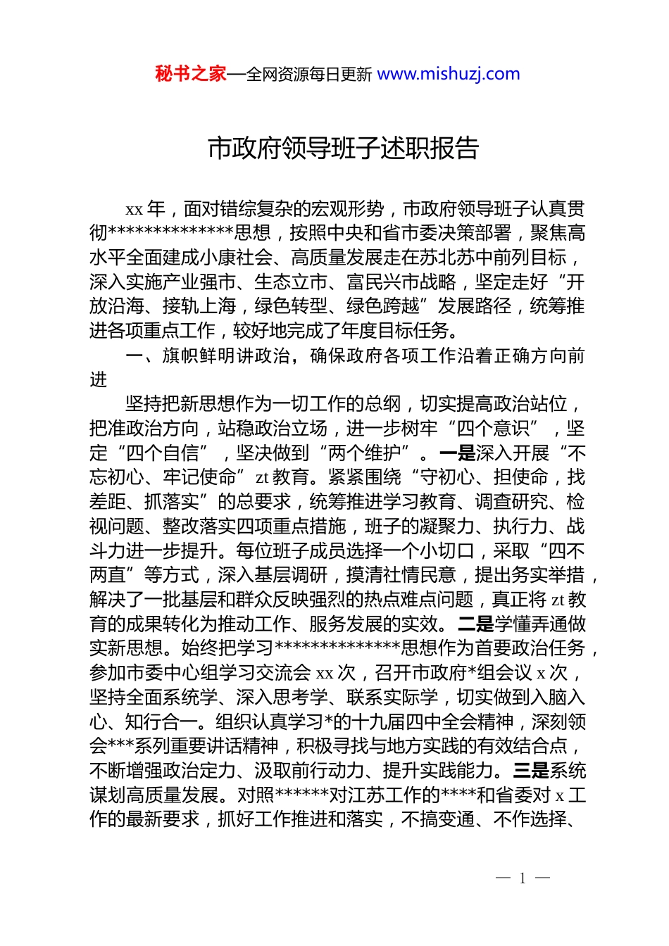 秘书之家—全网资源每日更新 www.mishuzj.com市政府领导班子述职报告xx 年,面对错综复杂的宏观形势,市政府领导班子认真贯彻**************思想,按照中央和省市委决策部署,聚焦高水平全面建成小康社会、高质量发展走在苏北苏中前列目标,深入实施产业强市、生态立市、富民兴市战略,坚定走好“开放沿海、接轨上海,绿色转型、绿色跨越”发展路径,统筹推进各项重点工作,较好地完成了年度目标任务。一、旗帜鲜明讲政治,确保政府各项工作沿着正确方向前进坚持把新思想作为一切工作的总纲,切实提高政治站位,把准政治方向,站稳政治立场,进一步树牢“四个意识”,坚定“四个自信”,坚决做到“两个维护”。一是深入开展“不忘初心、牢记使命”zt 教育。紧紧围绕“守初心、担使命,找差距、抓落实”的总要求,统筹推进学习教育、调查研究、检视问题、整改落实四项重点措施,班子的凝聚力、执行力、战斗力进一步提升。每位班子成员选择一个小切口,采取“四不两直”等方式,深入基层调研,摸清社情民意,提出务实举措,解决了一批基层和群众反映强烈的热点难点问题,真正将 zt 教育的成果转化为推动工作、服务发展的实效。二是学懂弄通做实新思想。始终把学习**************思想作为首要政治任务,参加市委中心组学习交流会 xx 次,召开市政府*组会议 x 次,坚持全面系统学、深入思考学、联系实际学,切实做到入脑入心、知行合一。组织认真学习*的十九届四中全会精神,深刻领会***系列重要讲话精神,积极寻找与地方实践的有效结合点,不断增强政治定力、汲取前行动力、提升实践能力。三是系统谋划高质量发展。对照******对江苏工作的****和省委对 x 工作的最新要求,抓好工作推进和落实,不搞变通、不作选择、— 1 —秘书之家—全网资源每日更新 www.mishuzj.com不打折扣。自觉在市委领导下开展工作,定期向市委报告工作,重大事项及时报市委研究决定。积极抢抓“一带一路”、长江经济带、长三角一体化、xx 生态经济带发展、x 产业园建设等重大战略机遇,从全局高度审视和谋划各项工作,加快把机遇优势转化为现实竞争力。二、深入践行新发展理念,奋力推动经济社会高质量发展坚持稳中求进工作总基调,深化经济体制改革,改进经济工作方式,坚持干实事、报实数、讲实情,预计全市地区生产总值增长 x.x%,固定资产投资增长 x.x%,社会消费品零售总额增长 x%,一般公共预算收入 xxx 亿元,与去年持平,“十三五”规划主要指标进度符合预期,全面建成小康社会取得新的进展。一是坚持创新发展,新旧动能加快转换。更大力度推动产业转型升级,狠抓重大项目建设,“两重一实”项目预计完成投资 xxxx 亿元,宝钢等一批重大项目加快推进。战略性新兴产业逐步壮大,新能源、电子信息产业开票销售均突破 xxx 亿元。传统产业提档升级,实施千万元以上技改项目 xxx 个。实施创新驱动战略,高新技术企业总数超 xxxx 家,全社会研发投入占 gdp 比重 x.x%。现代服务业快速发展,服务业增加值占gdp 比重达到 xx%。现代农业提质增效,新建高标准农田 xx 万亩,新增设施农(渔)业 xx 万亩,新办规模农业龙头企业 xxx家。二是坚持协调发展,城市能级不断提升。牢固树立全市域理念,系统推进城乡统筹发展,同步实施老城更新和新城建设,不断提高城市首位度。优化中心城区布局,城市组团开发有序推进,城北地区改造全面启动。xx 高铁、高铁枢纽、高架三期同步通车,高架 brt 环线开通运营,镇村公交实现市域全覆盖。全市改造棚户区(危旧房)x.xx 万户、xxx 万平方米,其中市区 x.x 万户、xxx 万平方米。扎实推进全国文明城市创建,城市管理更加精细。深入实施乡村振兴战略,累计改善农民群众住房 x.x 万户,新改建农村公路 xxx.x 公里、桥梁 xxx 座。三是坚— 2 —秘书之家—全网资源每日更新 www.mishuzj.com持绿色发展,生态品牌充分彰显。xx 候鸟栖息地列入《世界遗产名录》,国际湿地城市创建通过国家林草局现场评估验收。新增成片林 xx.x 万亩、改造既有林 xx 万亩,造林面积全省第一,提前一年完成百万亩生态防护林建设任务,创...