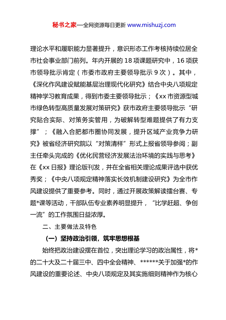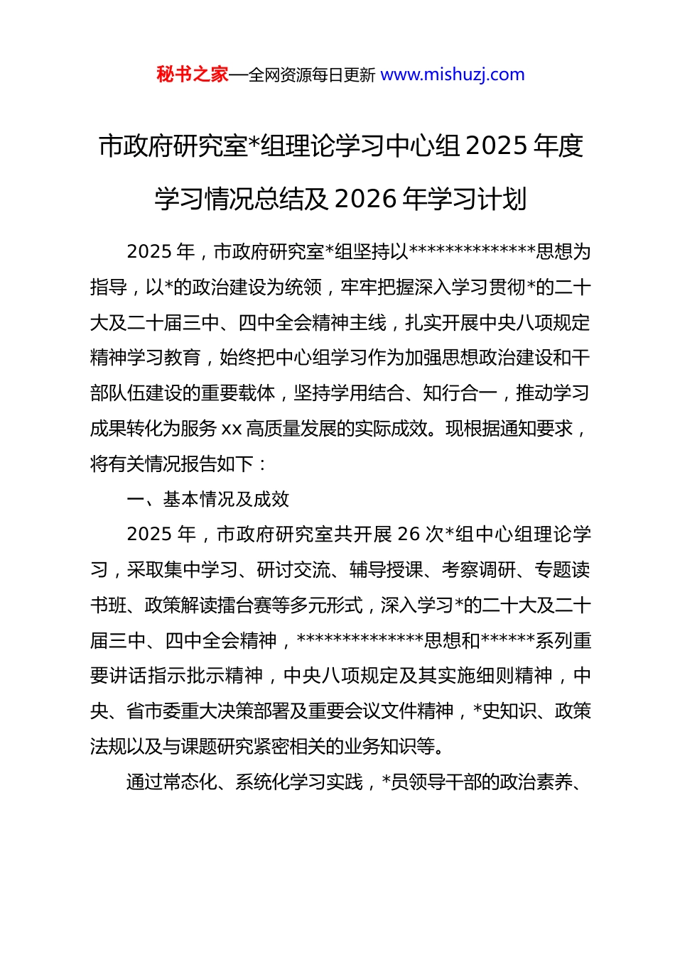 秘书之家—全网资源每日更新 www.mishuzj.com市政府研究室*组理论学习中心组 2025 年度学习情况总结及 2026 年学习计划2025 年,市政府研究室*组坚持以**************思想为指导,以*的政治建设为统领,牢牢把握深入学习贯彻*的二十大及二十届三中、四中全会精神主线,扎实开展中央八项规定精神学习教育,始终把中心组学习作为加强思想政治建设和干部队伍建设的重要载体,坚持学用结合、知行合一,推动学习成果转化为服务 xx 高质量发展的实际成效。现根据通知要求,将有关情况报告如下:一、基本情况及成效2025 年,市政府研究室共开展 26 次*组中心组理论学习,采取集中学习、研讨交流、辅导授课、考察调研、专题读书班、政策解读擂台赛等多元形式,深入学习*的二十大及二十届三中、四中全会精神,**************思想和******系列重要讲话指示批示精神,中央八项规定及其实施细则精神,中央、省市委重大决策部署及重要会议文件精神,*史知识、政策法规以及与课题研究紧密相关的业务知识等。通过常态化、系统化学习实践,*员领导干部的政治素养、秘书之家—全网资源每日更新 www.mishuzj.com理论水平和履职能力显著提升,意识形态工作考核持续位居全市社会事业部门前列。年内开展的 18 项课题研究中,16 项获市领导批示肯定(市委市政府主要领导批示 9 次)。其中,《深化作风建设赋能基层治理现代化研究》结合中央八项规定精神学习教育成果,得到市委主要领导批示;《xx 市资源型城市绿色转型高质量发展对策研究》获市政府主要领导批示“研究贴合实际、对策务实管用,为破解转型难题提供了有力支撑”;《融入合肥都市圈协同发展,提升区域产业竞争力研究》被省经济研究院以“对策清样”形式上报省领导参阅;副主任牵头完成的《优化民营经济发展法治环境的实践与思考》在《xx 日报》理论版刊发,并在全省相关理论成果评选中获优秀奖;《中央八项规定精神落实长效机制建设研究》为全市作风建设提供了重要参考。同时,通过开展政策解读擂台赛、专题*课等活动,干部队伍专业素养明显提升,“比学赶超、争创一流”的工作氛围日益浓厚。二、主要做法及特色(一)坚持政治引领,筑牢思想根基始终把政治建设摆在首位,突出理论学习的政治属性,将*的二十大及二十届三中、四中全会精神、******关于加强*的作风建设的重要论述、中央八项规定及其实施细则精神作为核心秘书之家—全网资源每日更新 www.mishuzj.com学习内容,引导*员干部深刻领悟“两个确立”的决定性意义,增 强 “ 四 个 意 识 ” 、 坚 定 “ 四 个 自 信 ” 、 做 到 “ 两 个 维护”。2025 年重点组织学习了******在各地考察时的重要讲话、中央政治局集体学习精神、二十届四中全会公报等,通过专题研讨、实地走访、专家解读等方式,确保理论学习入脑入心、见行见效,推动思想和行动统一到*中央及省市委决策部署上来。(二)严格制度执行,规范学习流程一是精准制定计划。依据《中国共产**委(*组)理论学习中心组学习规则》,结合年度工作任务和省市委学习要求,制定 2025 年学习计划,明确学习专题、内容和责任分工,为学习开展提供制度保障。二是强化集中学习。坚持“第一议题”制度和“周例会”学习机制,每月安排 2 次集中学习,视情扩大至科以上干部或全体职工,全年参学率保持 98%以上。三是丰富学习形式。举办深入贯彻中央八项规定精神学习教育读书班,邀请市委*校教授开展专题*课,组织政策解读擂台赛,各科室负责人围绕中省重大政策开展解读、分管领导点评、全体干部量化打分;依托“学习强国”“安徽干部教育在线”等平台,推动个人自学常态化,鼓励*员干部读原文、悟原理,并积极参与全市专题培训、知识测试和竞赛活动。四是深化联动学秘书之家—全网资源每日更新 www.mishuzj.com习。结合支部“三会一课”,开展“送*课下基层”活动,与结对村两委共同学习《***谈治国理政》最新内容,推动学习教育向基层延伸。(三)聚焦中心工作,提升实践成效坚持“学习要精、学有所用”原则,推动理论学习与中心工作深度融合。一方面,结合服务市政府*组理论学习中心...