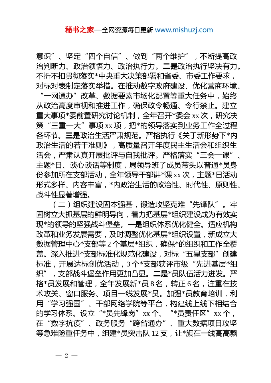 秘书之家—全网资源每日更新 www.mishuzj.com市政务和数据局 2025 年度 dj 工作总结及2026 年工作谋划在市委、市政府的坚强领导下,市政务和数据局*委坚持以**************思想为指导,深入学习贯彻落实*的二十大及历次全会精神,紧紧围绕新时代*的建设总要求,以*的政治建设为统领,以提升组织力为重点,以 dj 与业务深度融合为路径,全面加强*的各项建设,为推进政务服务和数据管理现代化提供了坚强政治保证。2025 年,全局上下凝心聚力、锐意进取,dj工作在守正创新中提质增效,引领政务和数据事业在数字化转型浪潮中乘风破浪、成果丰硕。为系统回顾过去一年工作,科学谋划未来一年任务,现将 2025 年度 dj 工作总结及 2026 年工作计划报告如下。一、2025 年度 dj 工作总结。dj 引领风帆劲,数智融合硕果丰2025 年,局*委坚决扛起管*治*政治责任,将 dj 工作置于全局工作的核心位置来抓,推动全面从严治*向纵深发展、向基层延伸,实现了*的建设与业务发展同频共振、互促共进。(一)政治建设举旗定向,筑牢对*忠诚“生命线”。始终将政治建设摆在首位,确保全局工作沿着正确方向前进。一是理论武装入脑入心。坚持把学习**************思想作为首要政治任务,严格落实“第一议题”制度,通过*委理论学习中心组学习、专题读书班、政治轮训等形式,组织深入学习*的二十大精神、******关于数字经济、网络强国、数字中国等重要论述和系列重要讲话精神。今年开展中心组学习共 xx 次,专题研讨 8 次,举办各类培训班 xx 期,覆盖*员干部 xx 余人次,引导全局*员干部深刻领悟“两个确立”的决定性意义,增强“四个— 1 —秘书之家—全网资源每日更新 www.mishuzj.com意识”、坚定“四个自信”、做到“两个维护”,不断提高政治判断力、政治领悟力、政治执行力。二是政治执行坚决有力。不折不扣贯彻落实*中央重大决策部署和省委、市委工作要求,对标对表制定落实举措。在推动数字政府建设、优化营商环境、“一网通办”改革、数据要素市场化配置等重大任务中,始终从政治高度审视和推进工作,确保政令畅通、令行禁止。建立重大事项*委前置研究讨论机制,全年召开*委会 xx 次,研究决策“三重一大”事项 xx 项,把*的领导落实到业务工作全过程各环节。三是政治生活严肃规范。严格执行《关于新形势下*内政治生活的若干准则》,高质量召开年度民主生活会和组织生活会,严肃认真开展批评与自我批评。严格落实“三会一课”、主题*日、谈心谈话等制度,局领导班子成员带头以普通*员身份参加所在支部活动,全年领导干部讲*课 xx 次,主题*日活动形式多样、内容丰富,*内政治生活的政治性、时代性、原则性、战斗性显著增强。(二)组织建设固本强基,锻造攻坚克难“先锋队”。牢固树立大抓基层的鲜明导向,着力把基层*组织建设成为有效实现*的领导的坚强战斗堡垒。一是组织体系优化健全。适应机构改革和业务发展需要,及时调整优化基层*组织设置,新成立大数据管理中心*支部等 2 个基层*组织,确保*的组织和工作全覆盖。深入推进*支部标准化规范化建设,对标“五星支部”创建标准,开展达标创优活动,3 个*支部获评市级“先进基层*组织”,支部战斗堡垒作用更加凸显。二是*员队伍活力迸发。严格*员发展和管理,全年发展新*员 8 名,转正 6 名,注重在技术攻关、窗口服务、项目一线发展*员。加强*员教育培训,利用“学习强国”、干部网络学院等平台,构建线上线下相结合的学习体系。设立“*员先锋岗”xx 个、“*员责任区”xx 个,在“数字抗疫”、政务服务“跨省通办”、重大数据项目攻坚等急难险重任务中,组建*员突击队 12 支,让*旗在一线高高飘— 2 —秘书之家—全网资源每日更新 www.mishuzj.com扬。三是干部人才支撑有力。坚持*管干部原则,树立重实干、重实绩的用人导向,选拔任用了一批政治强、业务精、作风正的年轻干部。实施“数智菁英”培养计划,与高校、科研院所合作开展专业培训,举办数据治理、网络安全等专题研修班,着力打造既懂 dj 又懂业务的复合型人才队伍。全年选派 xx 名骨干赴先进地区跟班学习,干部队伍的专业素...