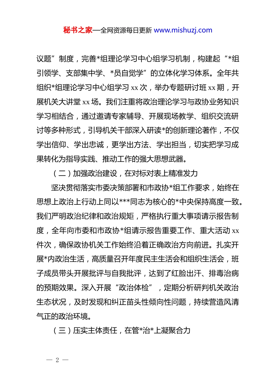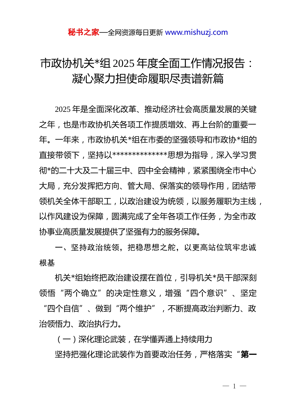 秘书之家—全网资源每日更新 www.mishuzj.com市政协机关*组 2025 年度全面工作情况报告:凝心聚力担使命履职尽责谱新篇2025 年是全面深化改革、推动经济社会高质量发展的关键之年,也是市政协机关各项工作提质增效、再上台阶的重要一年。一年来,市政协机关*组在市委的坚强领导和市政协*组的直接带领下,坚持以**************思想为指导,深入学习贯彻*的二十大及二十届三中、四中全会精神,紧紧围绕全市中心大局,充分发挥把方向、管大局、保落实的领导作用,团结带领机关全体干部职工,以政治建设为统领,以服务履职为主线,以作风建设为保障,圆满完成了全年各项工作任务,为全市政协事业高质量发展提供了坚强有力的服务保障。一、坚持政治统领,把稳思想之舵,以更高站位筑牢忠诚根基机关*组始终把政治建设摆在首位,引导机关*员干部深刻领悟“两个确立”的决定性意义,增强“四个意识”、坚定“四个自信”、做到“两个维护”,不断提高政治判断力、政治领悟力、政治执行力。(一)深化理论武装,在学懂弄通上持续用力坚持把强化理论武装作为首要政治任务,严格落实“第一— 1 —秘书之家—全网资源每日更新 www.mishuzj.com议题”制度,完善*组理论学习中心组学习机制,构建起“*组引领学、支部集中学、*员自觉学”的立体化学习体系。全年共组织*组理论学习中心组学习 xx 次,举办专题研讨班 xx 期,开展机关大讲堂 xx 场。我们注重将政治理论学习与政协业务知识学习相结合,通过邀请专家辅导、开展现场教学、组织交流研讨等多种形式,引导机关干部深入研读*的创新理论著作,不仅学出信仰、学出忠诚,更学出方法、学出担当,切实把学习成果转化为指导实践、推动工作的强大思想武器。(二)加强政治建设,在对标对表上精准发力坚决贯彻落实市委决策部署和市政协*组工作要求,始终在思想上政治上行动上同以***同志为核心的*中央保持高度一致。我们严明政治纪律和政治规矩,严格执行重大事项请示报告制度,全年向市委和市政协*组请示报告重要工作、重大活动 xx件次,确保政协机关工作始终沿着正确政治方向前进。扎实开展*内政治生活,高质量召开年度民主生活会和组织生活会,班子成员带头开展批评与自我批评,达到了红脸出汗、排毒治病的预期效果。深入开展“政治体检”,定期分析研判机关政治生态状况,及时发现和纠正苗头性倾向性问题,持续营造风清气正的政治环境。(三)压实主体责任,在管*治*上凝聚合力— 2 —秘书之家—全网资源每日更新 www.mishuzj.com牢固树立“抓好 dj 是最大政绩”的理念,机关*组书记认真履行第一责任人职责,班子成员严格落实“一岗双责”,形成一级抓一级、层层抓落实的 dj 工作格局。年初专题研究制定机关 dj 工作要点和责任清单,明确 xx 项重点任务,逐项分解落实到具体科室和责任人。加强对机关*委和各*支部的指导,深化“四强”*支部创建活动,严格落实“三会一课”、主题*日等制度,推动基层*组织全面进步、全面过硬。注重发挥*员先锋模范作用,设立*员示范岗、*员突击队,引导*员在服务保障政协履职、参与社区治理、助力乡村振兴等工作中冲锋在前、勇挑重担。二、紧扣中心大局,不仅献策之力,以更实举措助推高质量发展机关*组自觉把机关工作放到全市发展大局中去谋划和推进,聚焦市委市政府中心工作,统筹协调、周密安排,全力服务市政协各专委会和广大委员履行职能,助推各项决策部署落地见效。(一)服务协商议政,在提升质量上展现作为紧紧围绕市委确定的重大战略、重点工程和民生实事,精心制定年度协商计划,统筹安排专题议政性常委会议、专题协商会、界别协商会等协商活动 xx 场次。坚持“不调研不协商”— 3 —秘书之家—全网资源每日更新 www.mishuzj.com原则,在协商活动前,组织机关干部协助委员深入一线开展“沉浸式”调研,掌握第一手资料,确保协商建言言之有物、切中肯綮。在某重点产业园区建设专题协商中,我们服务委员深入 xx 家企业走访座谈,梳理出 xx 条具体问题,提出的对策建议被相关部门采纳落实,有效推动了园区营商环境优化。同时,注重协商成果转化,建立健全协商成果采纳、...